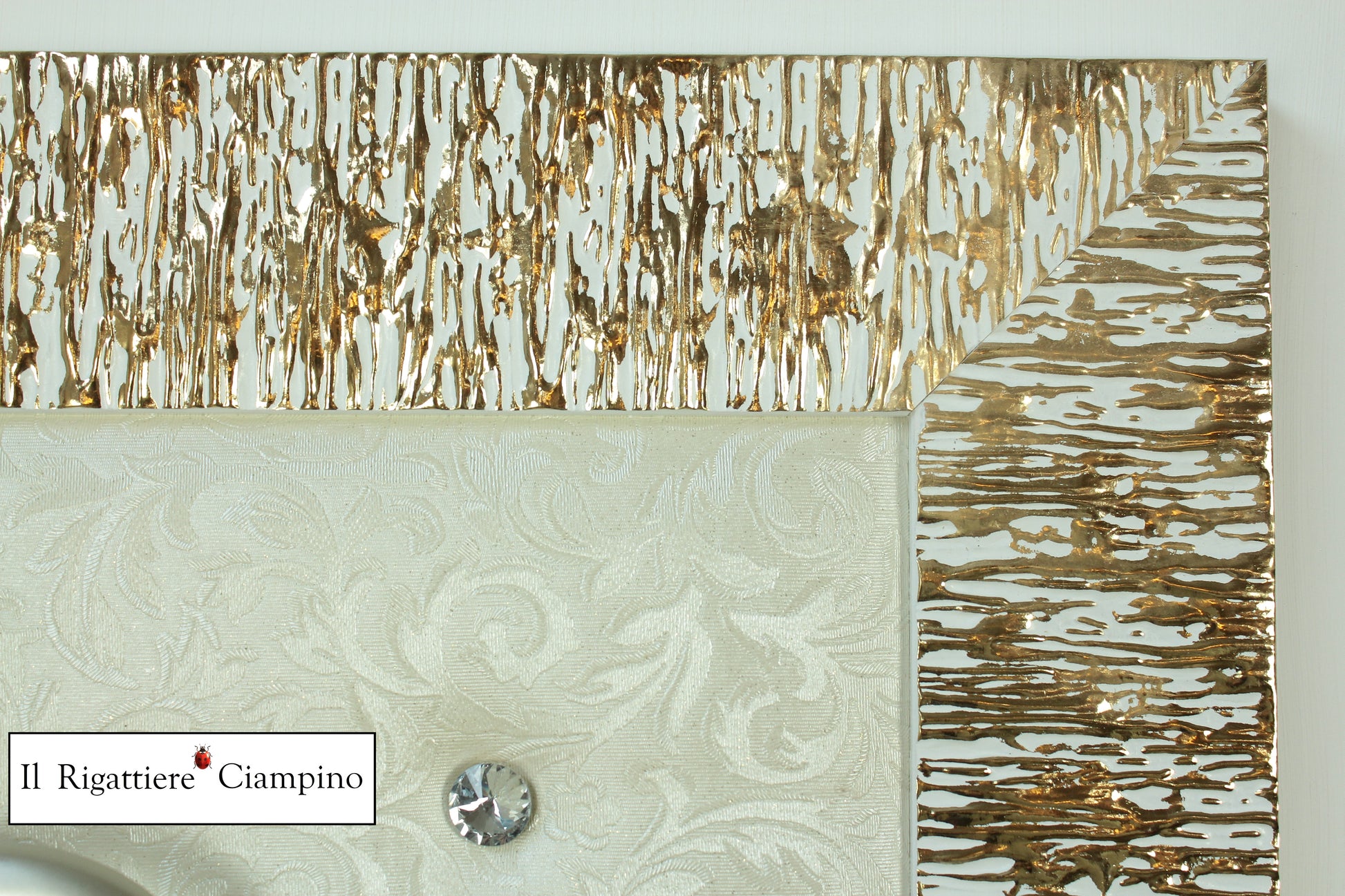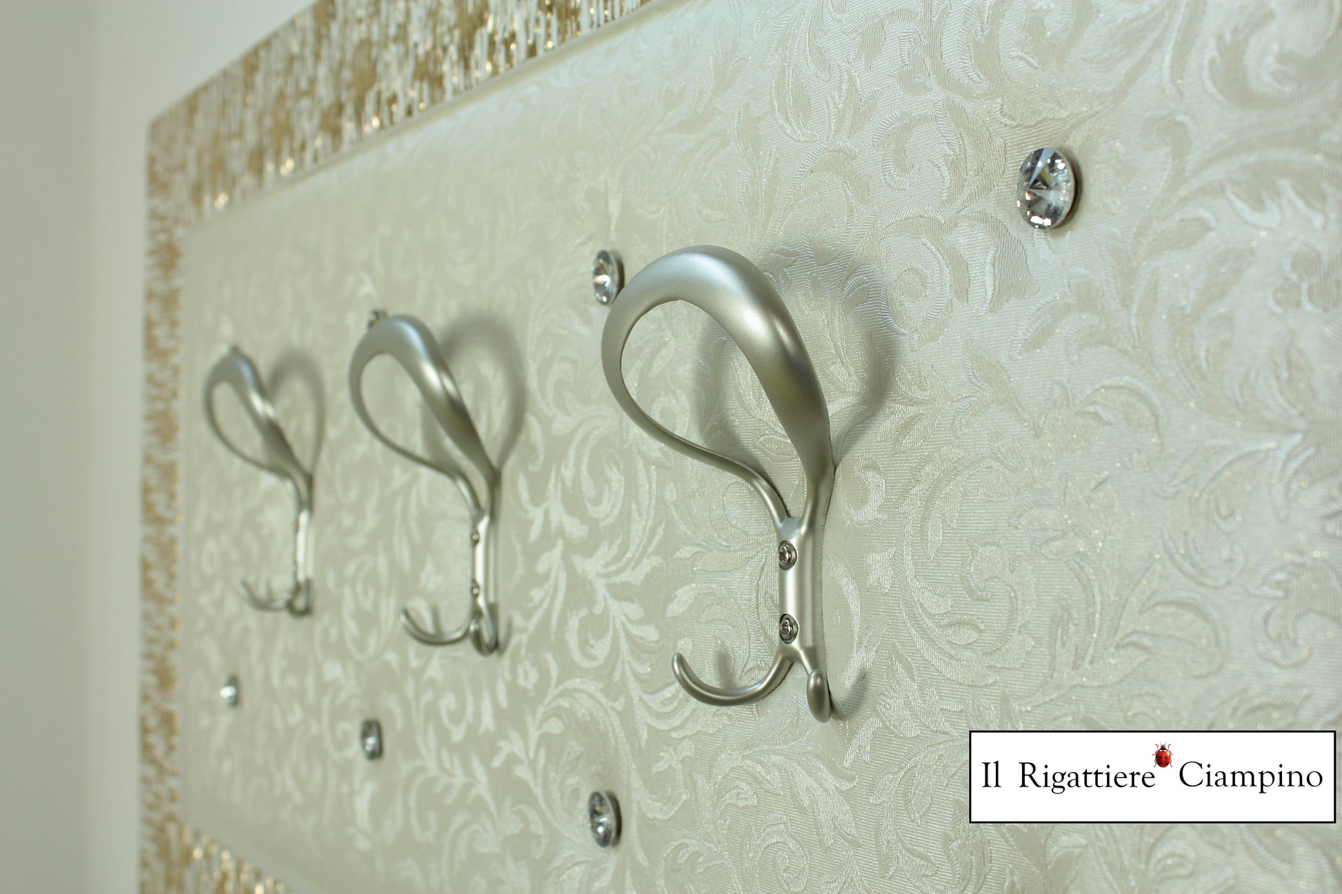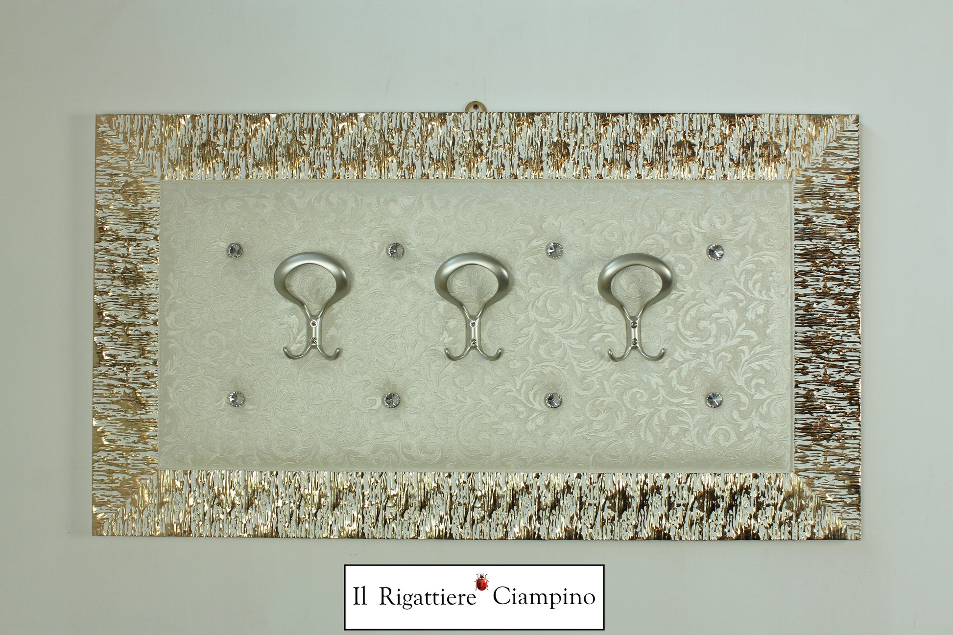 Il Rigattiere Ciampino propone la sua serie artigianale di appendiabiti da muro artigianali, questo incorniciato in una cornice bianca e oro da 8 cm, con bottoni Swarovski su ecopelle decorata avorio.