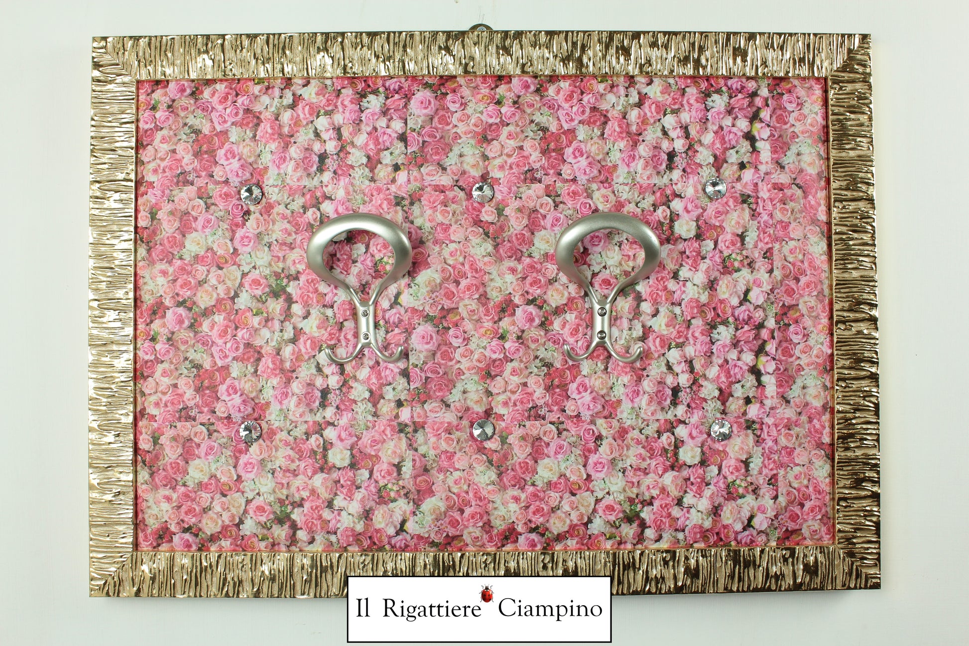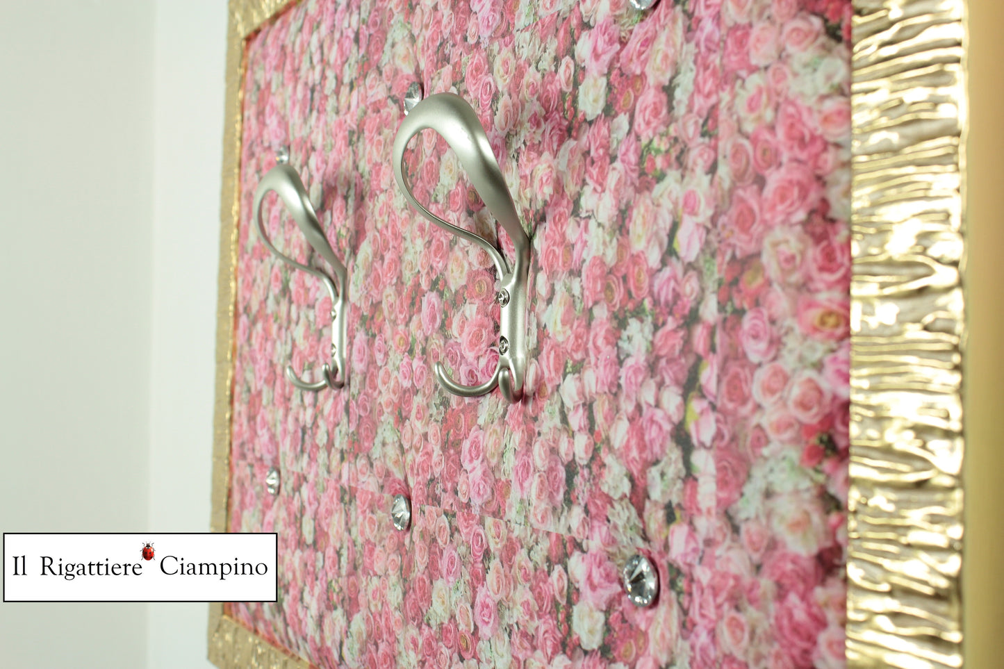 Il Rigattiere Ciampino propone la sua serie artigianale di appendiabiti da muro artigianali, questo incorniciato in una cornice oro da 4 cm, con bottoni Swarovski su ecopelle con trama floreale.