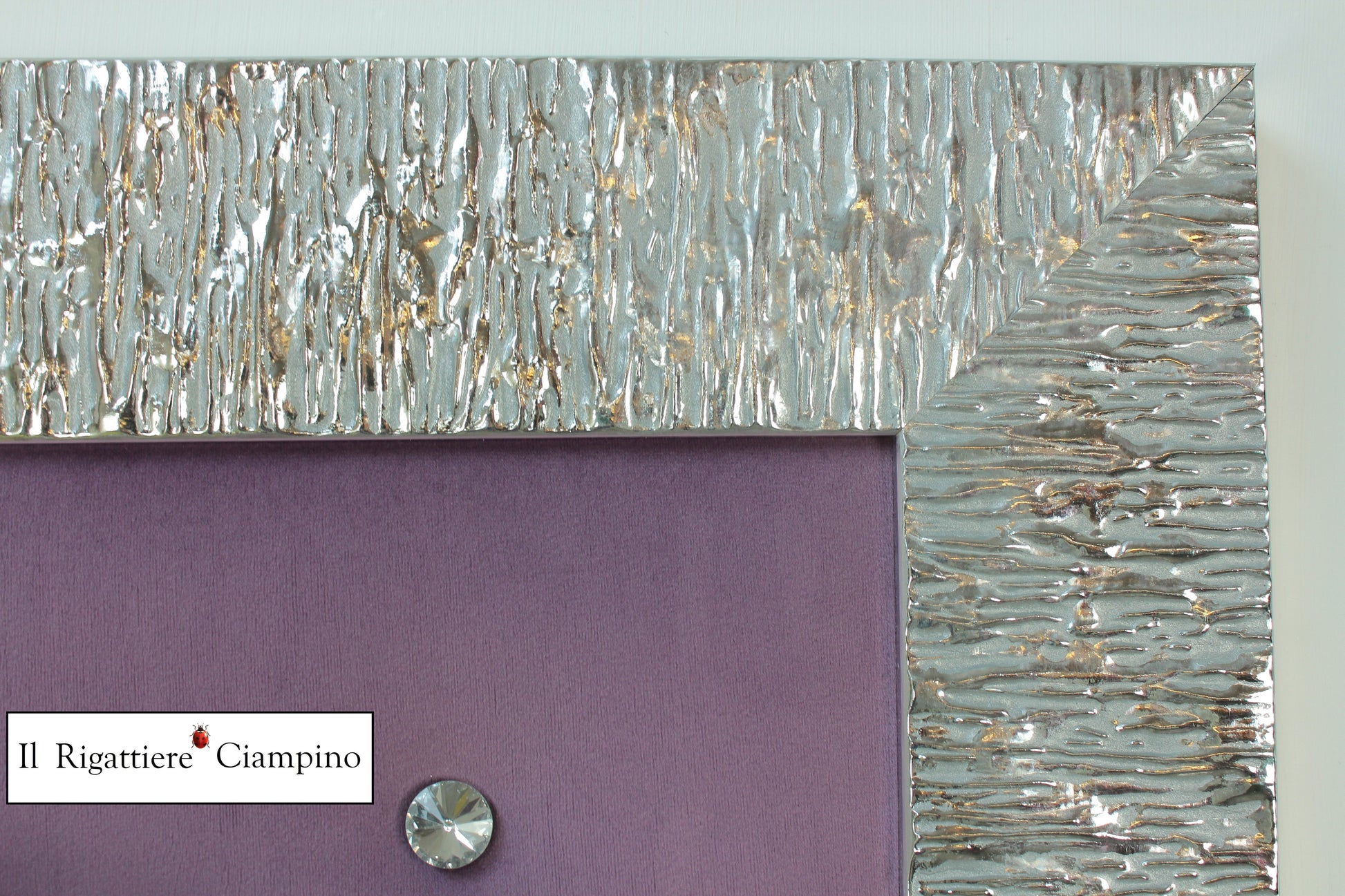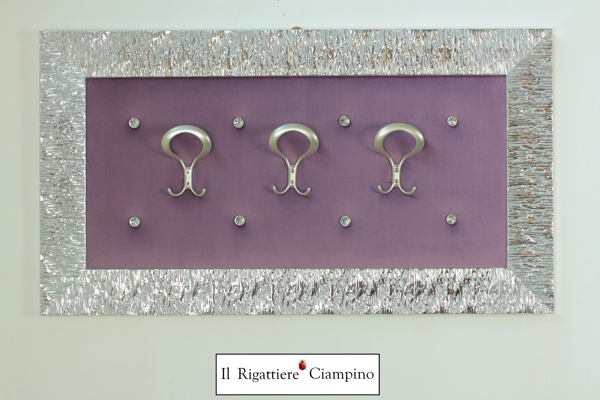 Il Rigattiere Ciampino propone la sua serie artigianale di appendiabiti da muro artigianali, questo incorniciato in una cornice bianca e argento da 8 cm, con bottoni Swarovski su velluto viola sfumatura ametista.