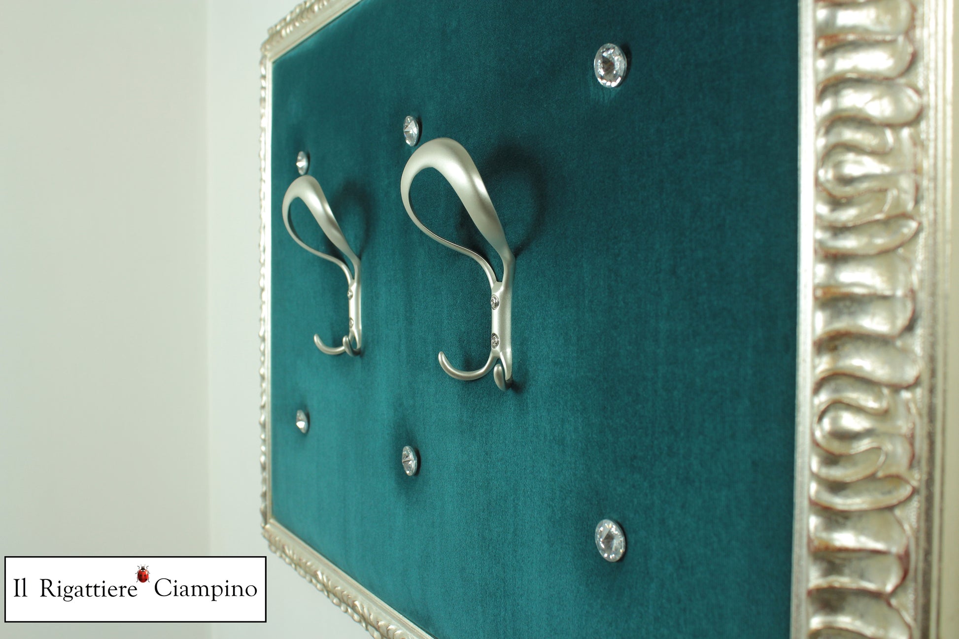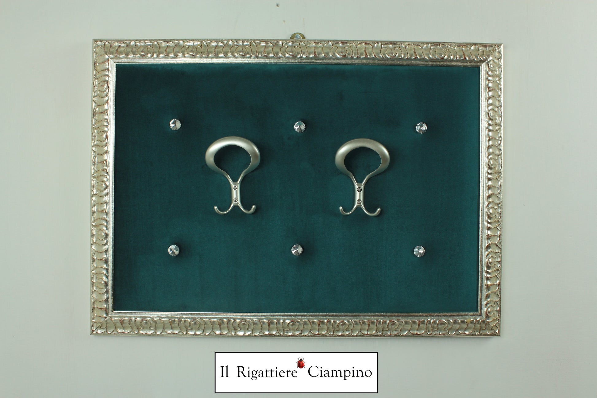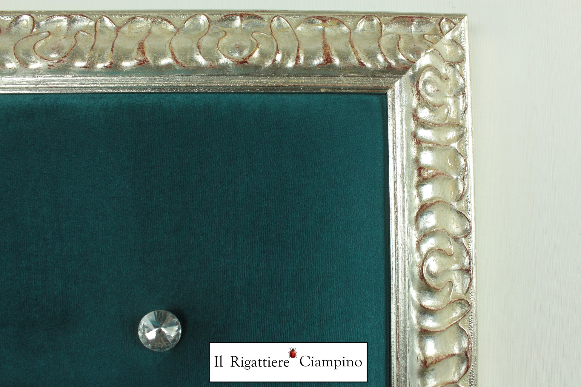 Il Rigattiere Ciampino propone la sua serie artigianale di appendiabiti da muro artigianali, questo incorniciato in una cornice argento da 4 cm, con bottoni Swarovski su velluto verde petrolio.