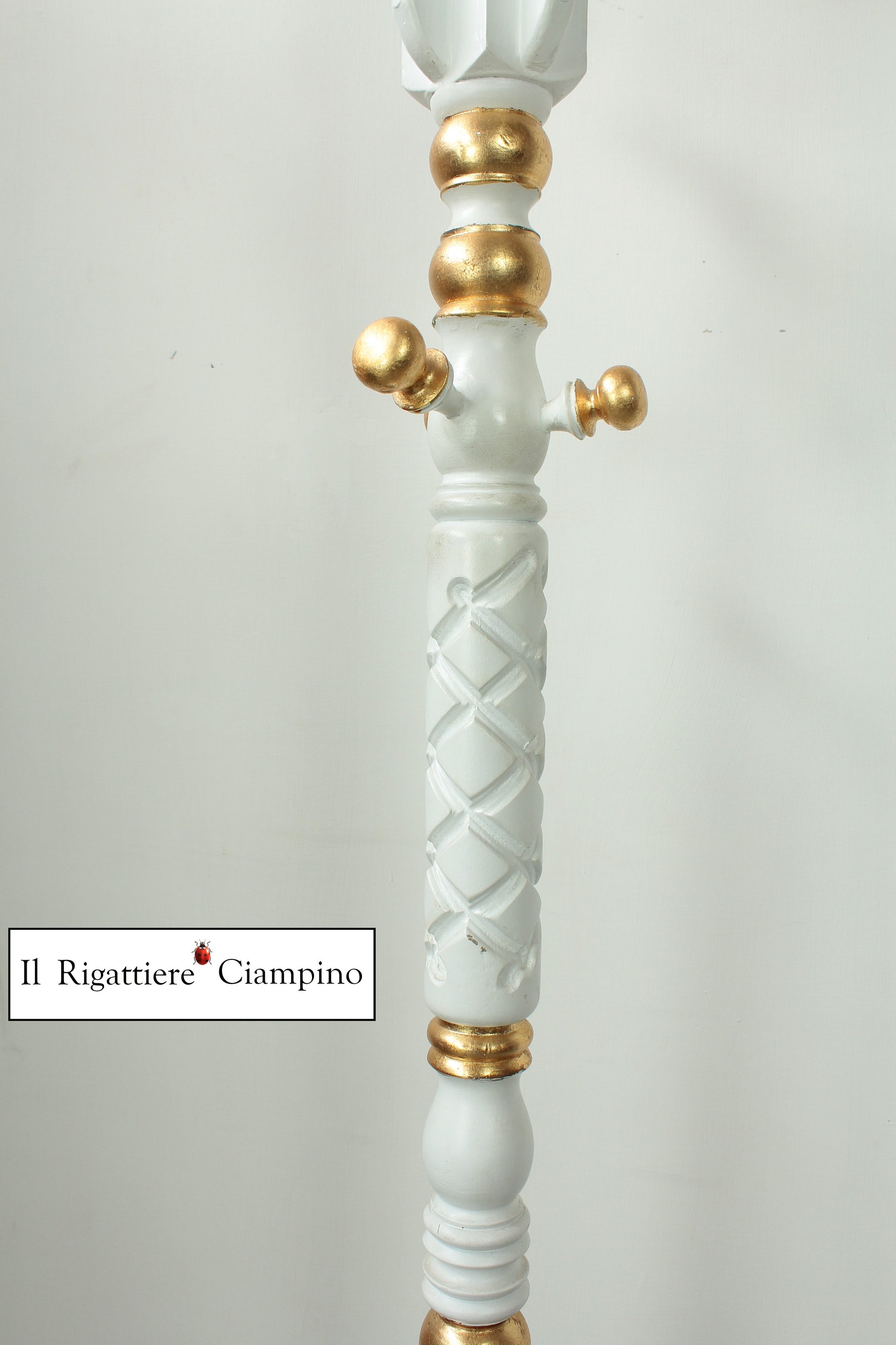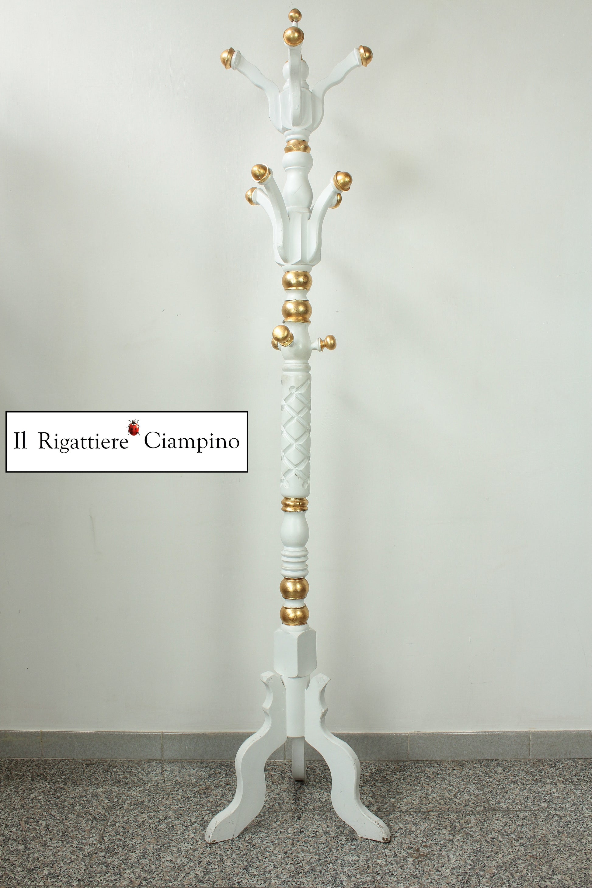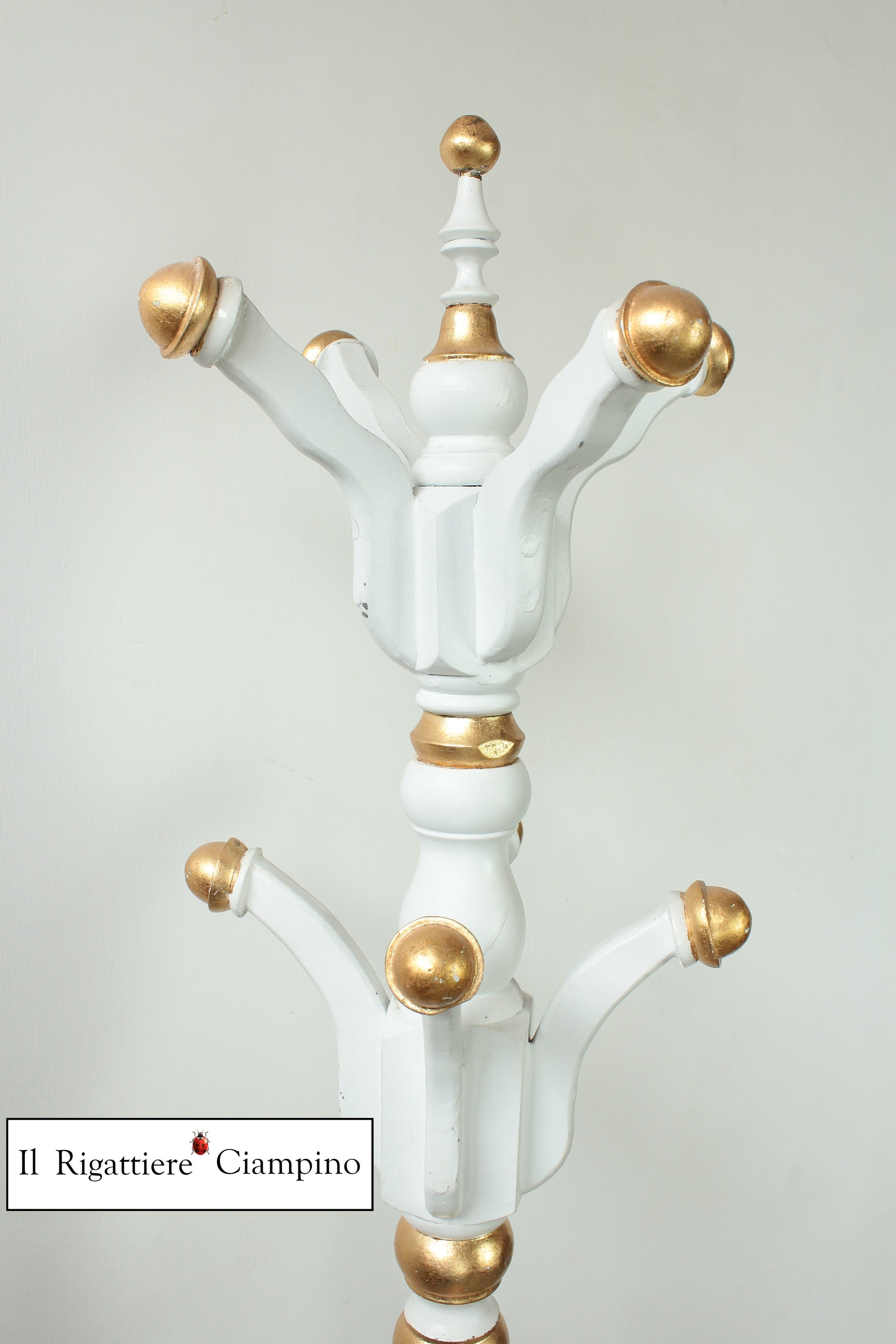 Il Rigattiere Ciampino propone un luminoso appendiabiti, bianco con dettagli oro, perfetto per donare un tocco regale al tuo ingresso.