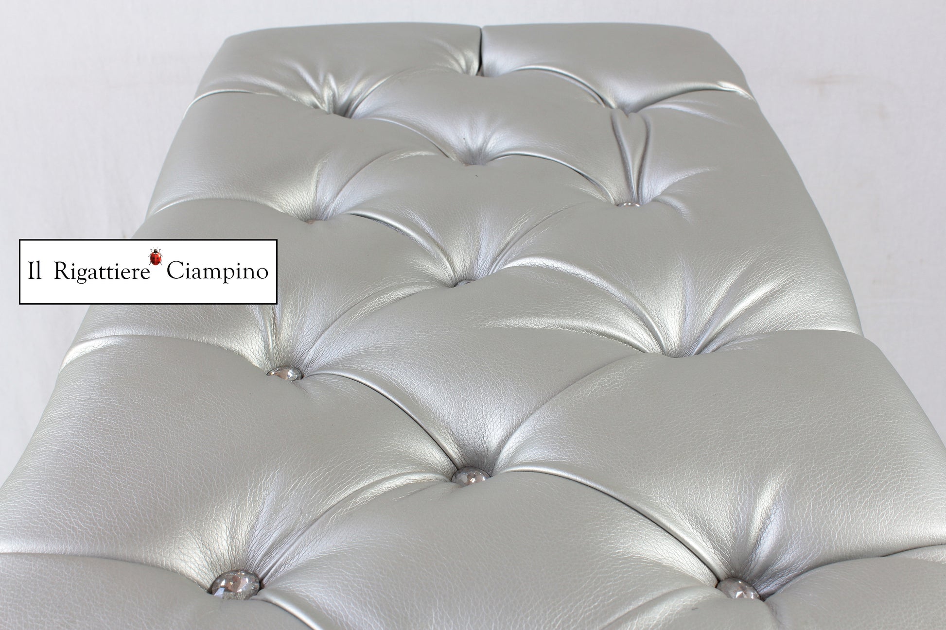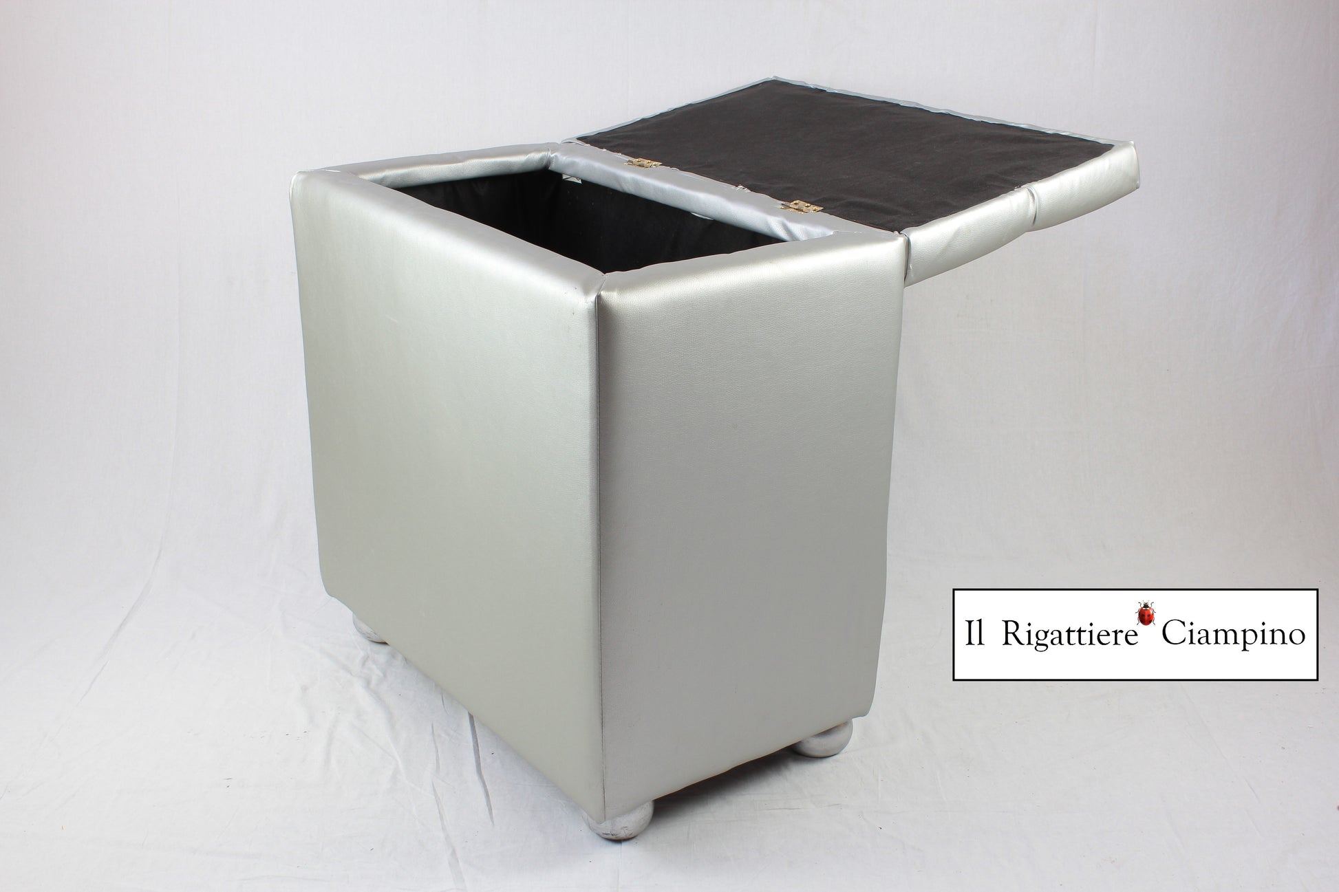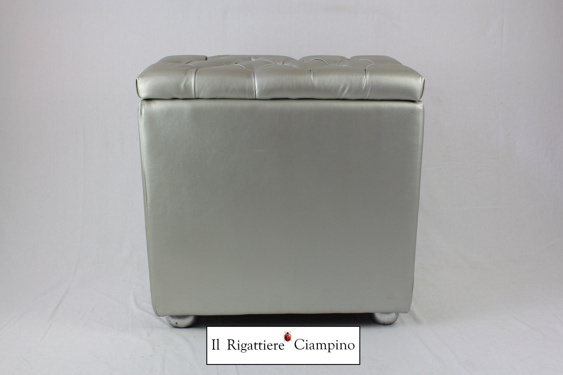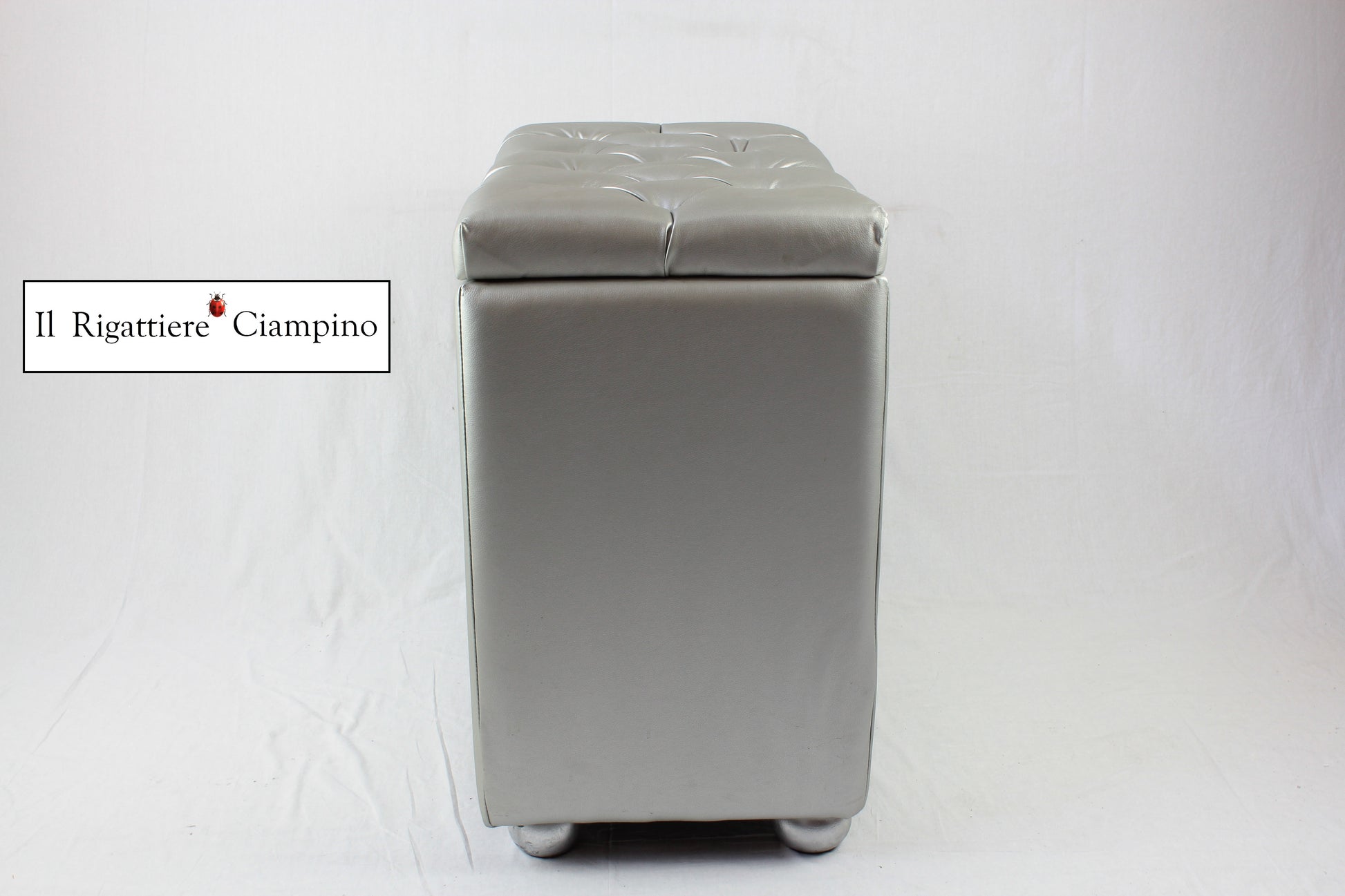 Il Rigattiere Ciampino propone un morbido Box Contenitore porta oggetti, in ecopelle colore argento con seduta trapuntata in capitonné. Per trovare spazio a oggetti d'occasione che non si vogliono tenere sparsi in casa e in vista, e per donare morbidezza e comfort alla camera.