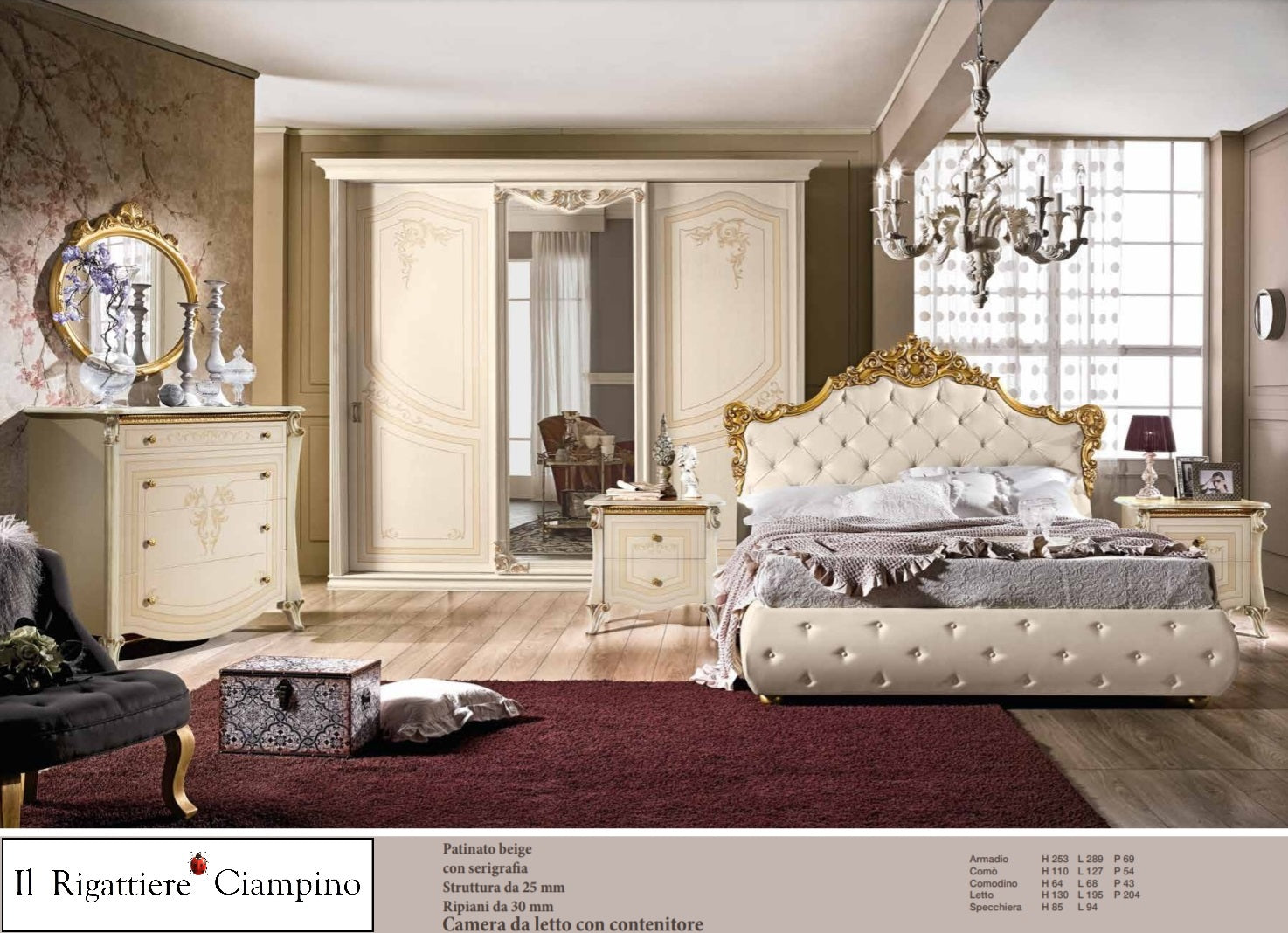 Camera da letto beige patinato in stile barocco con contenitore finiture oro