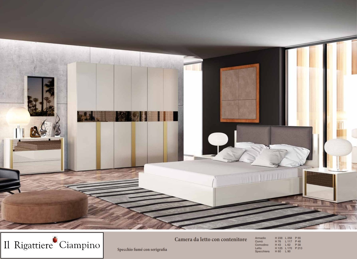 Camera da letto con contenitore bianca con serigrafia, dettagli oro, con specchi fumé