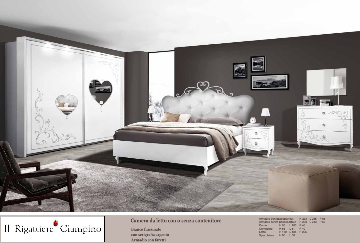 Il Rigattiere Ciampino propone un arredo completo per la tua camera da letto, di colore bianco frassinato con serigrafia argento, letto matrimoniale imbottito e trapuntato con o senza contenitore, imbottito, armadio serigrafato con cuori specchiati a due ante, faretti esterni, comò serigrafato a tre cassetti, e comodino serigrafato a due cassetti, perfetta per rendere il tuo ambiente bello e luminoso.
