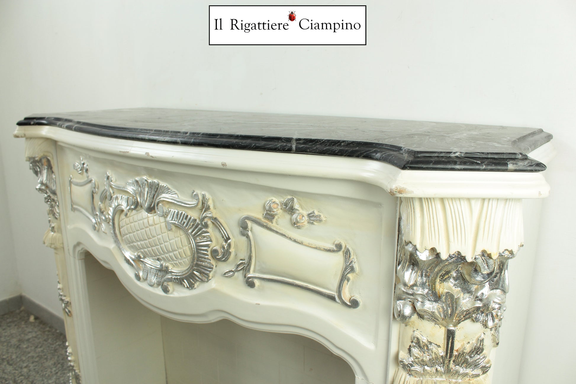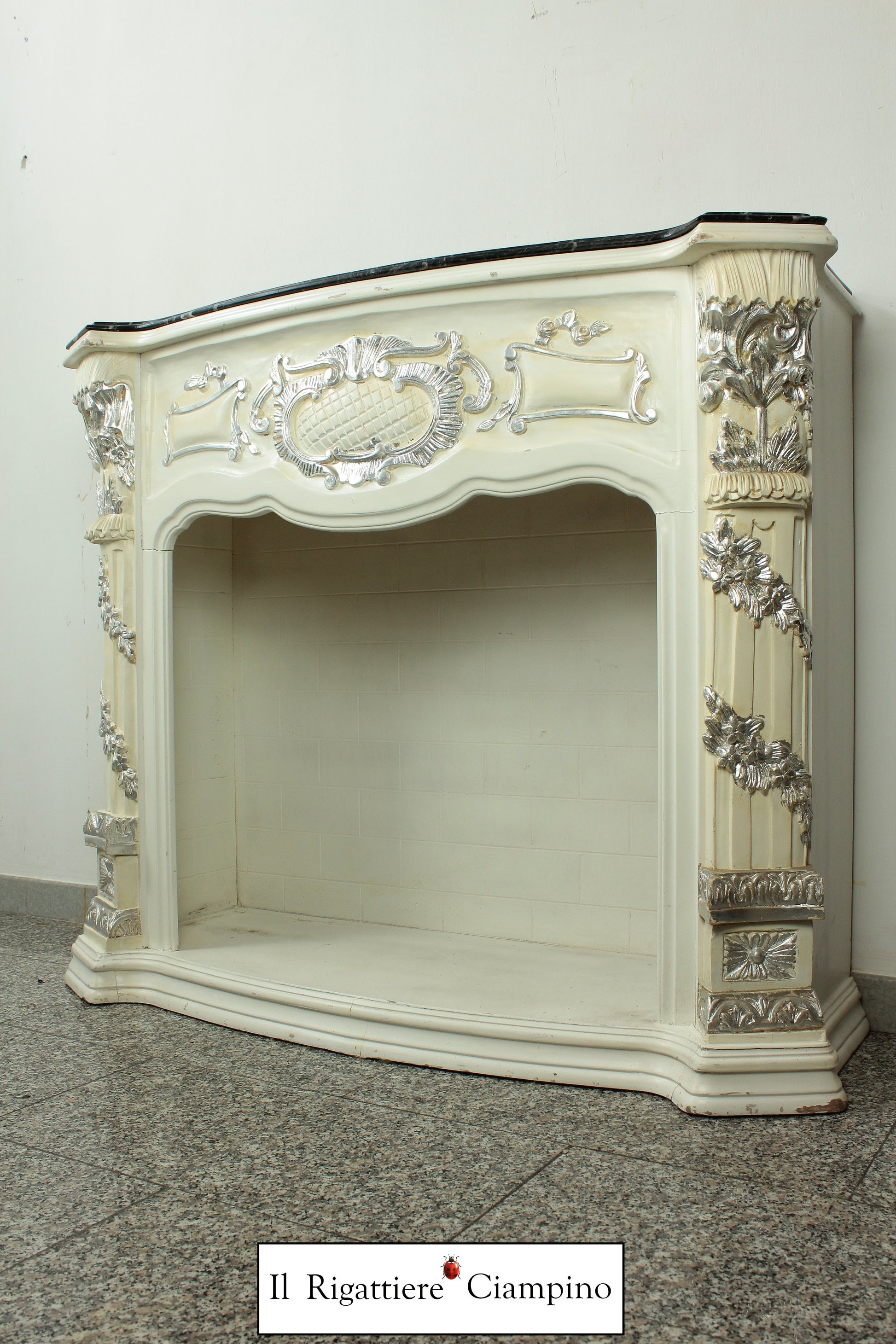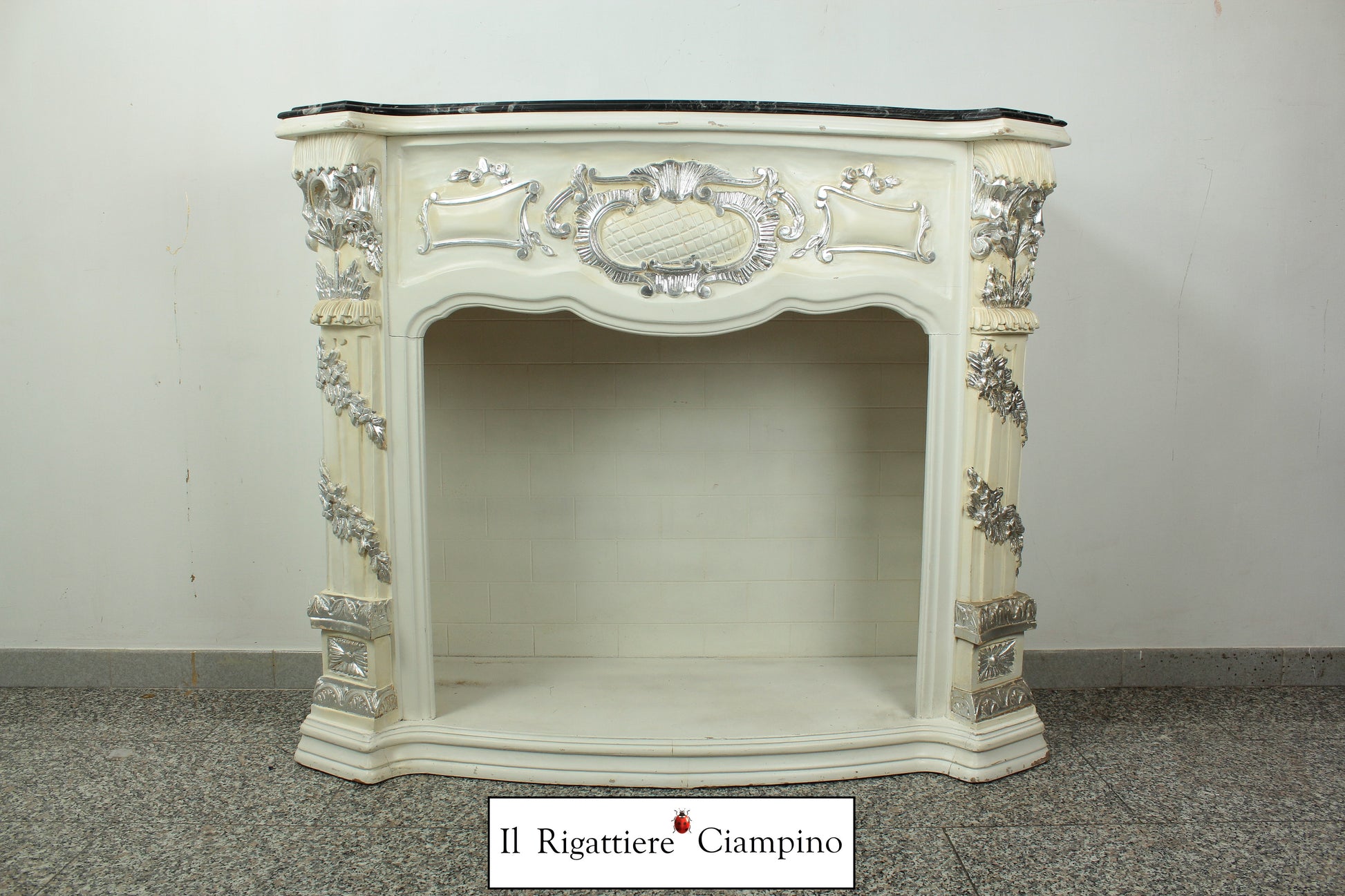 Il Rigattiere Ciampino propone un camino arredo in legno, con possibilità di inserire un camino elettrico, di colore bianco con rifiniture in foglia argento, con il piano superiore in marmo nero a venature bianche. Stile barocco.