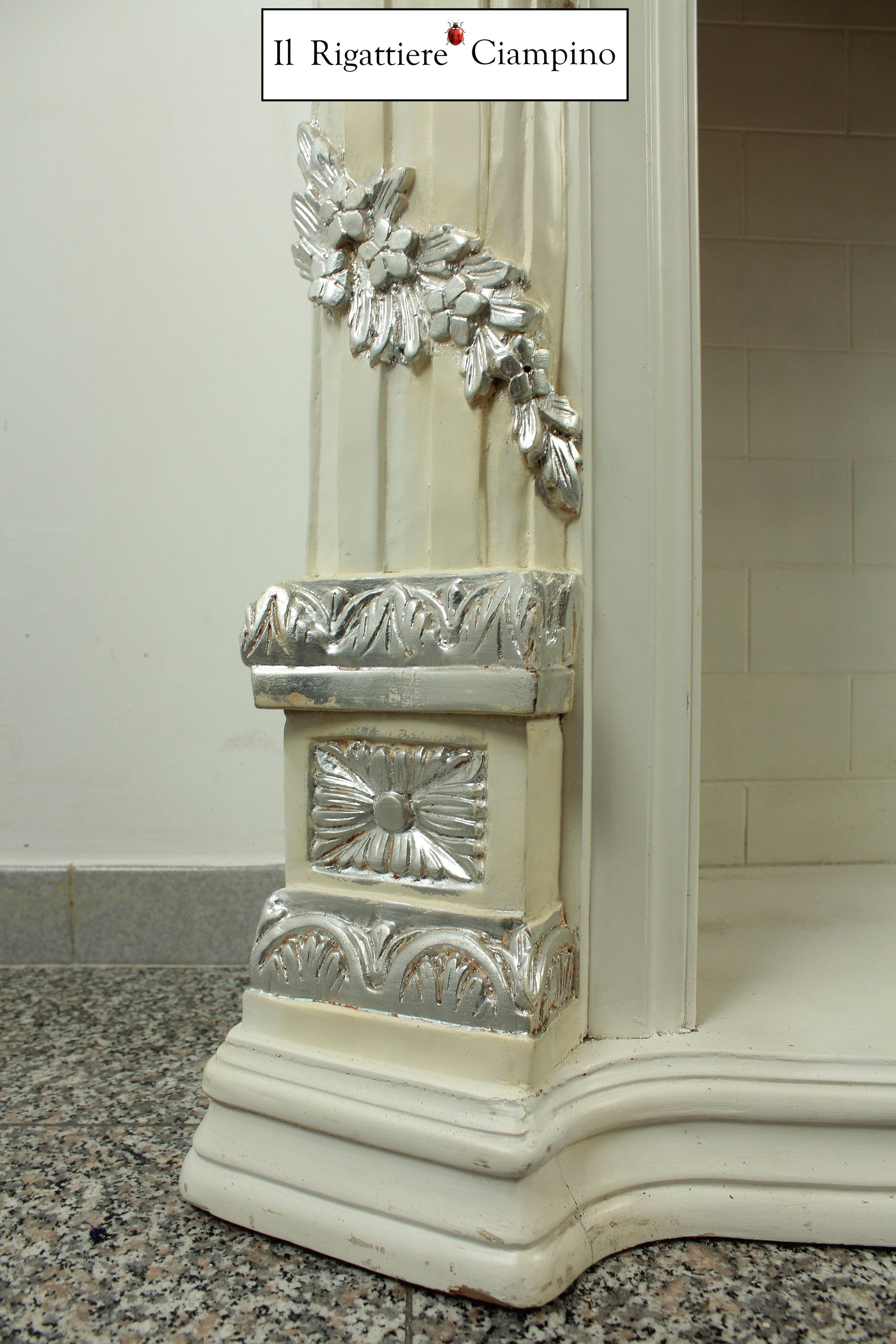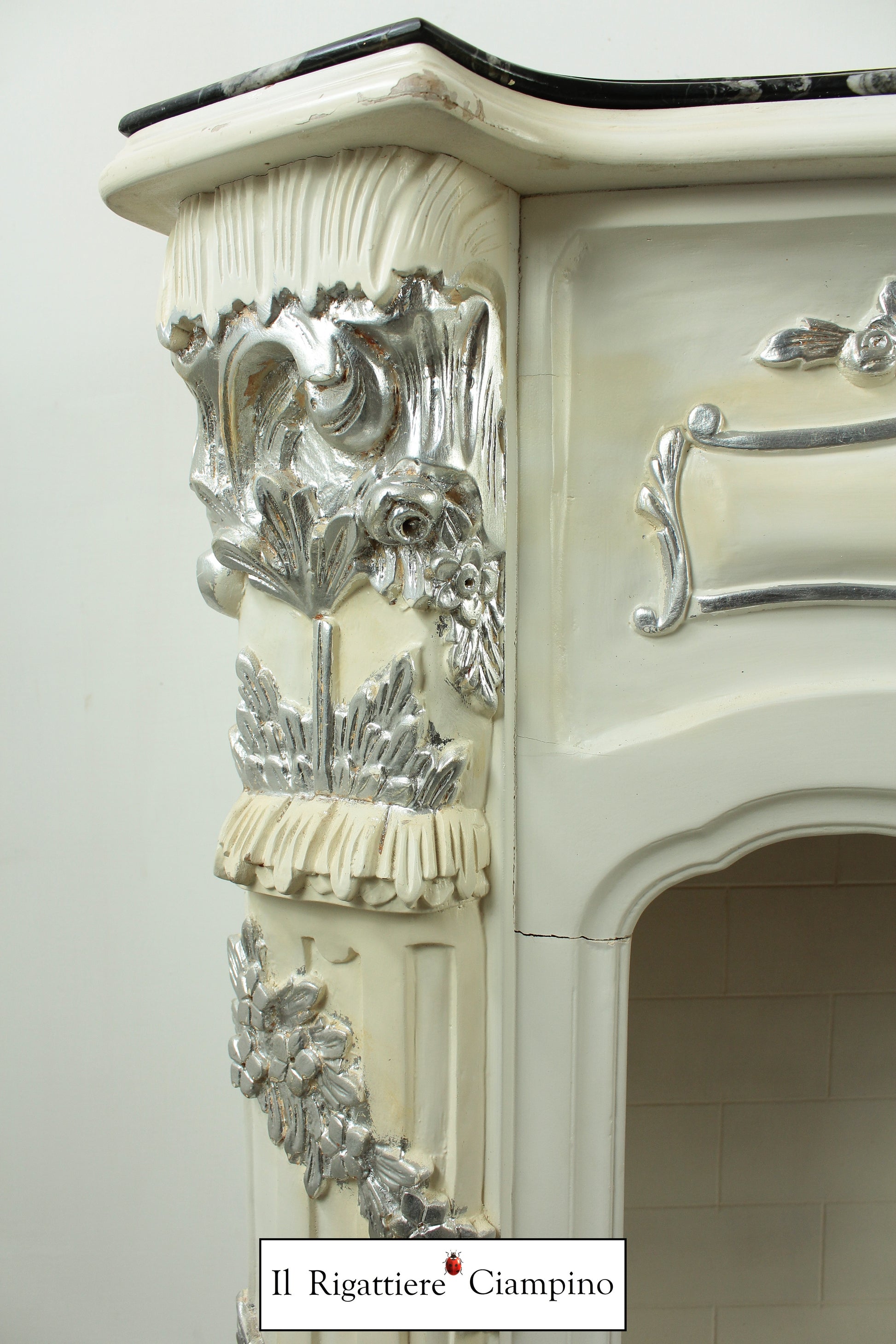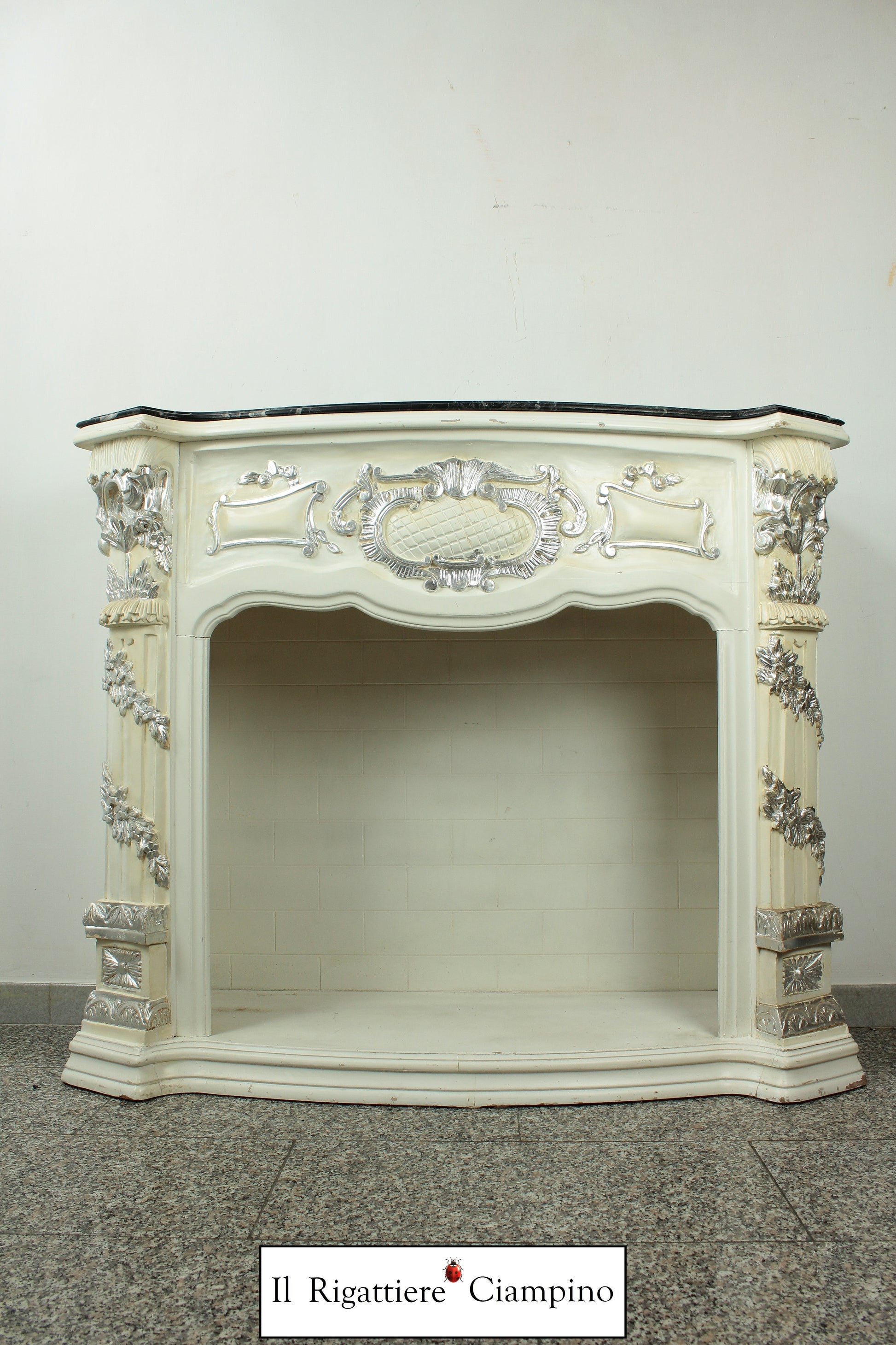 Il Rigattiere Ciampino propone un camino arredo in legno, con possibilità di inserire un camino elettrico, di colore bianco con rifiniture in foglia argento, con il piano superiore in marmo nero a venature bianche. Stile barocco.