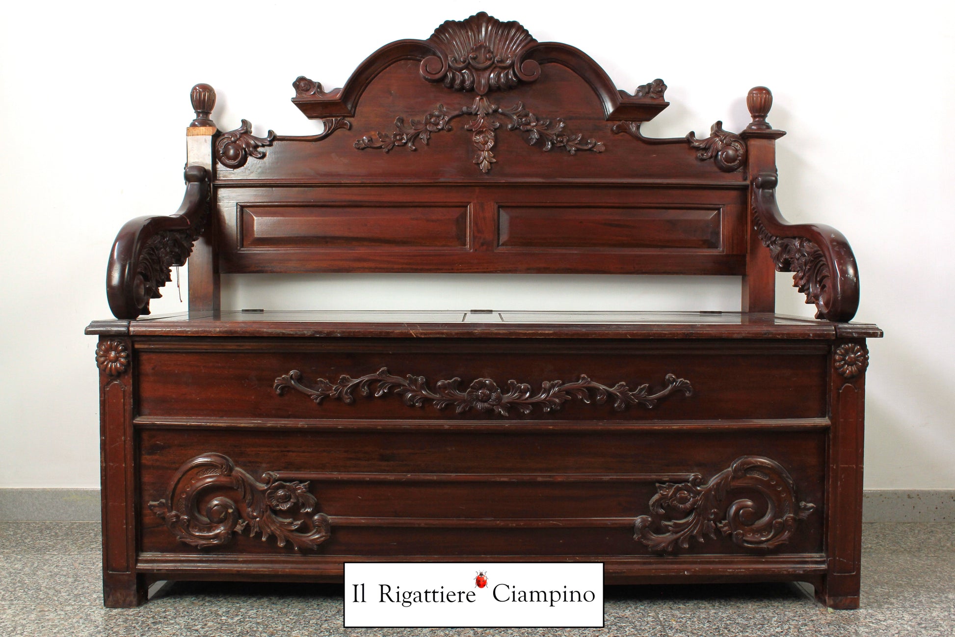 Il Rigattiere Ciampino propone una bellissima cassapanca in pregiato legno Mogano Massello, in stile francese, in un vero marrone, classico del mogano. Ottime finiture, mobile nuovo. Mobile ottimo come scarpiera, o panca da ingresso.
