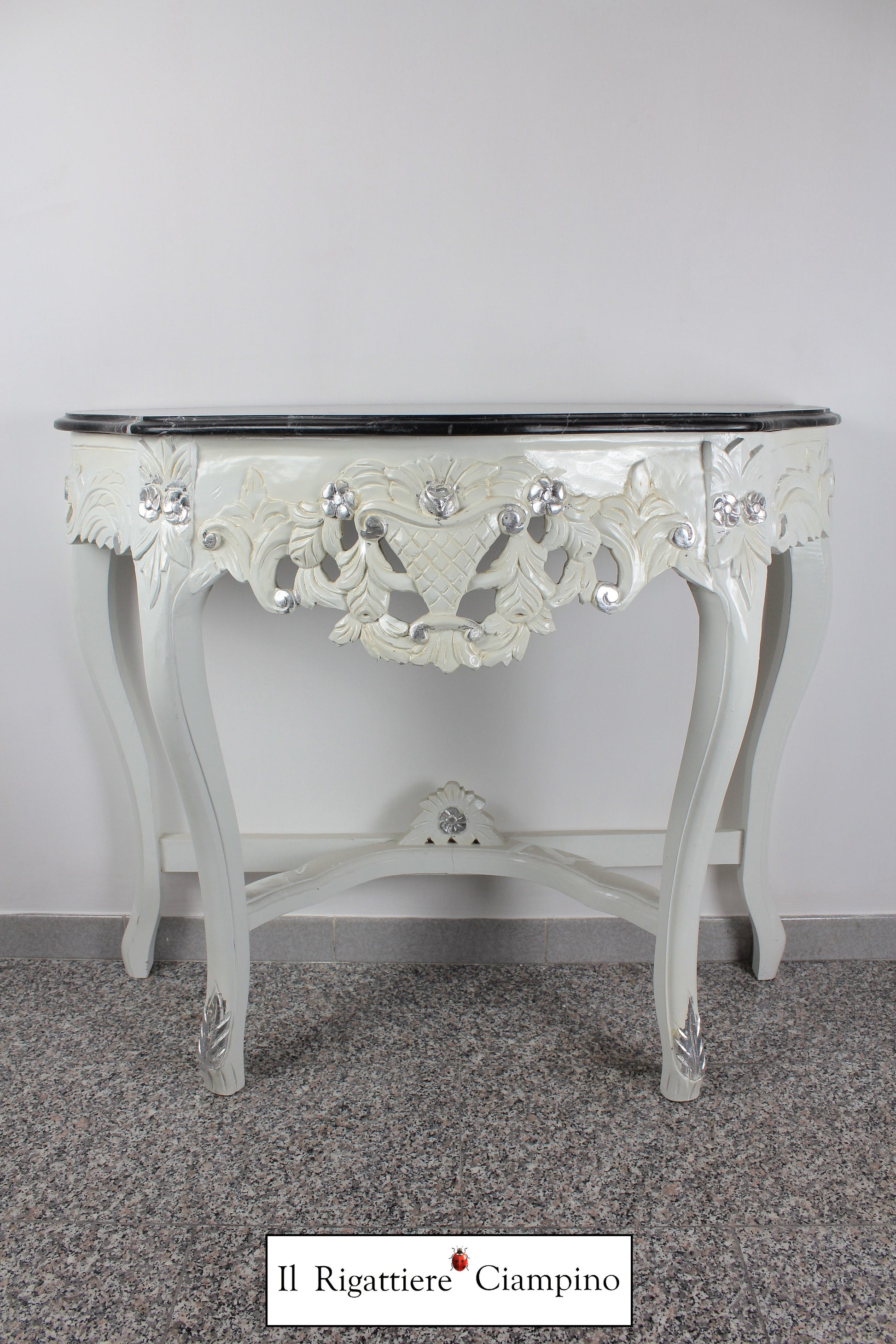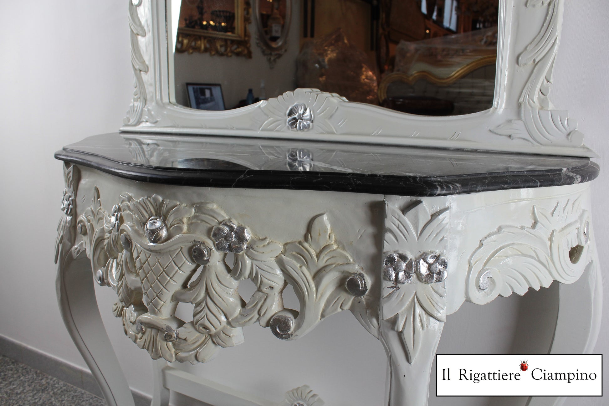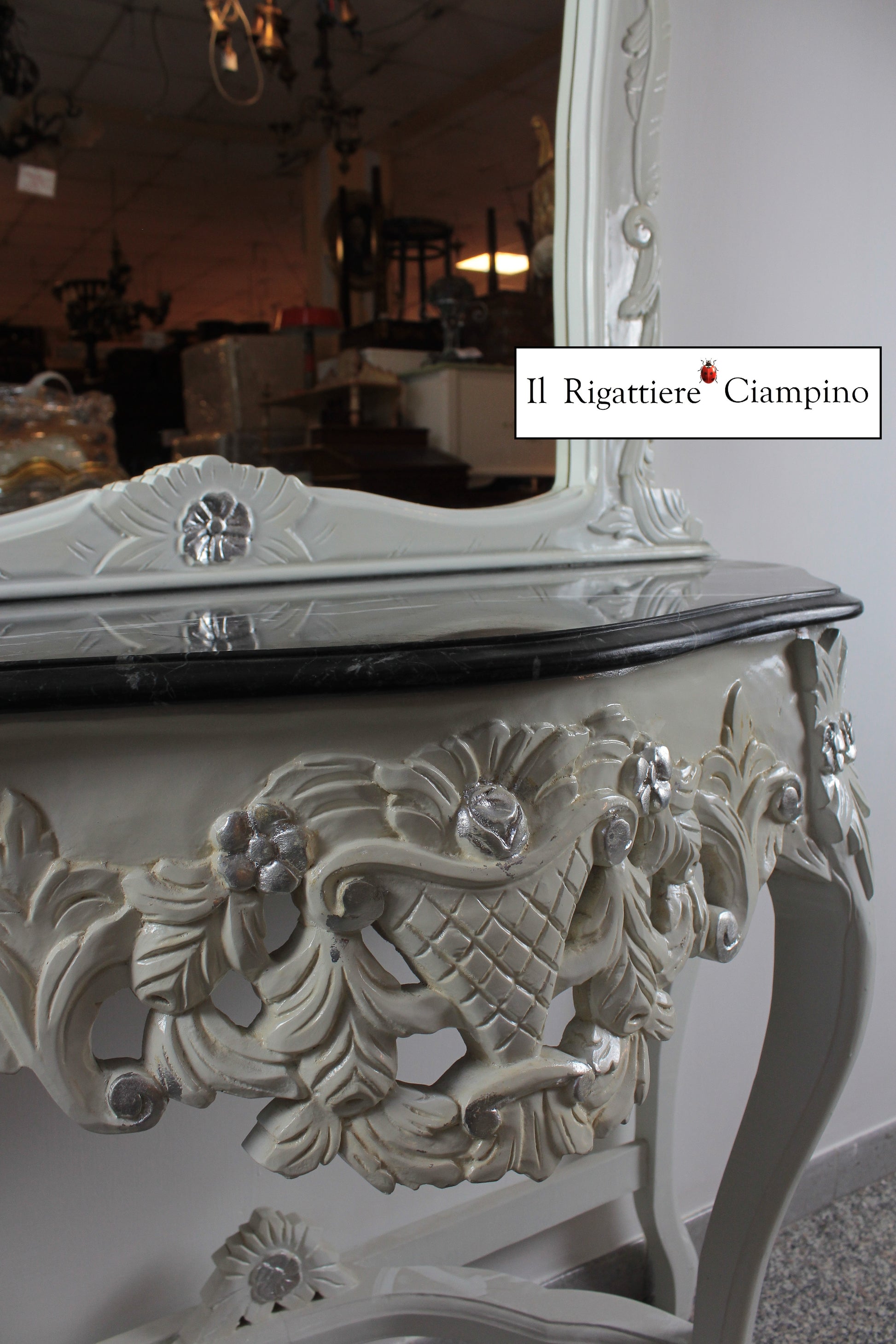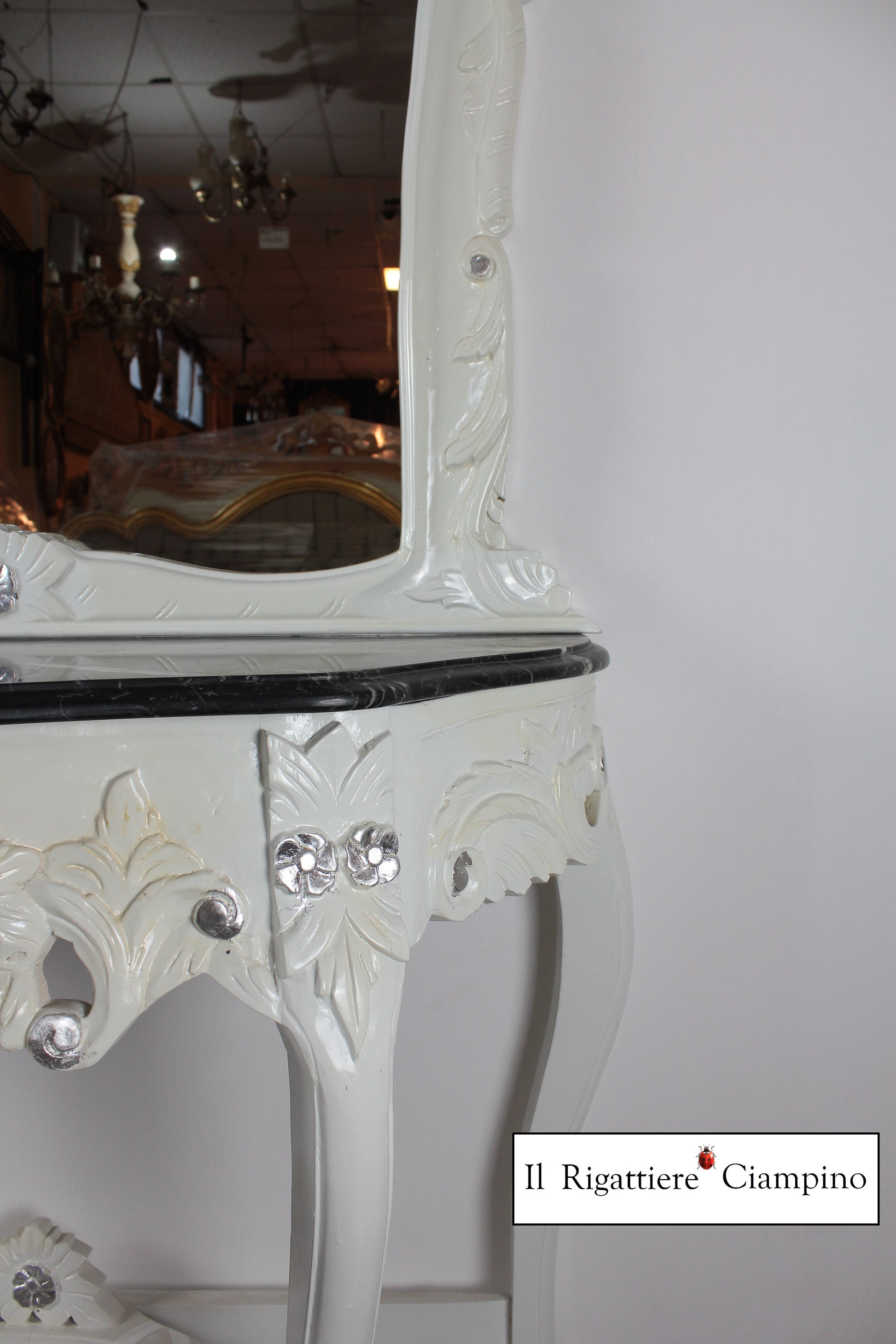 Il Rigattiere Ciampino propone una bellissima consolle di colore bianco in stile barocco, composta da 2 pezzi, con piano in marmo nero. Per donare lucentezza e maestosità alla tua camera, al tuo negozio o al tuo studio.