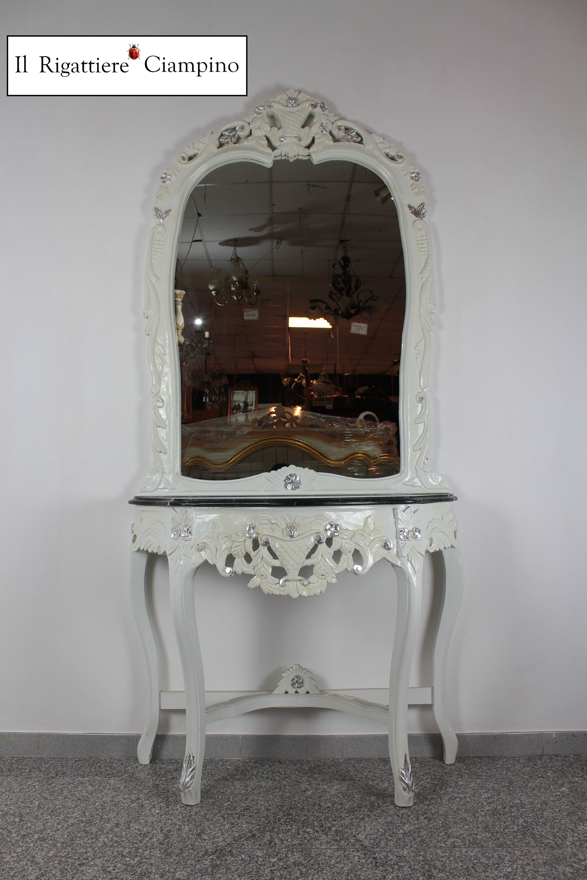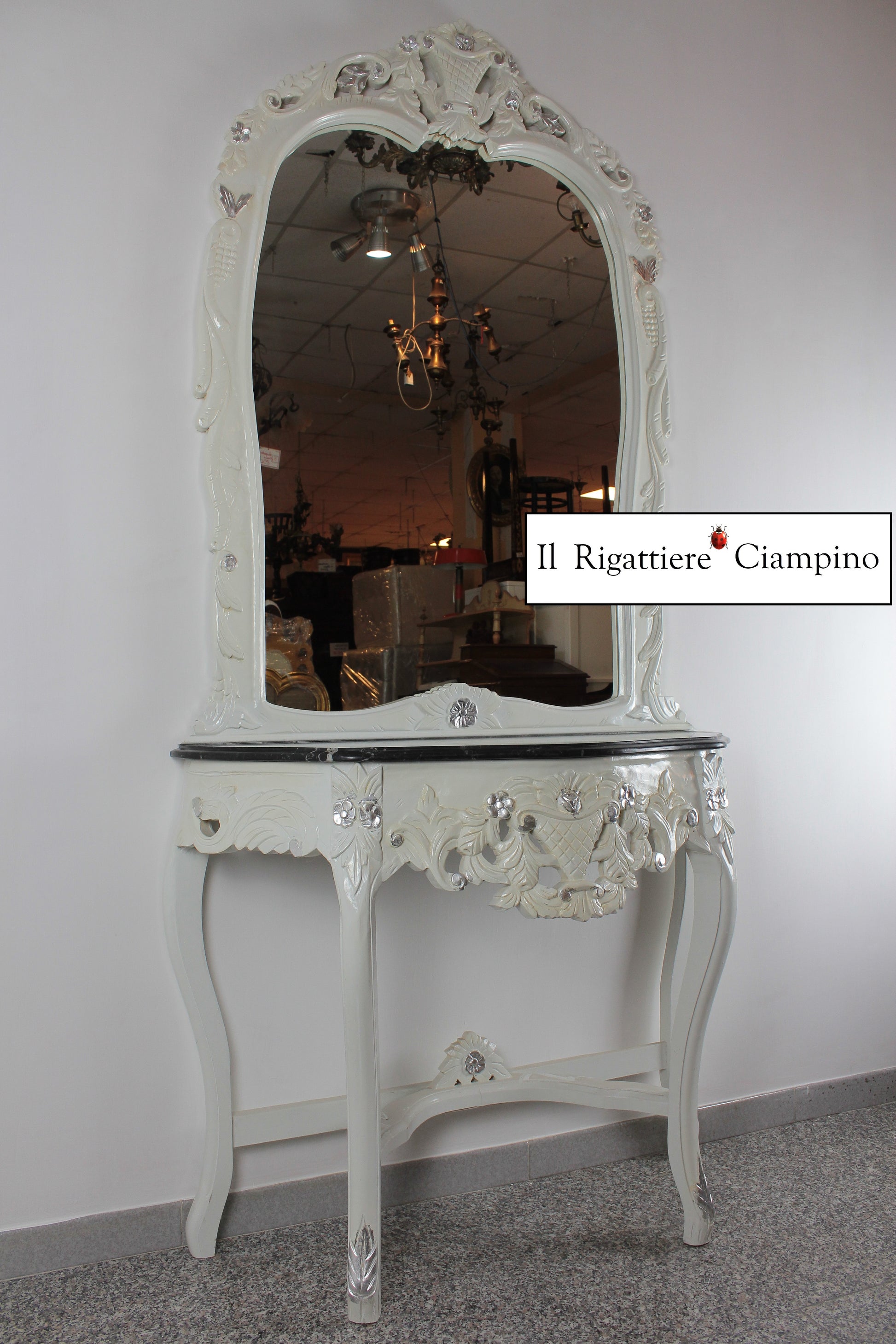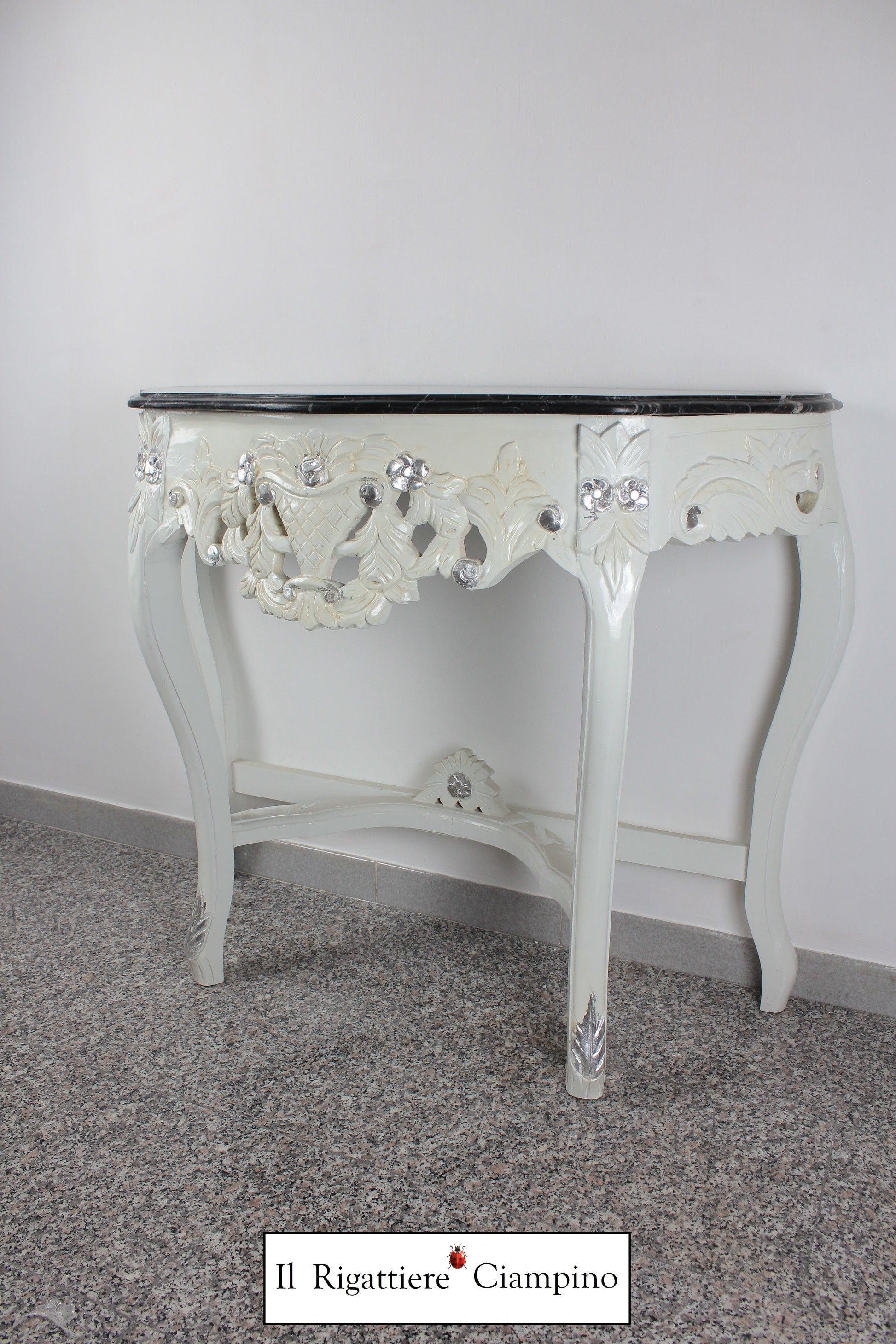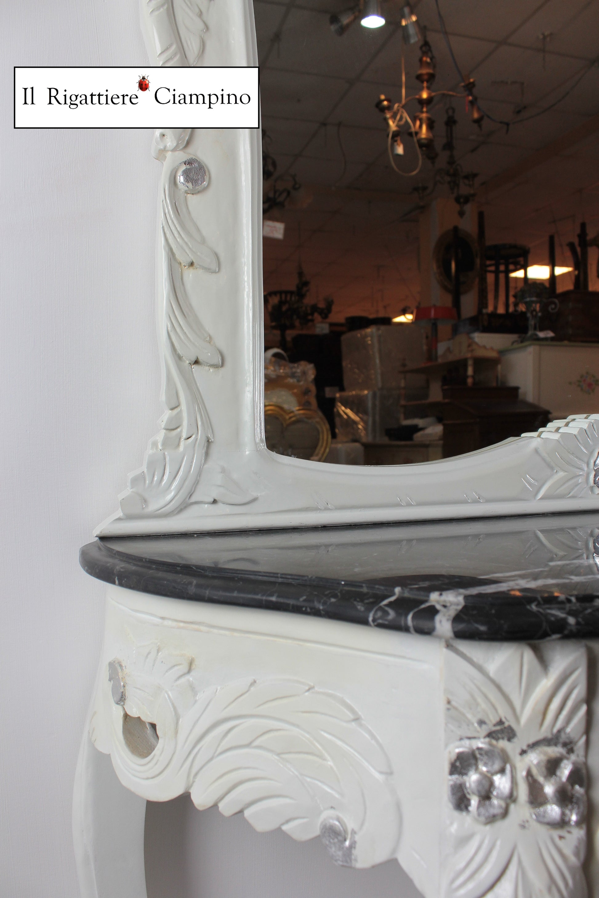 Il Rigattiere Ciampino propone una bellissima consolle di colore bianco in stile barocco, composta da 2 pezzi, con piano in marmo nero. Per donare lucentezza e maestosità alla tua camera, al tuo negozio o al tuo studio.