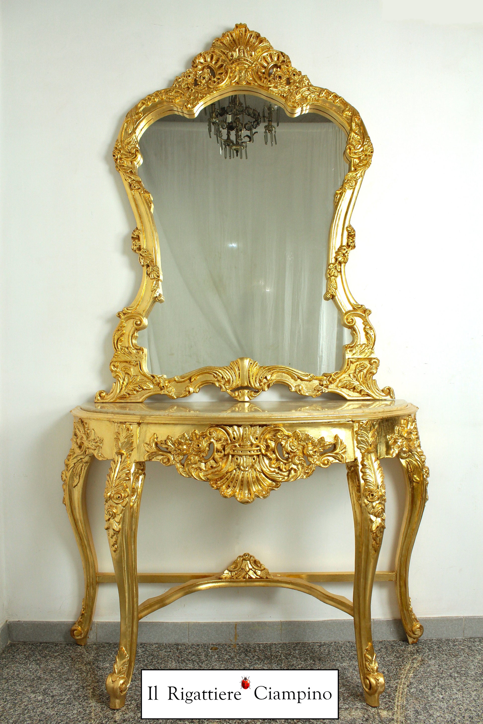 Consolle barocca in foglia oro con piano incastonato in marmo