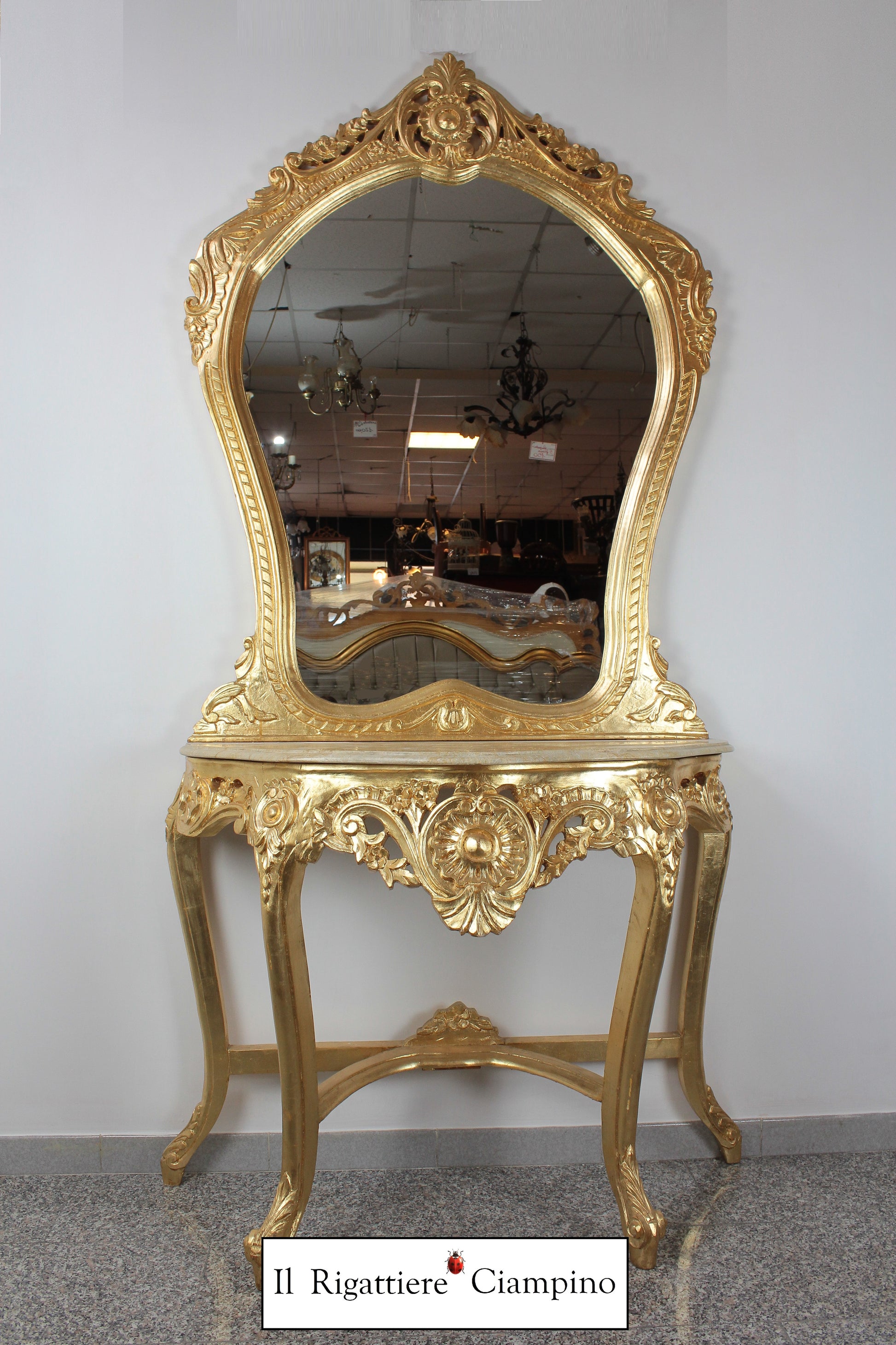 Il Rigattiere Ciampino propone una bellissima Consolle in stile barocco, composta da due pezzi più un piano in marmo. Foglia oro. Per donare lucentezza e maestosità alla tua camera, al tuo negozio o al tuo studio.
