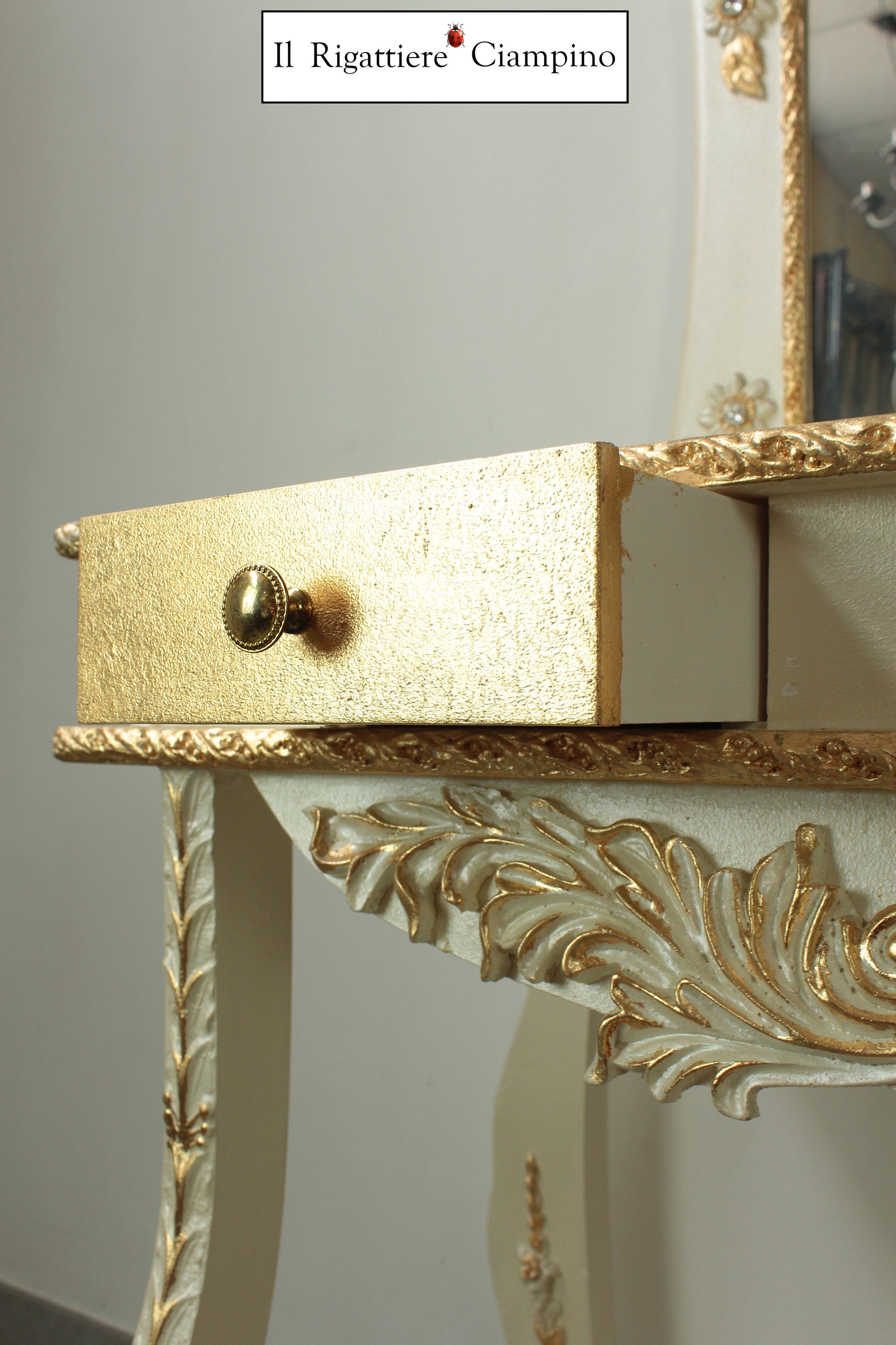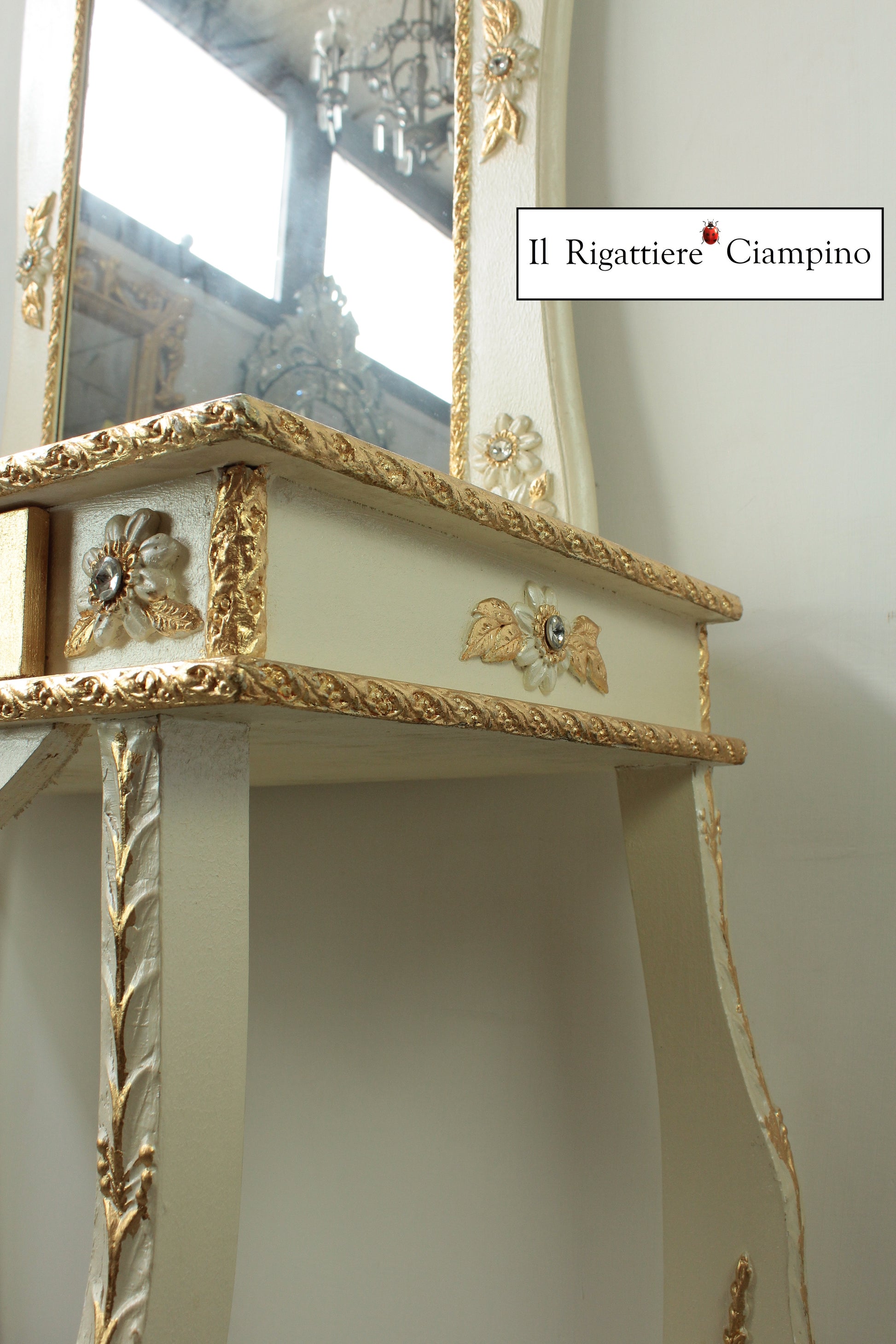 Consolle specchiera barocca avorio e oro con Swarovski