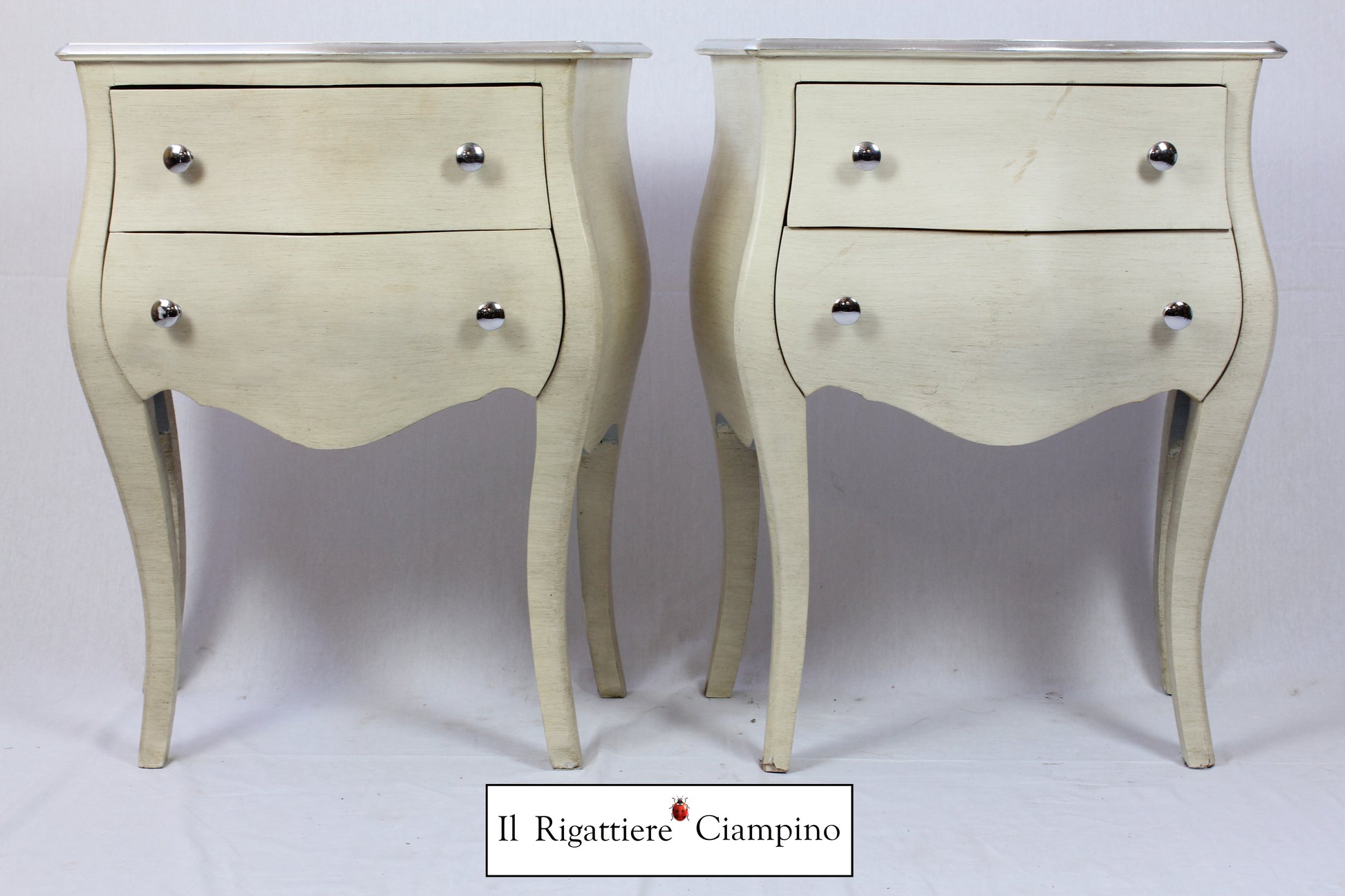 Il Rigattiere Ciampino propone una magnifica coppia di comodini di colore avorio, con rifiniture di colore argento, perfetta per la tua camera da letto. 2 cassetti con pomello argento specchiato. Prezzo per 2 pezzi, escluso di Spedizione o Consegna.