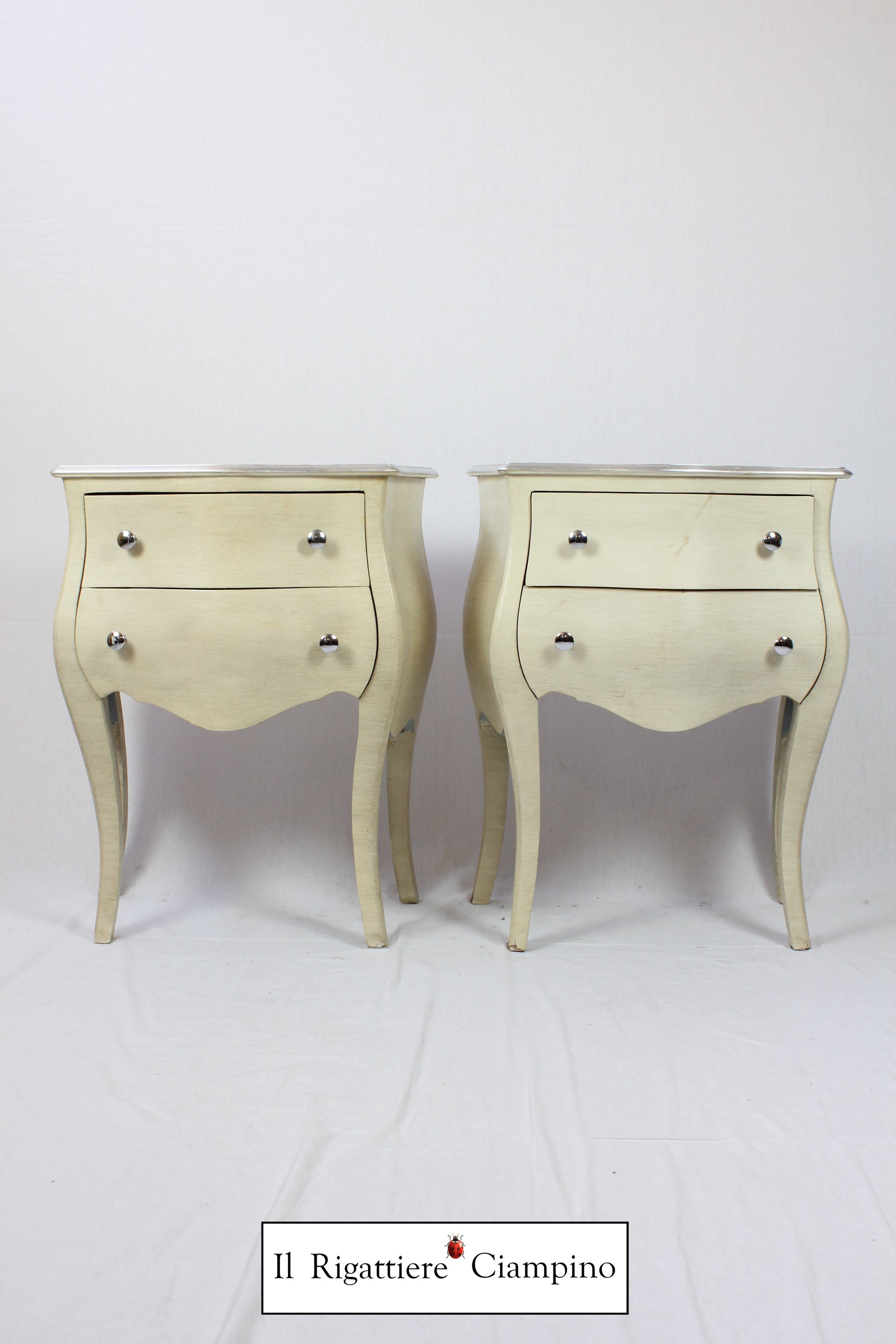 Coppia comodini avorio con rifiniture e pomelli argento, 2 cassetti