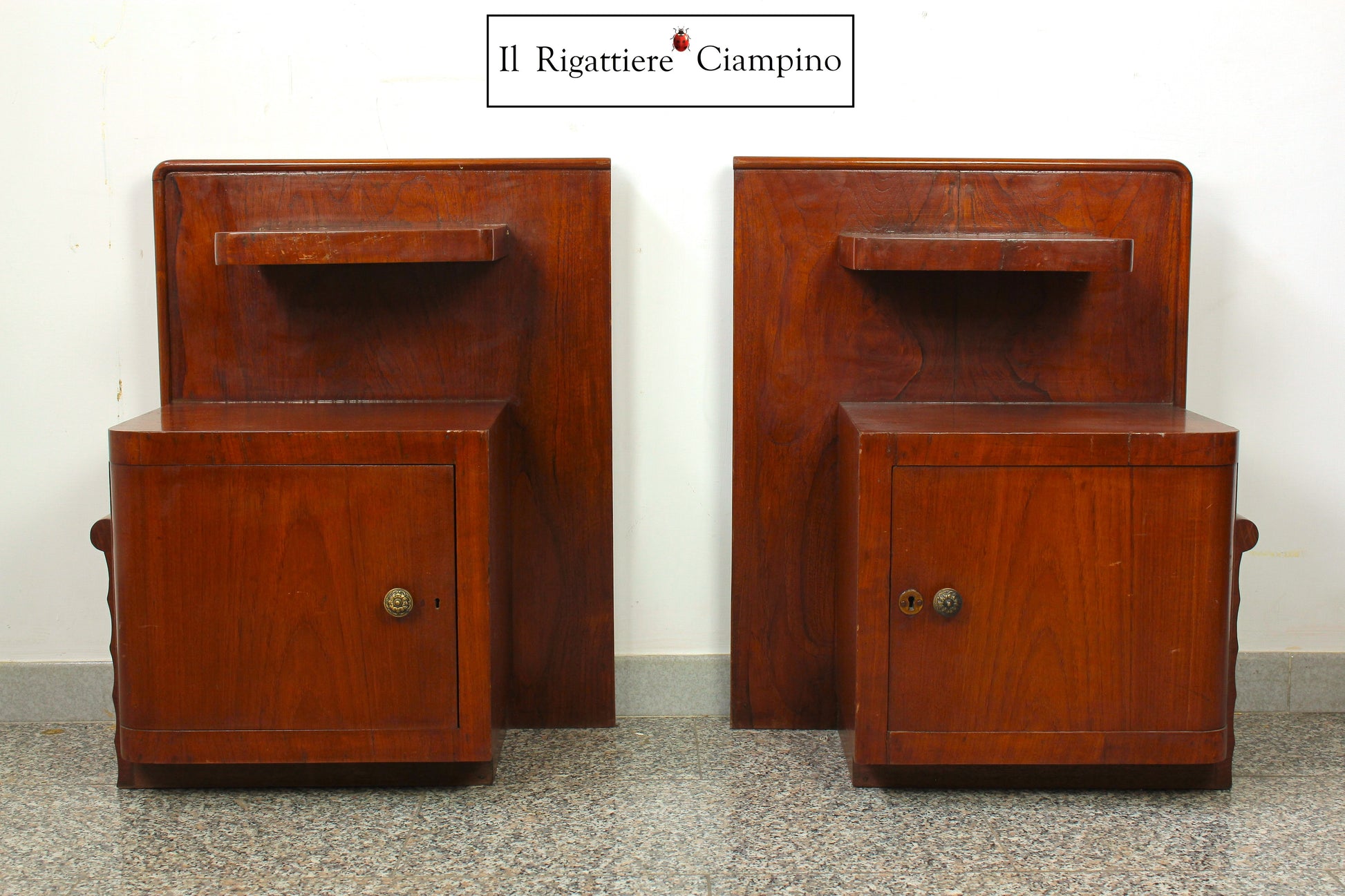 Il Rigattiere Ciampino propone una coppia di due comodini in legno, di colore marrone, con anta e piano superiore.