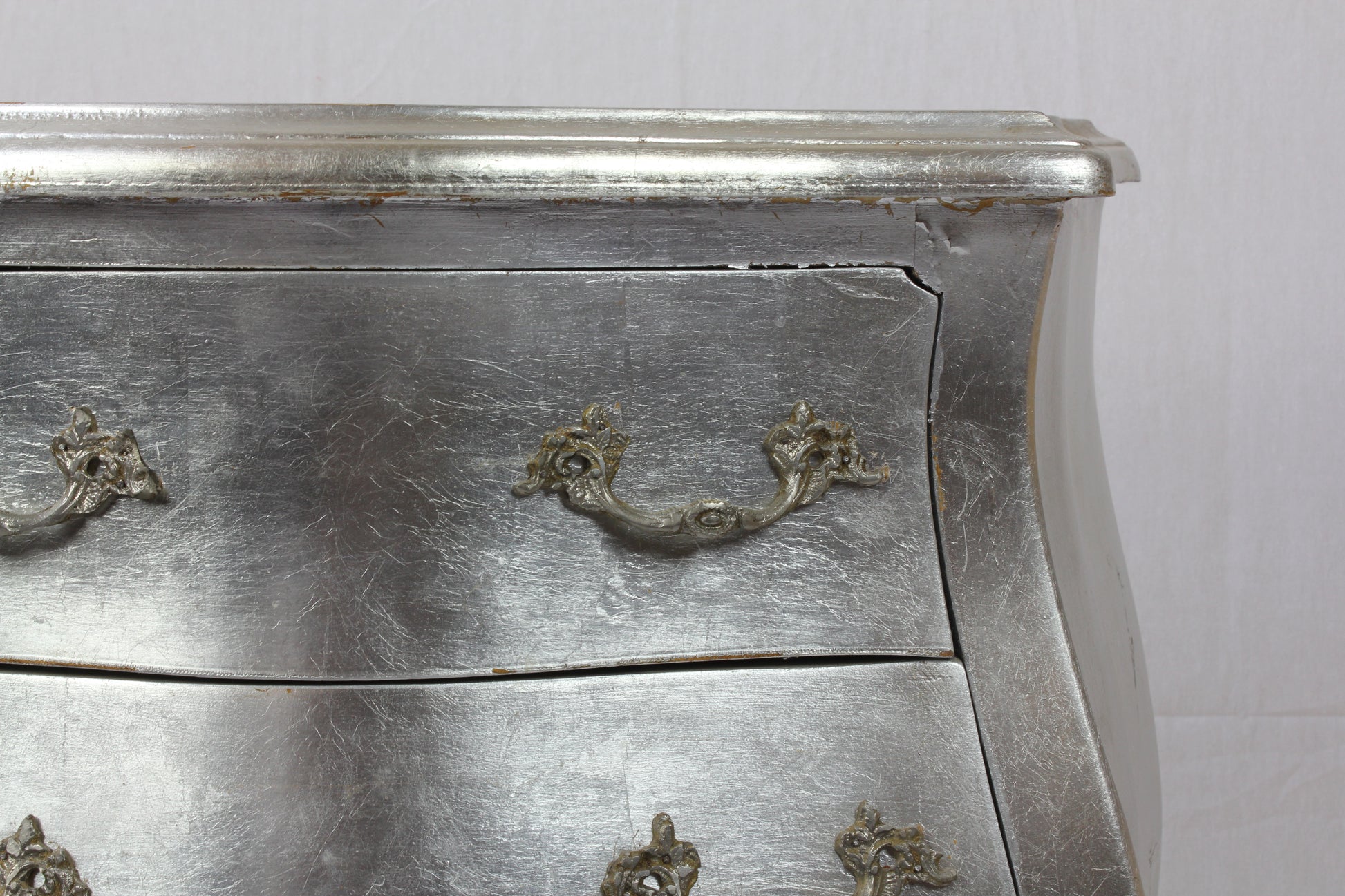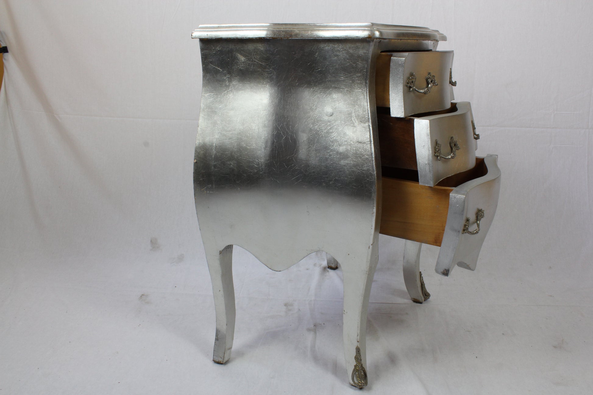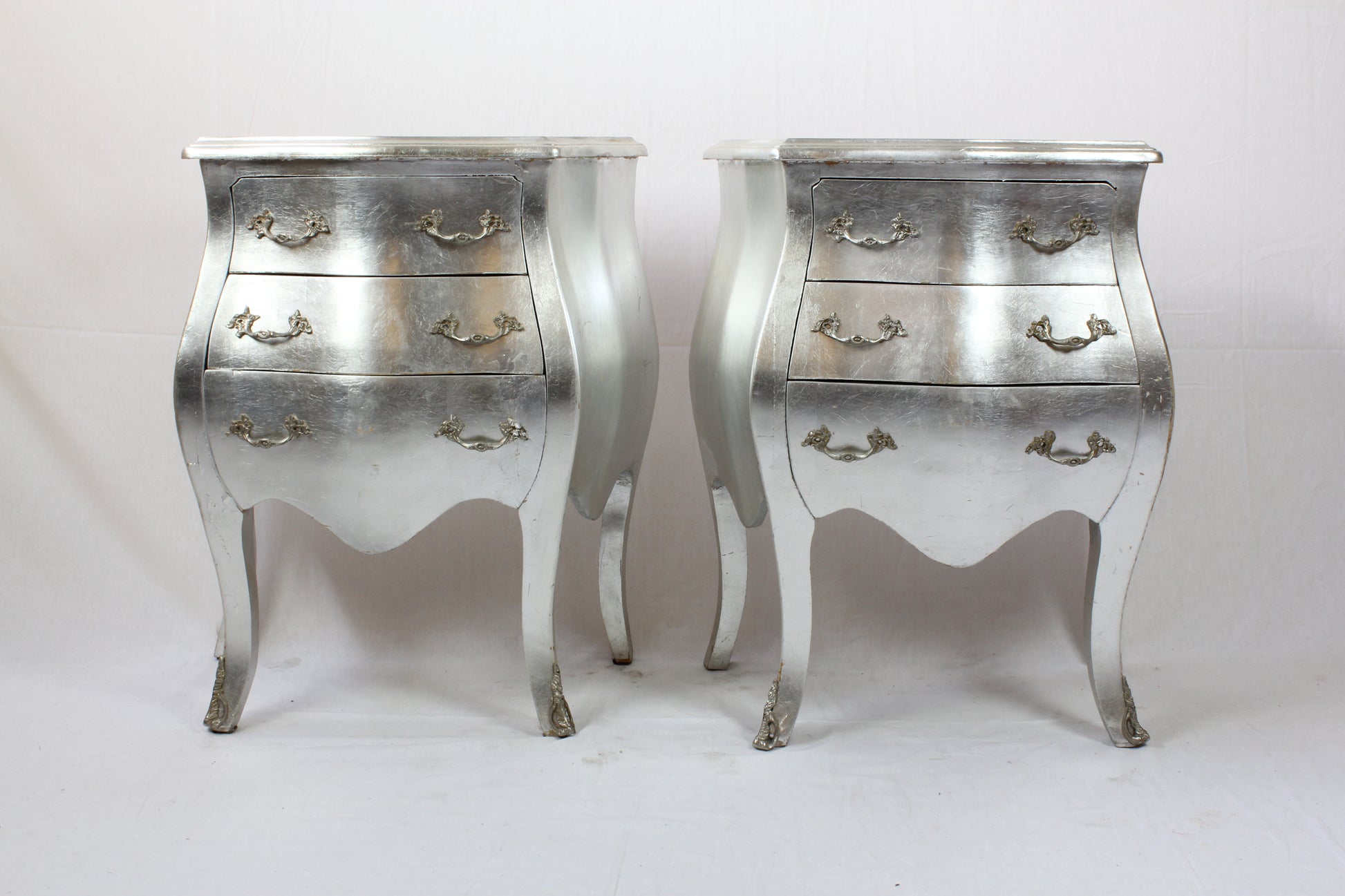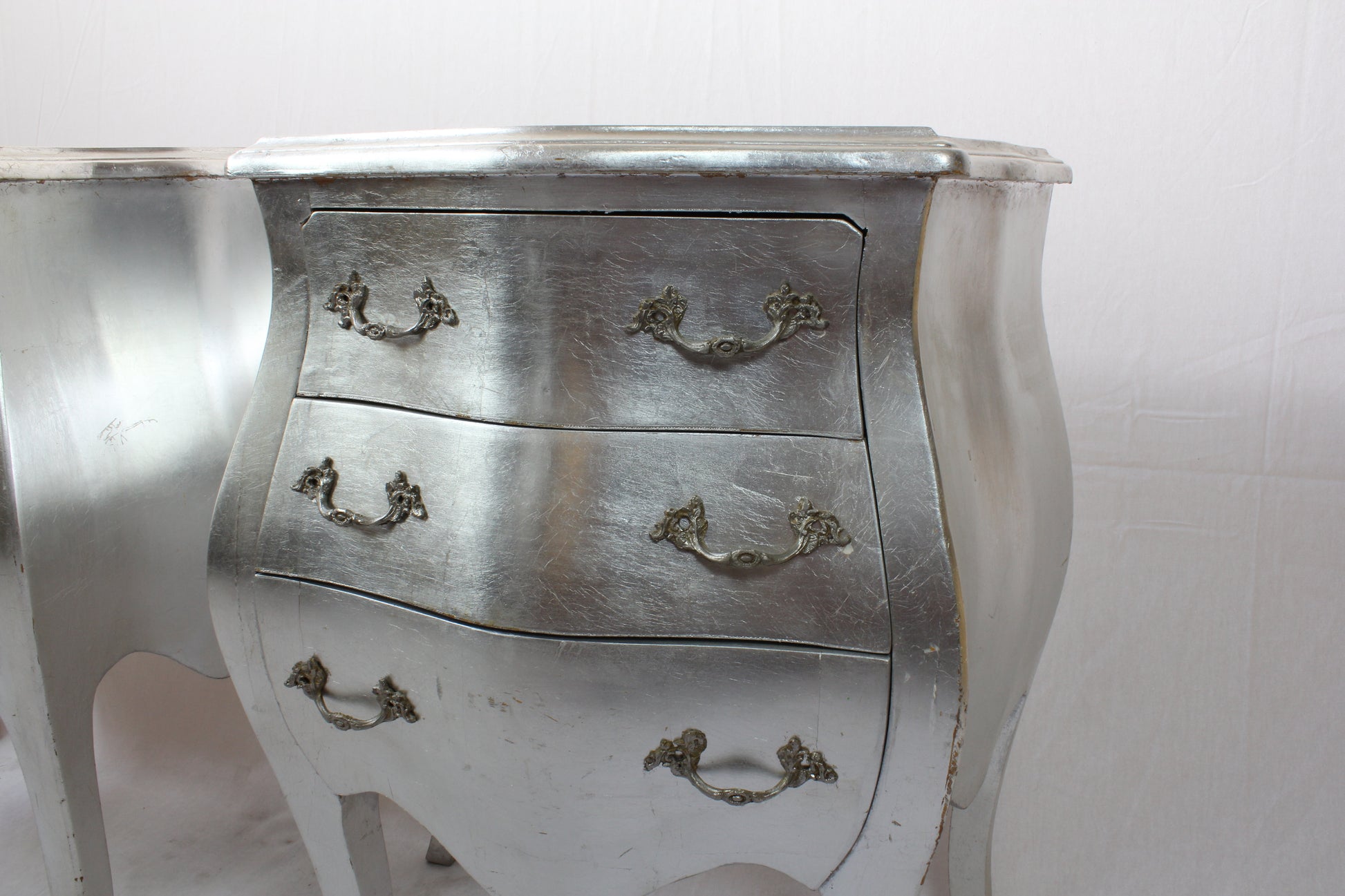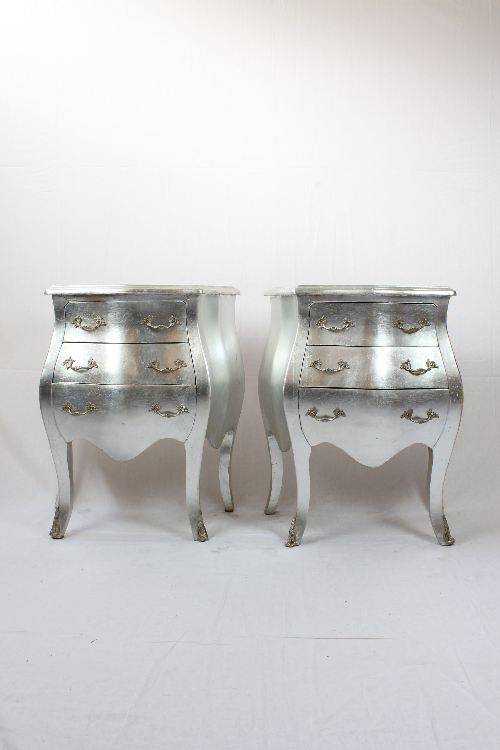 Il Rigattiere Ciampino propone una stupenda coppia di comodini modello Jennifer, in legno massello rivestito in foglia argento, con tre cassetti. Manici e decorazioni delle gambe in metallo. Questi comodini sono perfetti per donare luce e maestosità alla tua camera da letto. Prezzo per 2 pezzi.