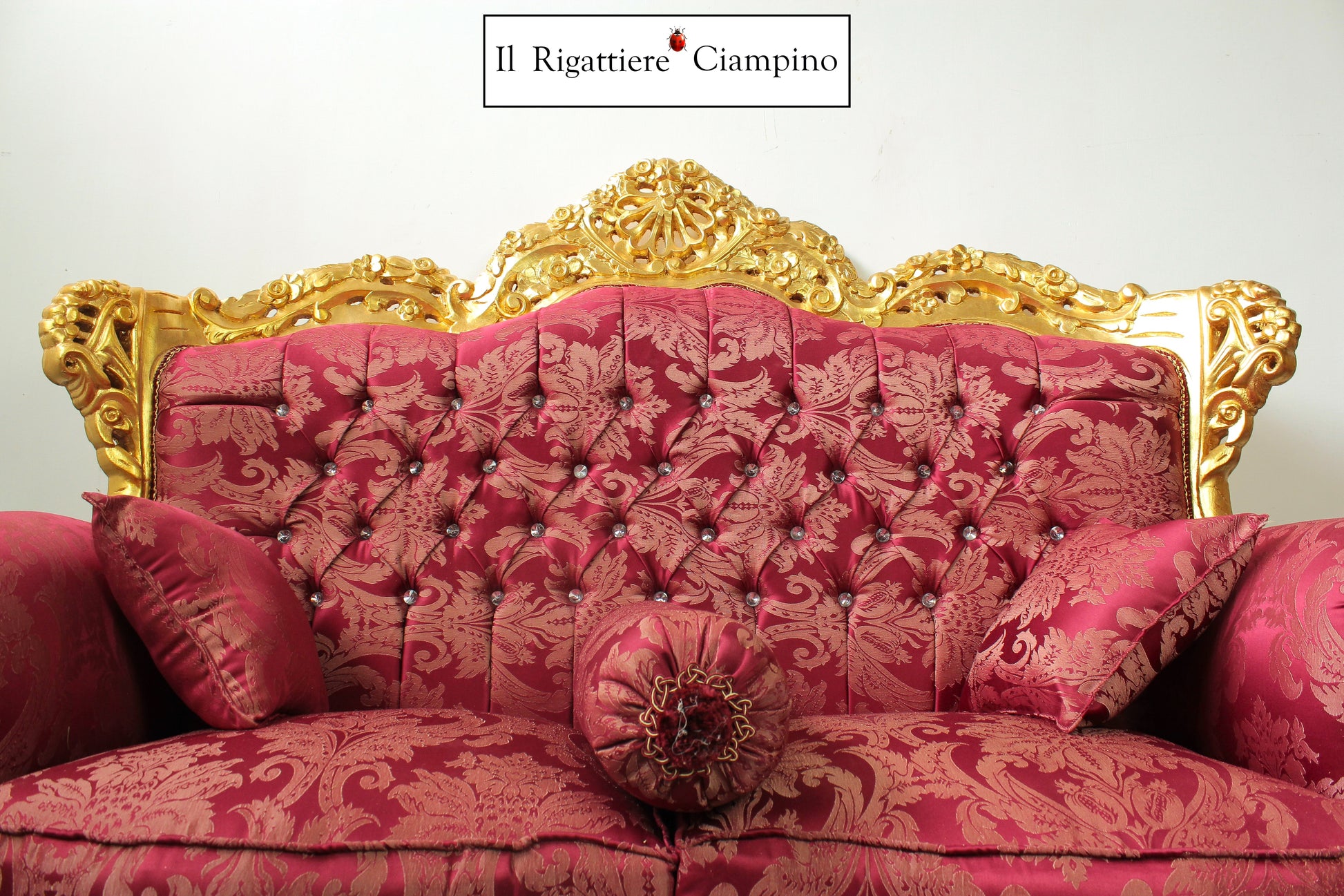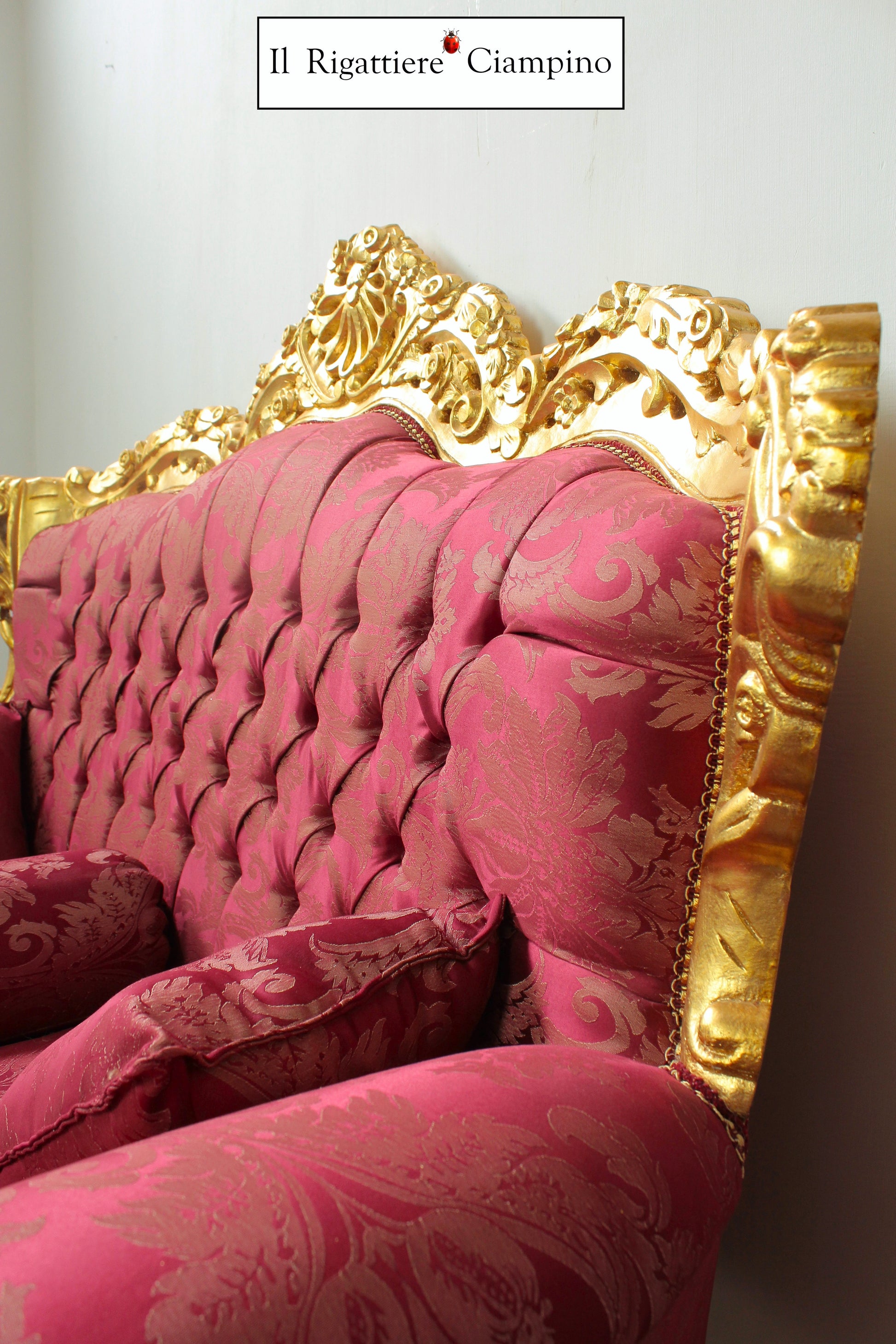 Il Rigattiere Ciampino propone un magnifico divano in stile barocco, a due posti. La struttura è in legno colore oro, il rivestimento è in tessuto damasco bordeaux, trapuntato con tecnica capitonné, bottoni Swarovski.