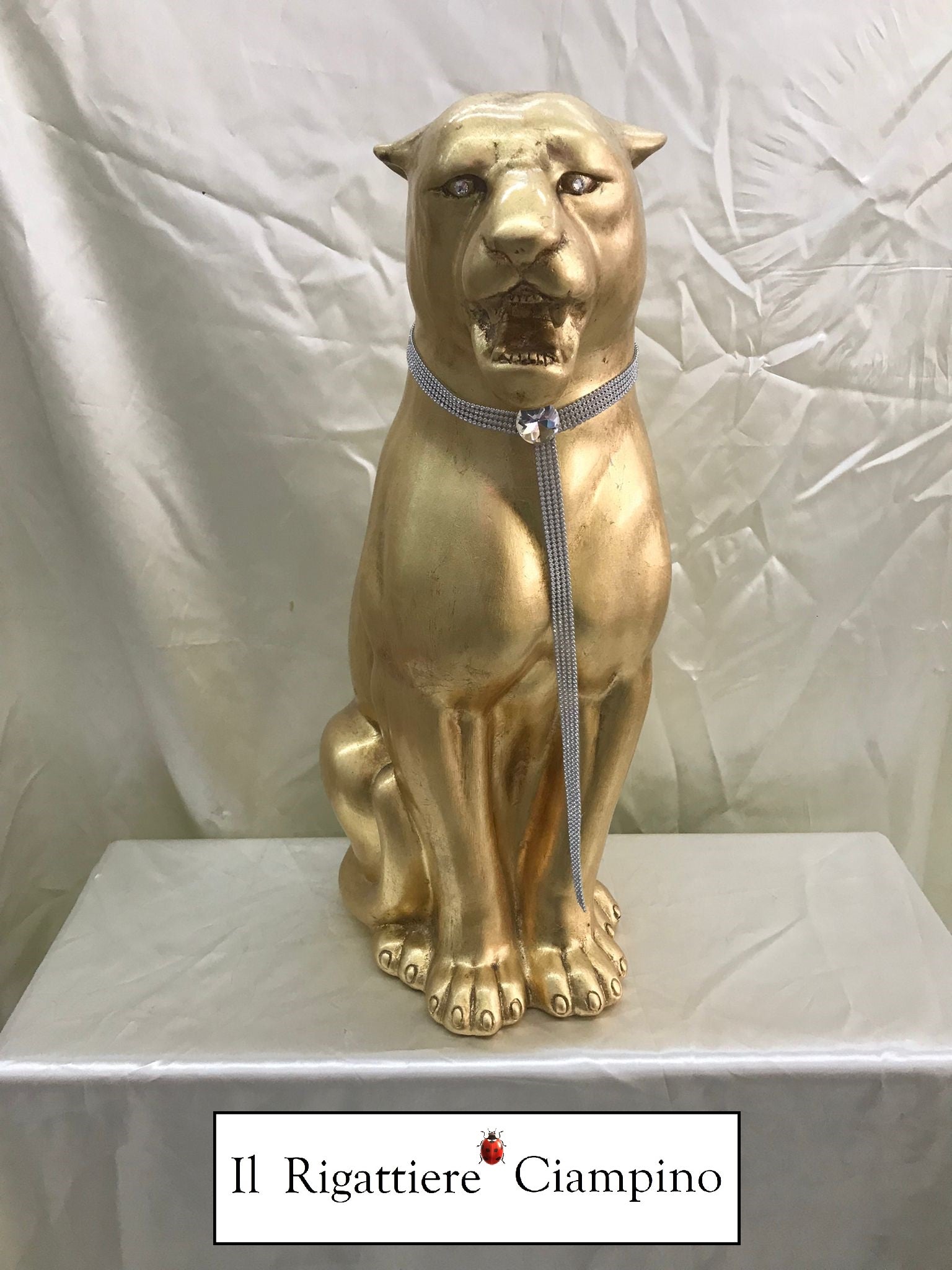 In foto una leonessa dorata con collare di cristalli e occhi Swarovski.