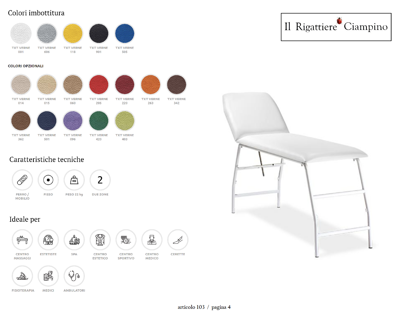 A differenza del lettino per massaggi pieghevole, si presenta con una struttura fissa, molto affidabile, ha un peso indicativo di 22 Kg, è disponibile in ferro-mobilio, ideale per i centri estetici, spa, centri sportivi, tatuatori, medici e ambulatori, dove non c’è la necessità di dover trasportare il lettino all’esterno.