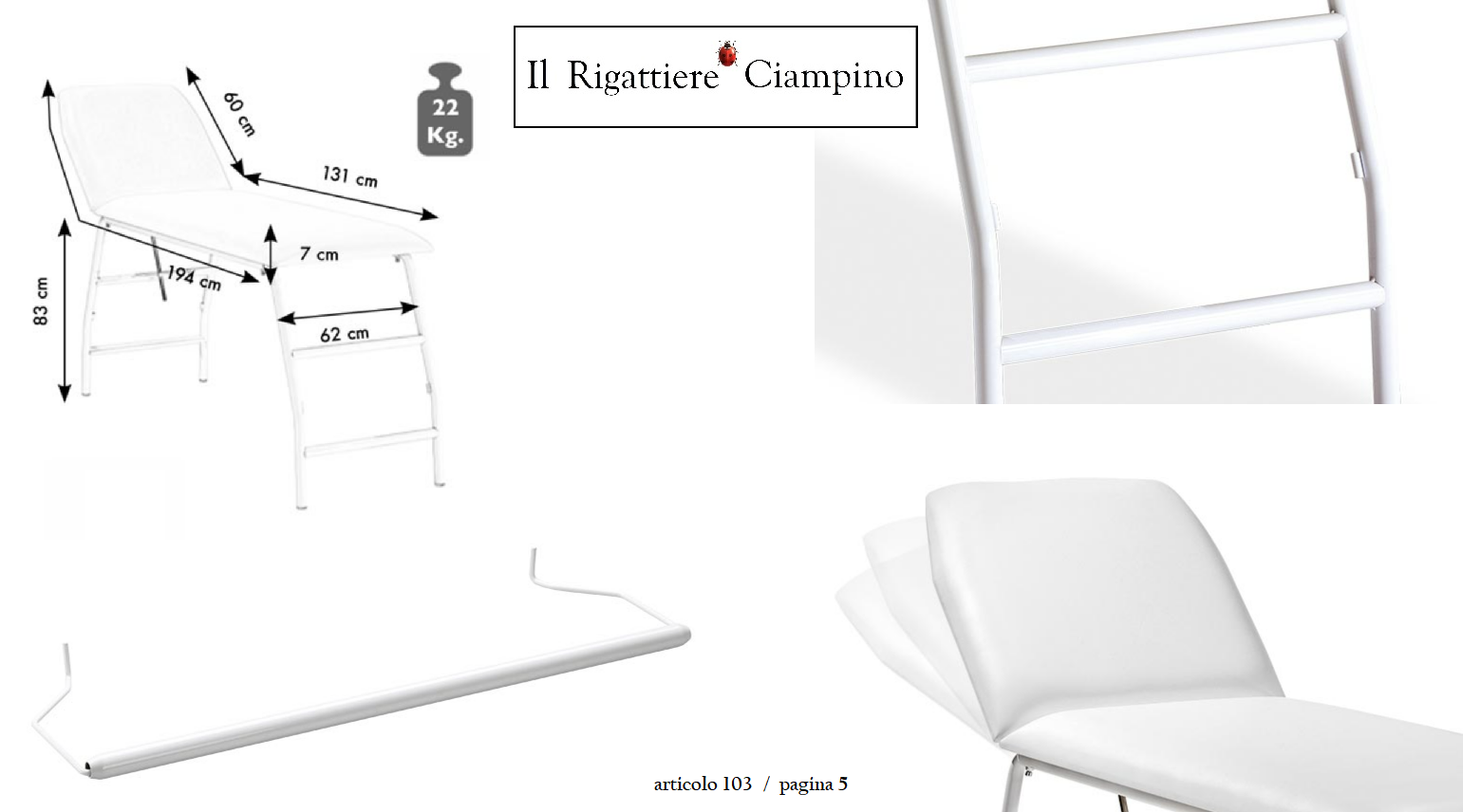 Il Rigattiere Ciampino propone un lettino estetista professionale 2 zone con testata regolabile, che si presenta con una struttura in acciaio tubolare, un diametro di 30 mm verniciato a polvere epossidica, di colore bianco e una portata massima di 310 Kg.