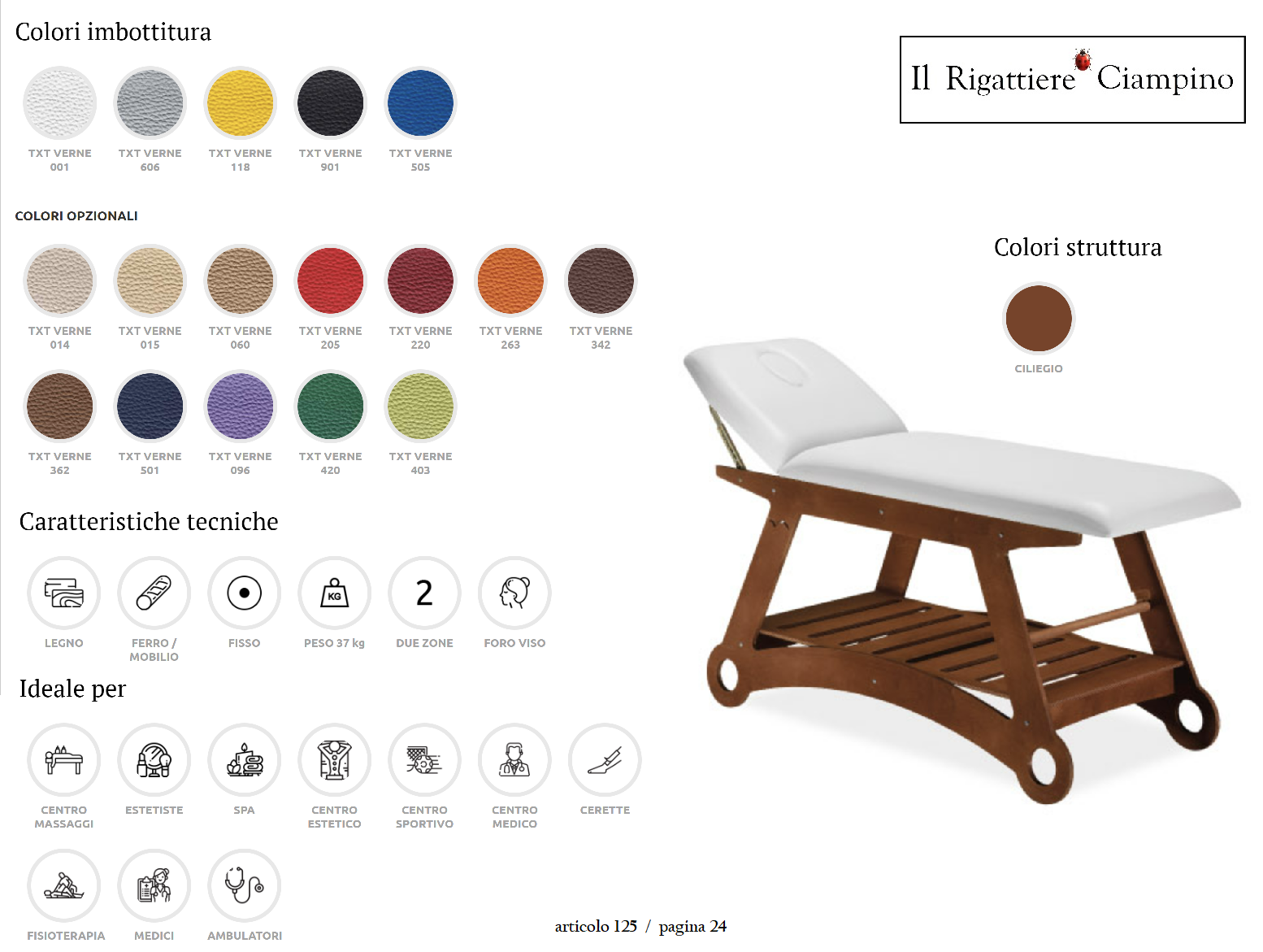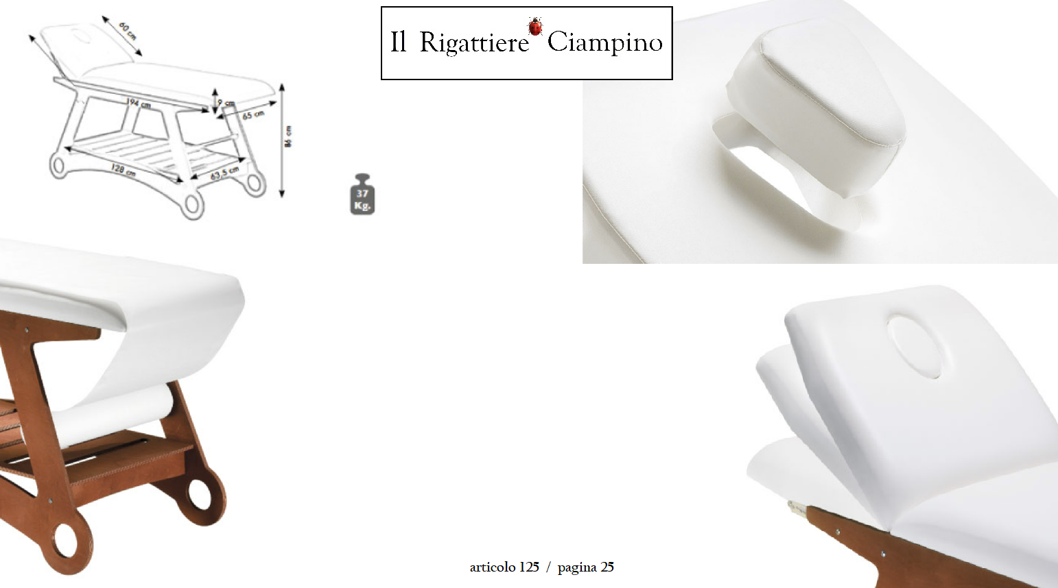 L’intera struttura del lettino ha una portata massima di 310 Kg, è Made in Italy ed è dotata di foro viso con tappo. Ha un peso di 37 kg.