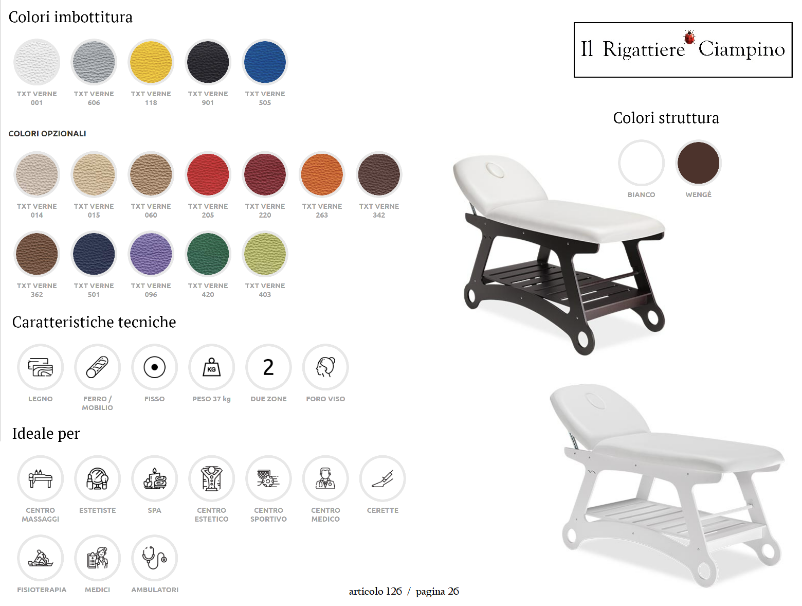 Il rivestimento del lettino è in similpelle lavabile, disponibile in 17 varianti di colore, ha l’imbottitura in poliuretano alta ben 7 cm, è facilmente lavabile è molto resistente all’acqua e olio. La tappezzeria ha larghezza 65cm. Per acquistare una colorazione diversa da quella bianca contattaci al 3295972343!