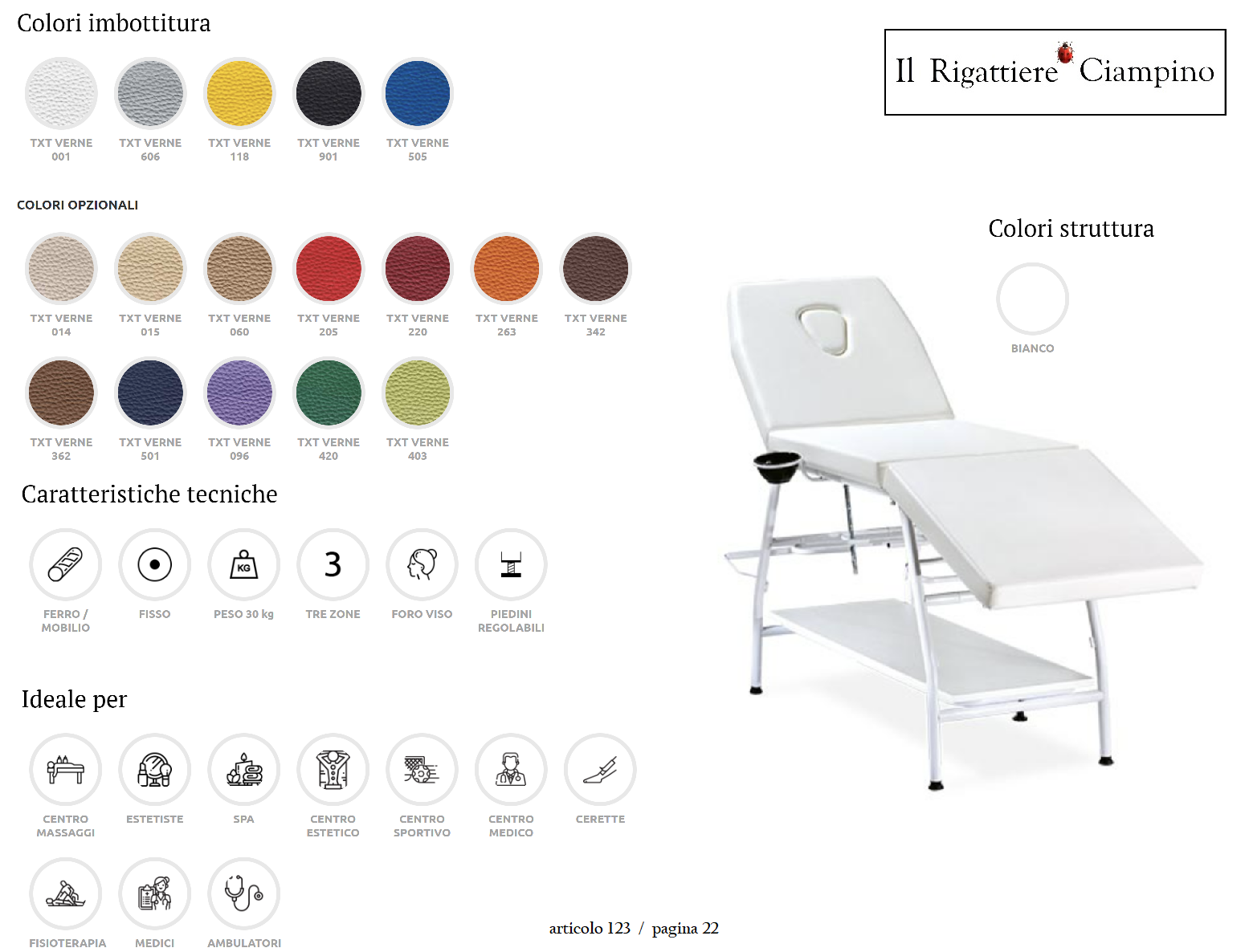L’intera struttura del lettino ha una portata massima di 310 Kg, è dotata di foro viso con tappo, piedini regolabili e può essere lavato e sanificato, con i comuni prodotti di pulizia presenti in commercio. I nostri lettini sono rigorosamente Made in Italy certificati!