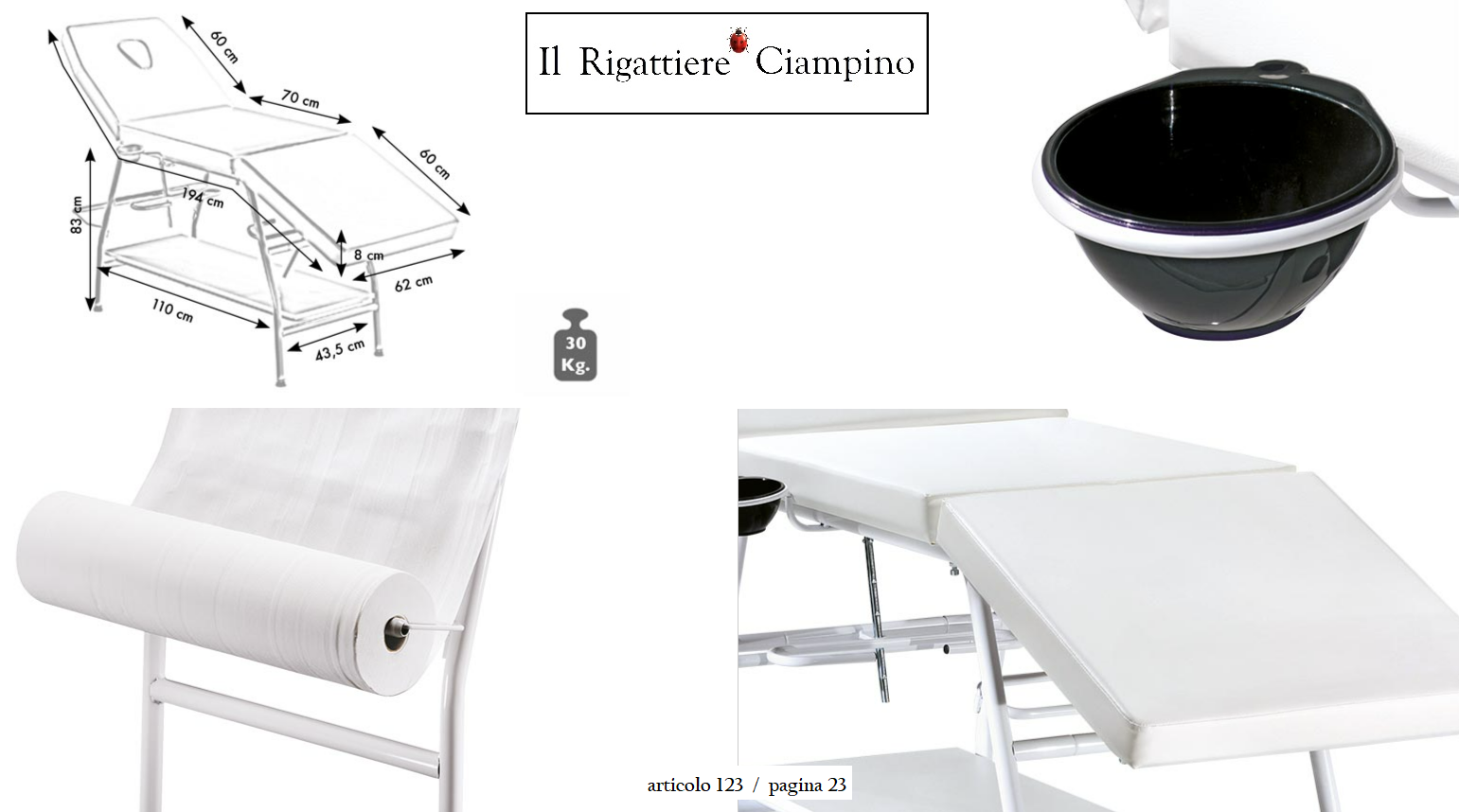 Questo lettino offre una gran flessibilità in termini di regolazioni in diverse gradazioni, presenta un ripiano in legno e un porta rotolo e una ciotolina, che si può posizionare in ambo i lati, removibili.