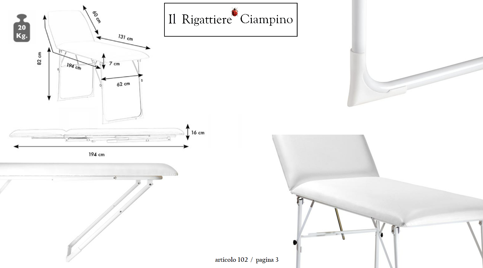 Il Rigattiere Ciampino propone un lettino per massaggi con struttura in acciaio diametro 22 mm verniciato a polvere epossidica colore bianco, che riesce a sopportare un peso massimo di 310 kg.