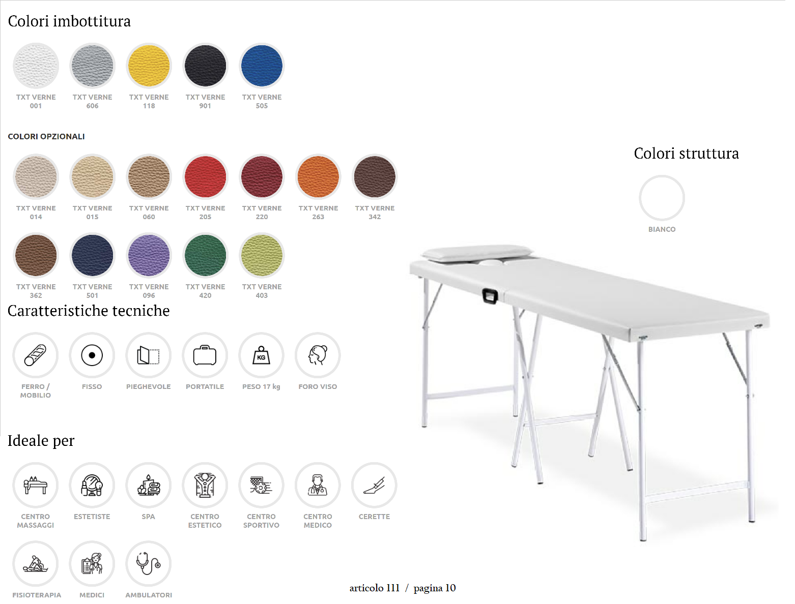 La struttura del lettino in acciaio è molto robusta, nonostante il suo peso sia solo di 17 Kg, caratteristiche consigliate per essere posizionato o trasportato in qualsiasi ambiente, con estrema facilità. A richiesta si può avere la custodia per proteggere il lettino portatile durante il trasporto.