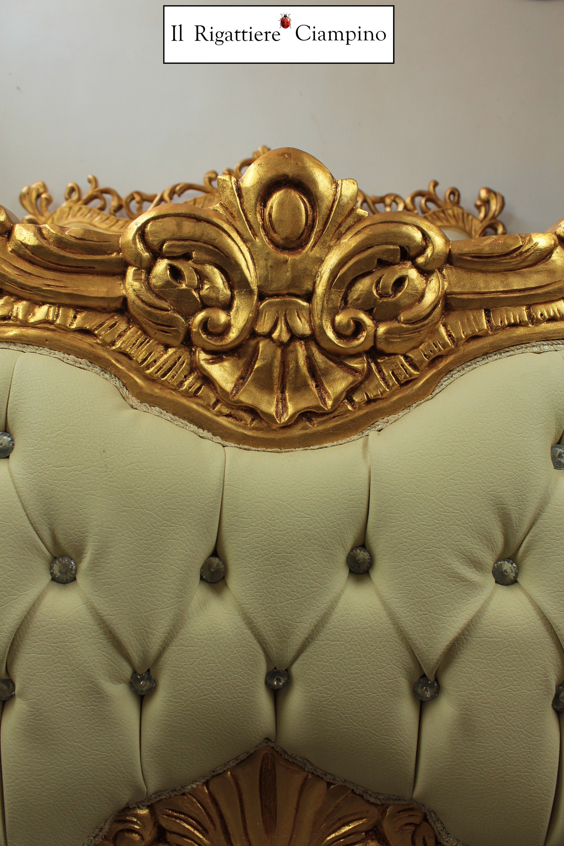 Il Rigattiere Ciampino propone un magnifico letto barocco traforato, luminoso e d'impatto. Lavorazione capitonné su schienale e pediera, rivestimento in ecopelle tirata con bottoni Swarovski. Struttura in foglia oro, traforata.