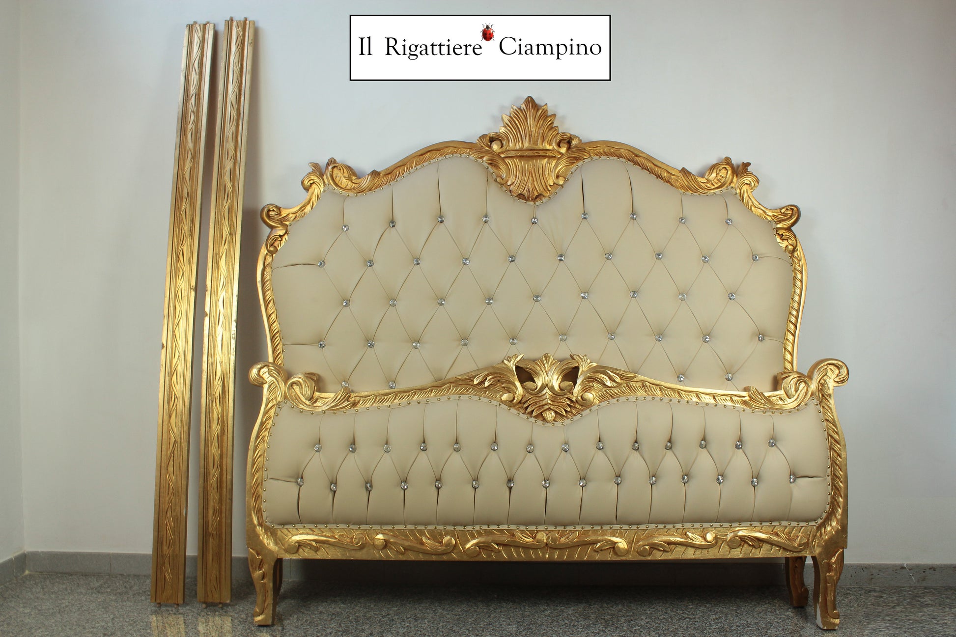 Il Rigattiere Ciampino propone questo letto matrimoniale modello Vittoria, con struttura in foglia oro con rivestimento in ecopelle colore avorio trapuntata con lavorazione Capitonné di produzione personale e artigianale, realizzato da tappezzieri. Bottoni Swarovski. Per donare eleganza e luce alla tua camera da letto.