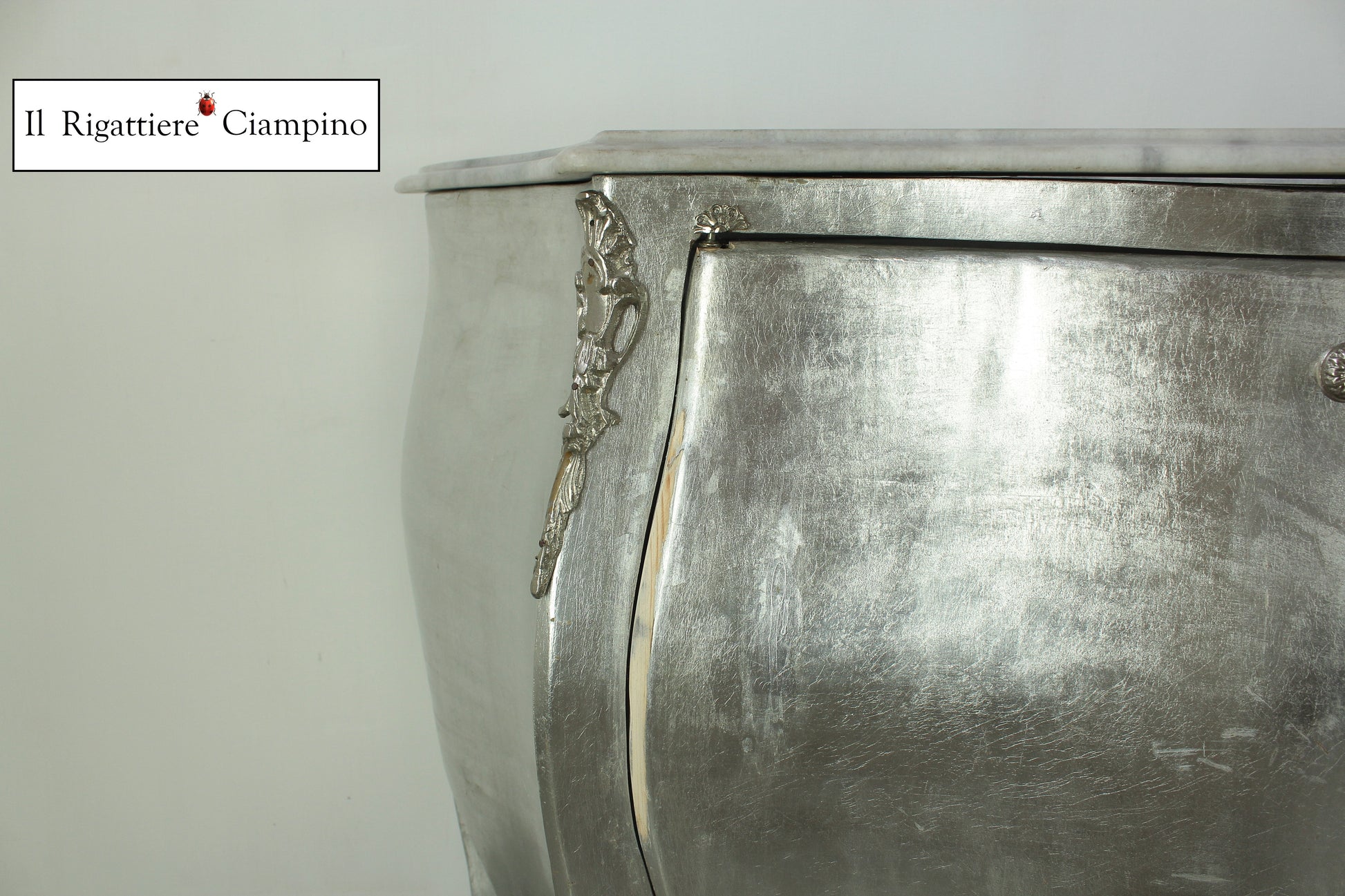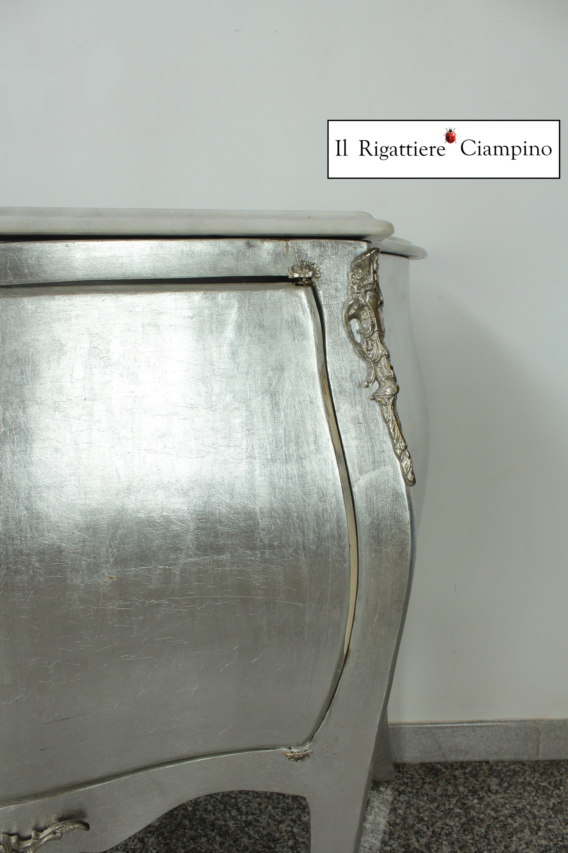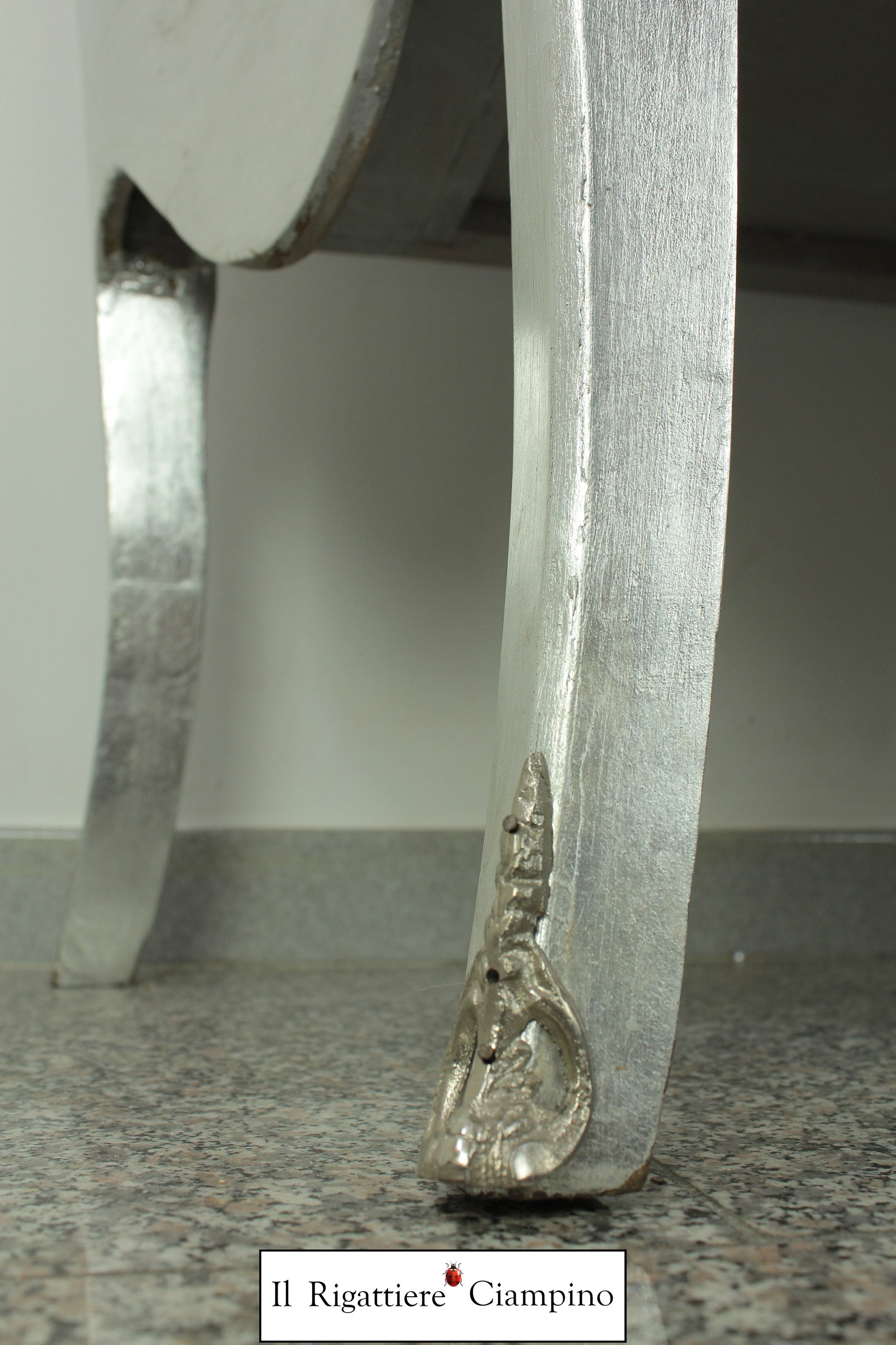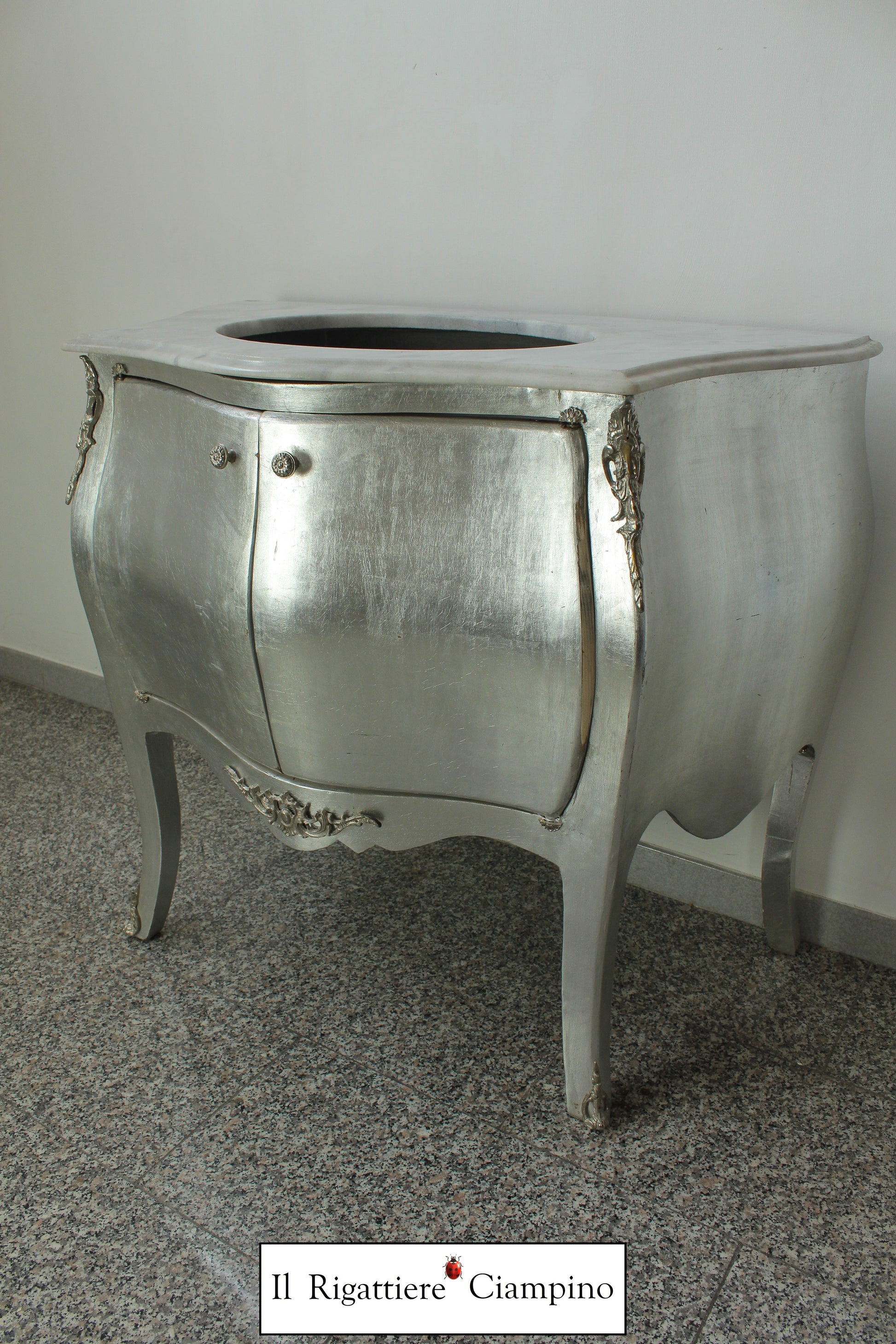 Il Rigattiere Ciampino propone un mobile bagno in legno massello, di colore argento, con piano superiore in marmo color avorio, piedini, pomelli e dettagli in ferro.