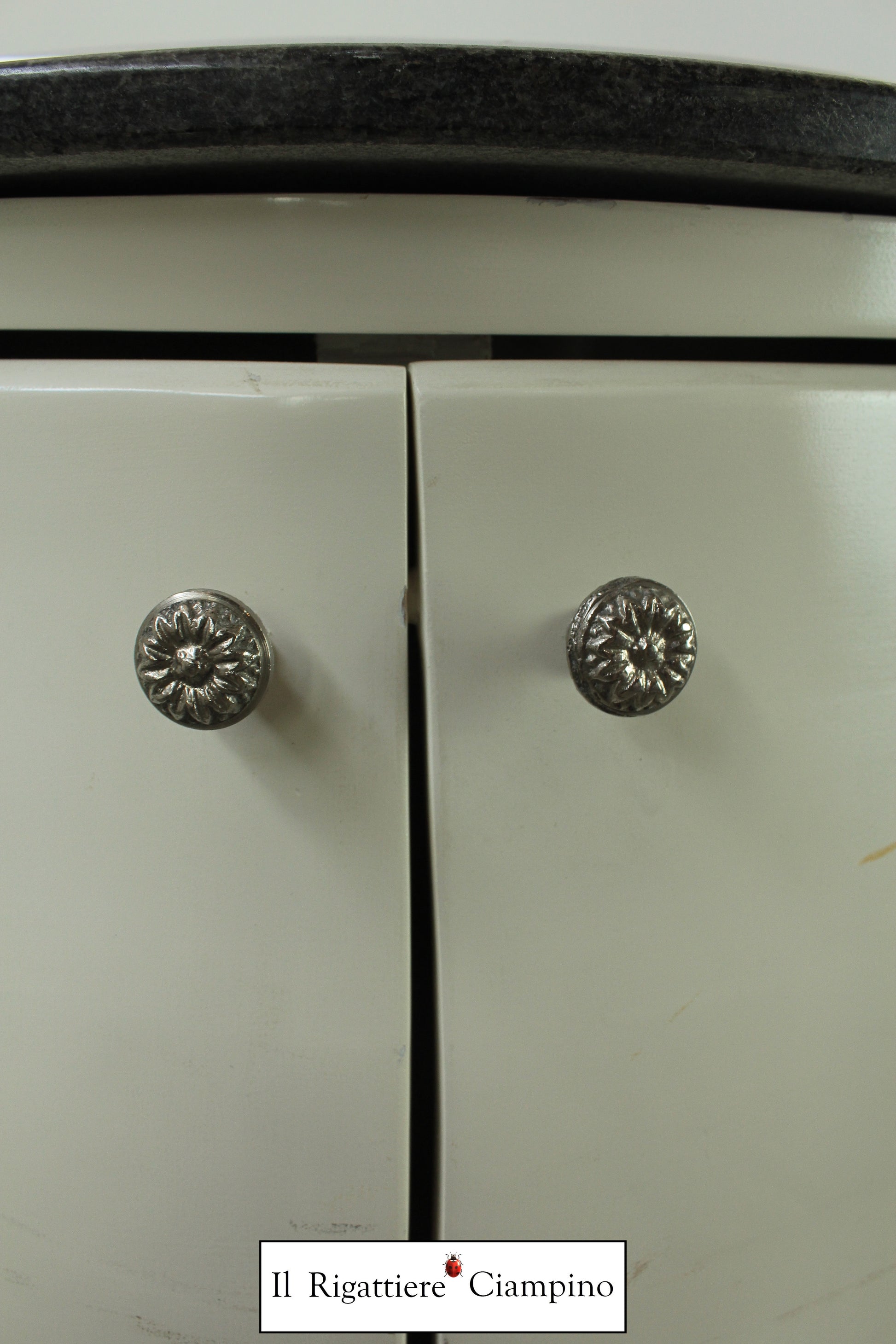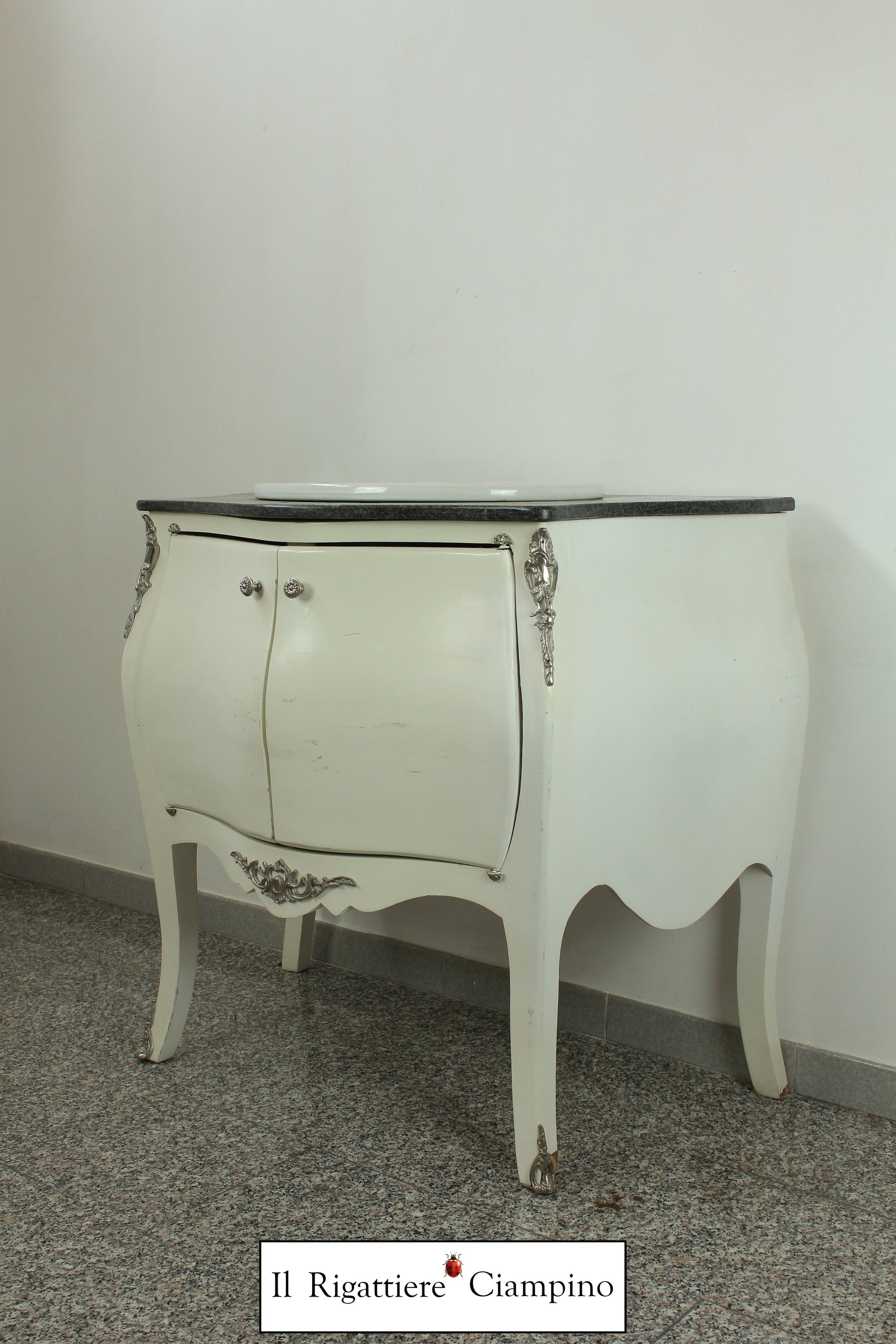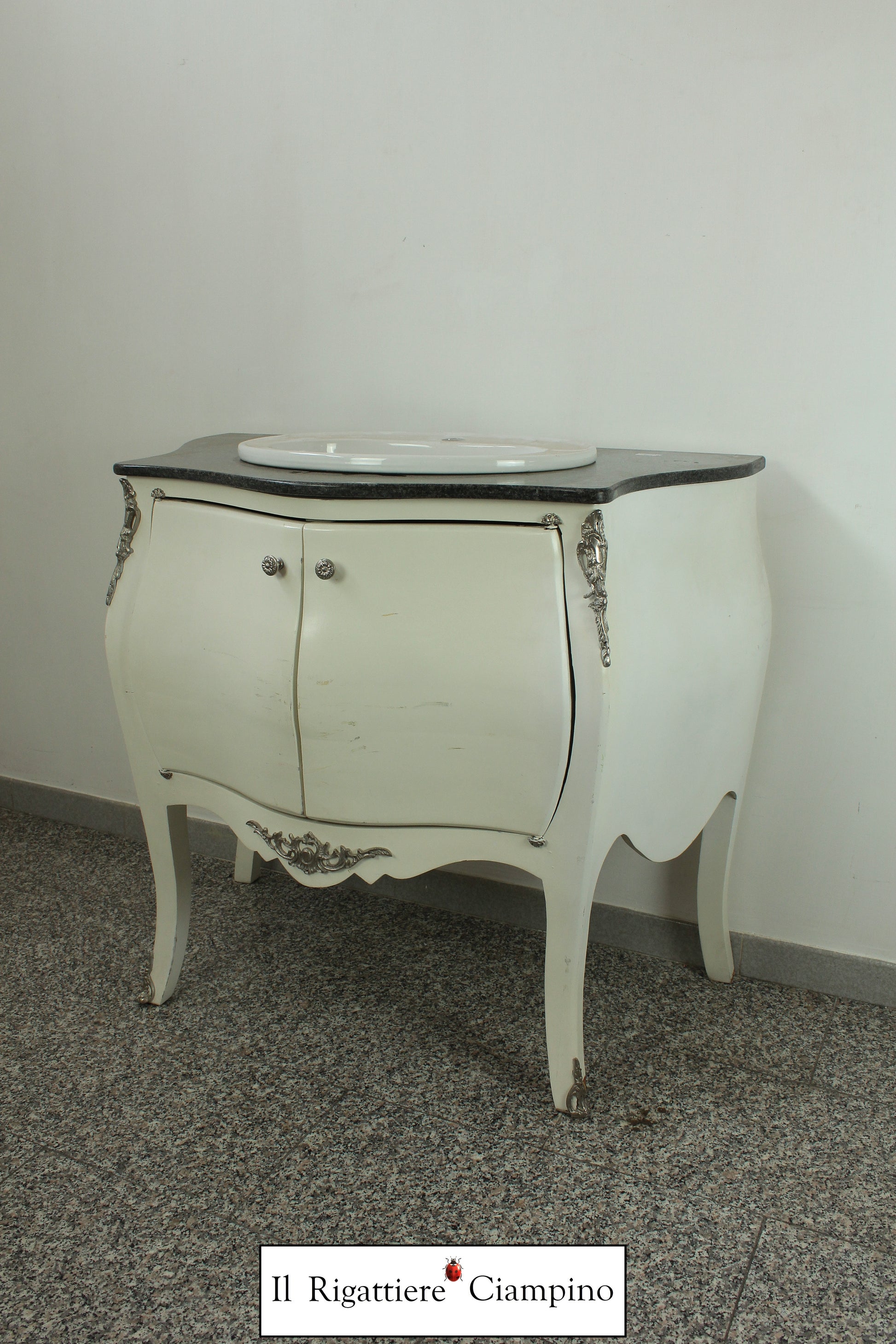Il Rigattiere Ciampino propone un mobile bagno in legno massello, di colore bianco, con piano superiore in marmo nero, piedini, pomelli e dettagli in ferro.