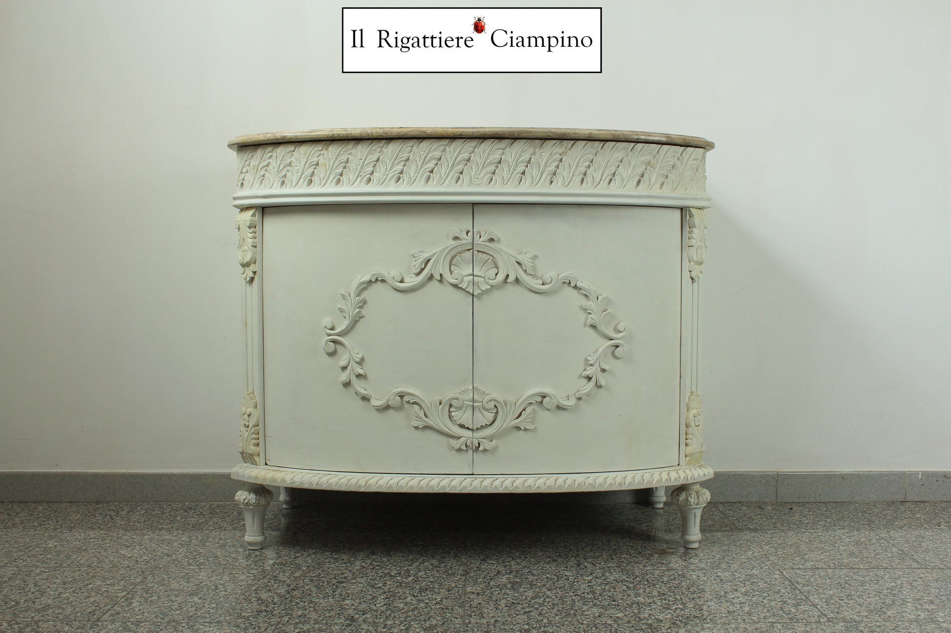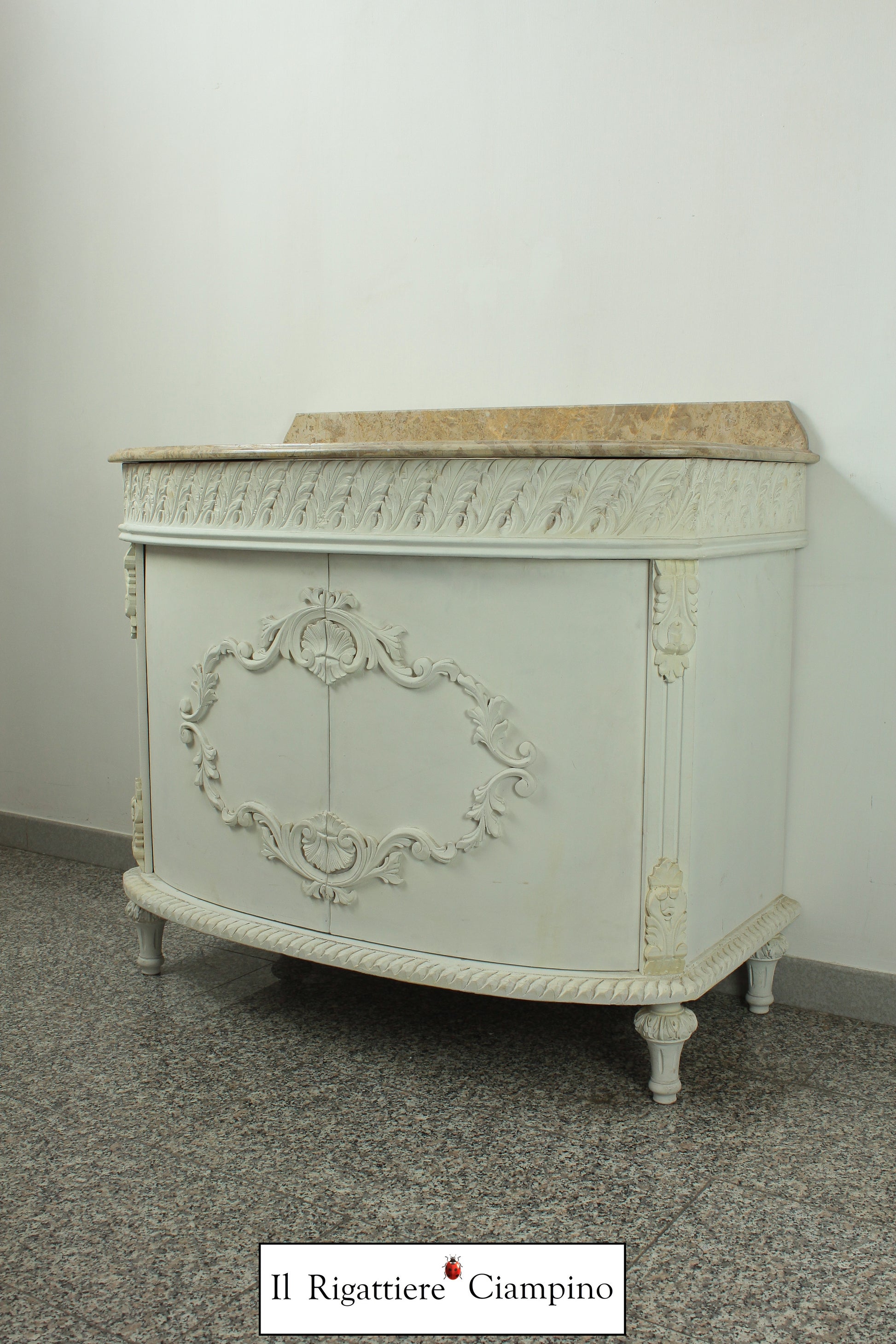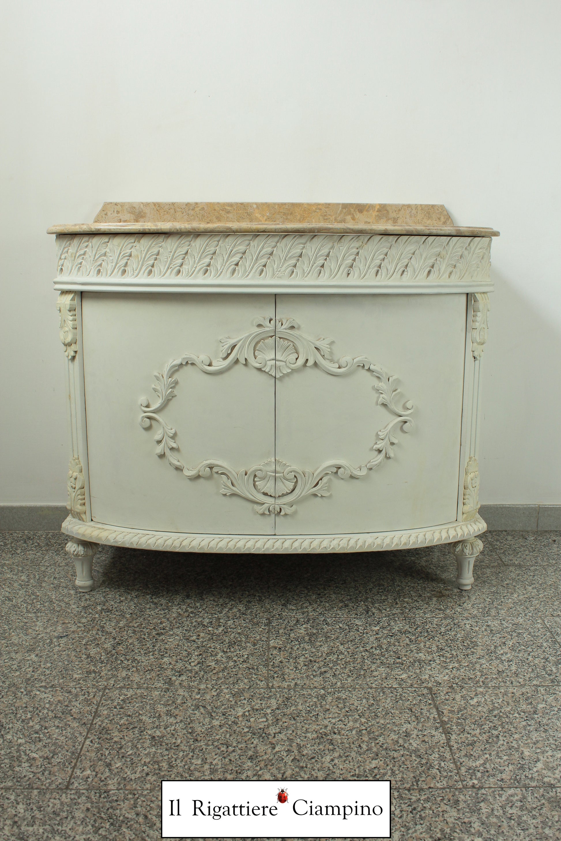 Il Rigattiere Ciampino propone un maestoso bagno con struttura bianca, con due sportelli, compreso di lavabo. Piano in marmo color avorio. Perfetto dare luce al tuo bagno!