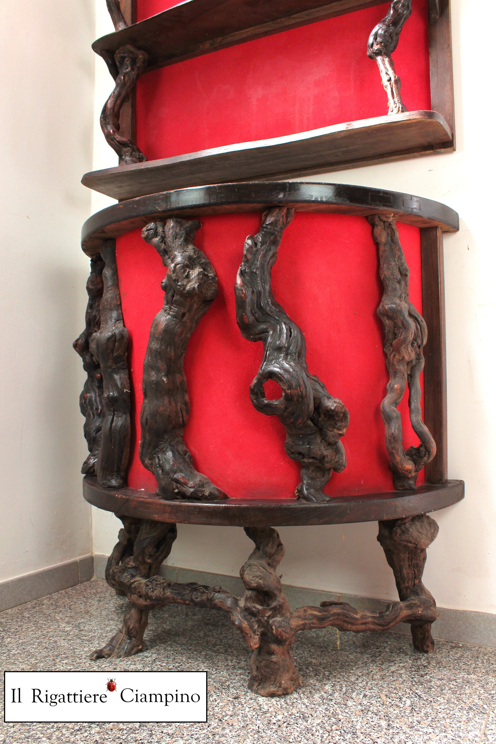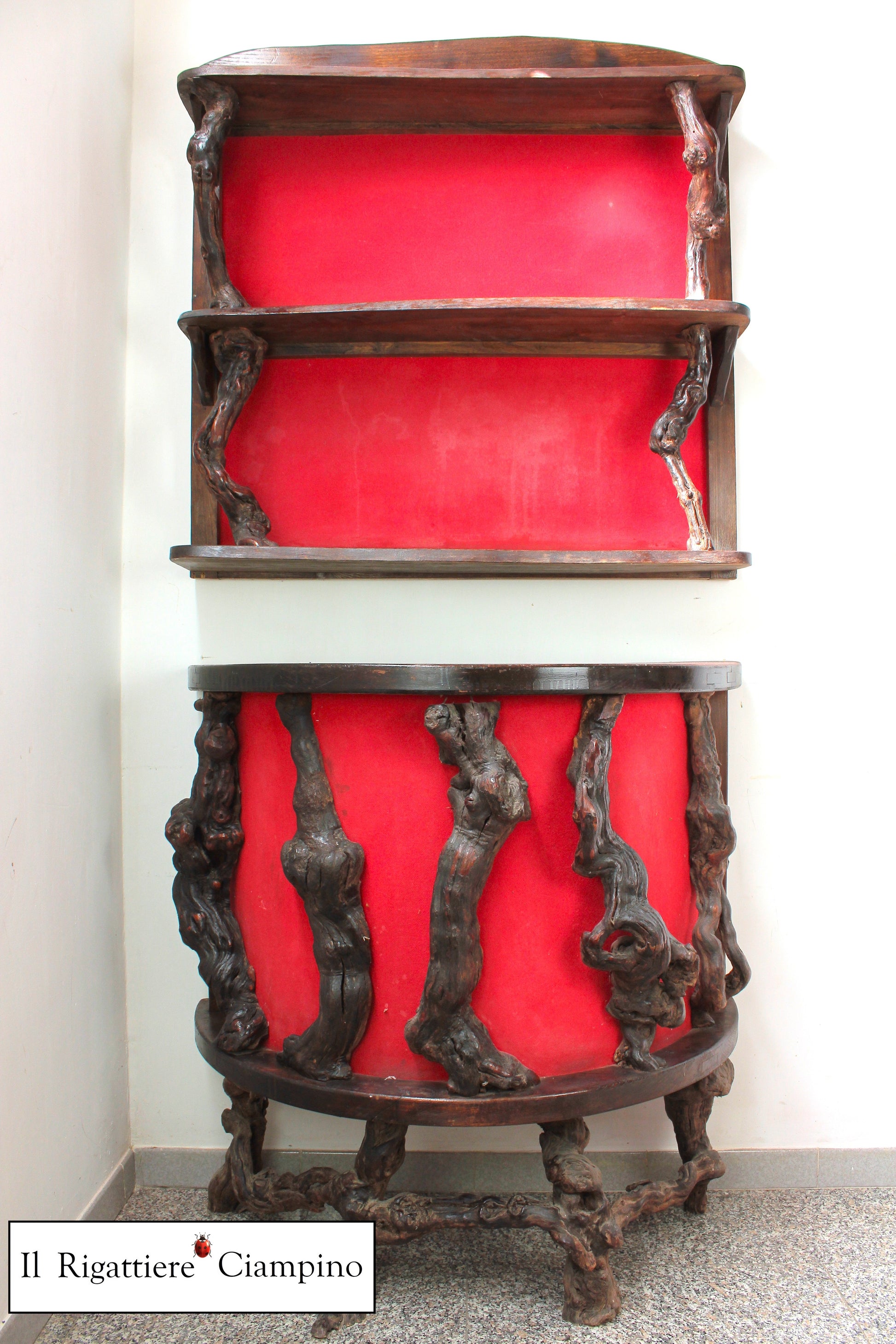 Il Rigattiere Ciampino presenta un mobile bar rustico in legno, composto da due pezzi. Struttura in legno massello. Nella parte inferiore sono presenti tre piani interni. La parte superiore ha due comodi ripiani, ed è predisposta per essere agganciata al muro in due punti. Sulla struttura sono presenti dei tronchi, per dare un effetto unico al mobile! Presente anche una stoffa rossa, che crea contrasto a questo Mobile Bar!