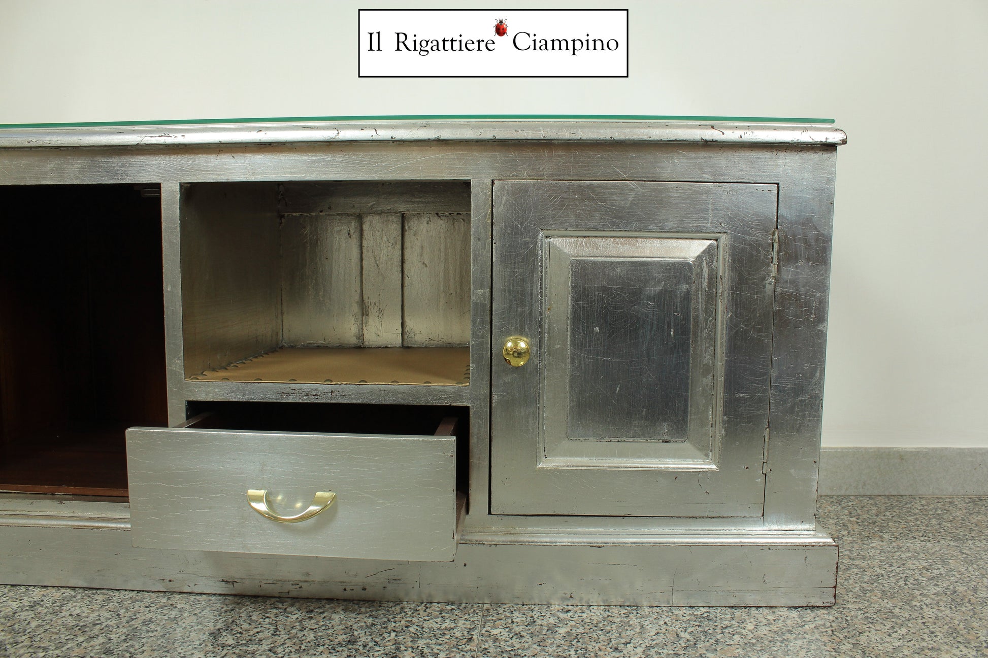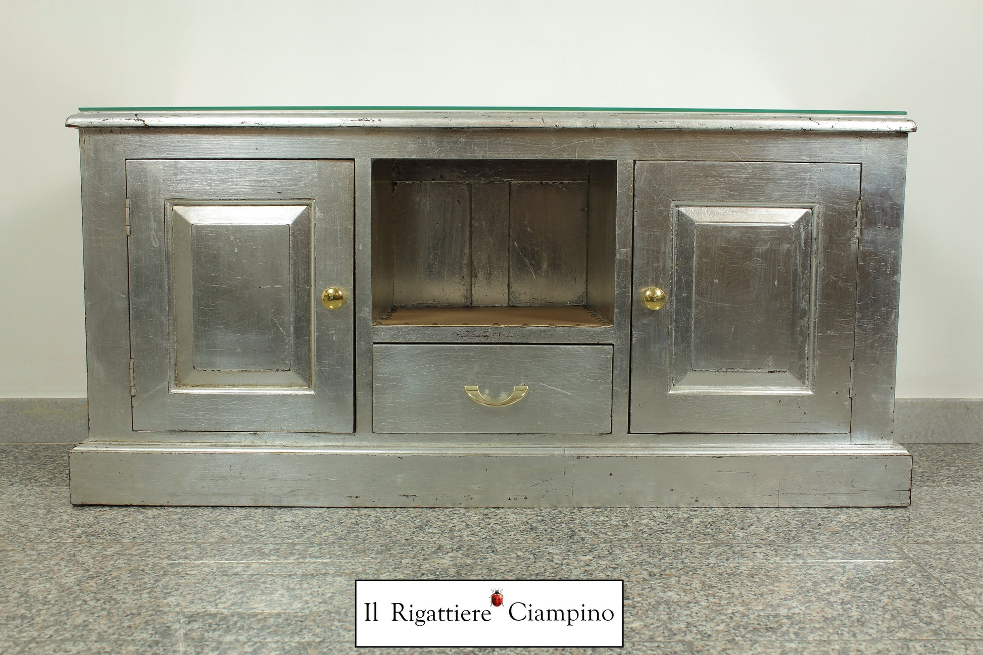 Il Rigattiere Ciampino propone un bellissimo mobile Porta-Tv, in foglia argento impreziosito da un piano in vetro trasparente, pomelli colore oro e ecopelle color oro su piano intermedio. Per dare luce al tuo salotto.