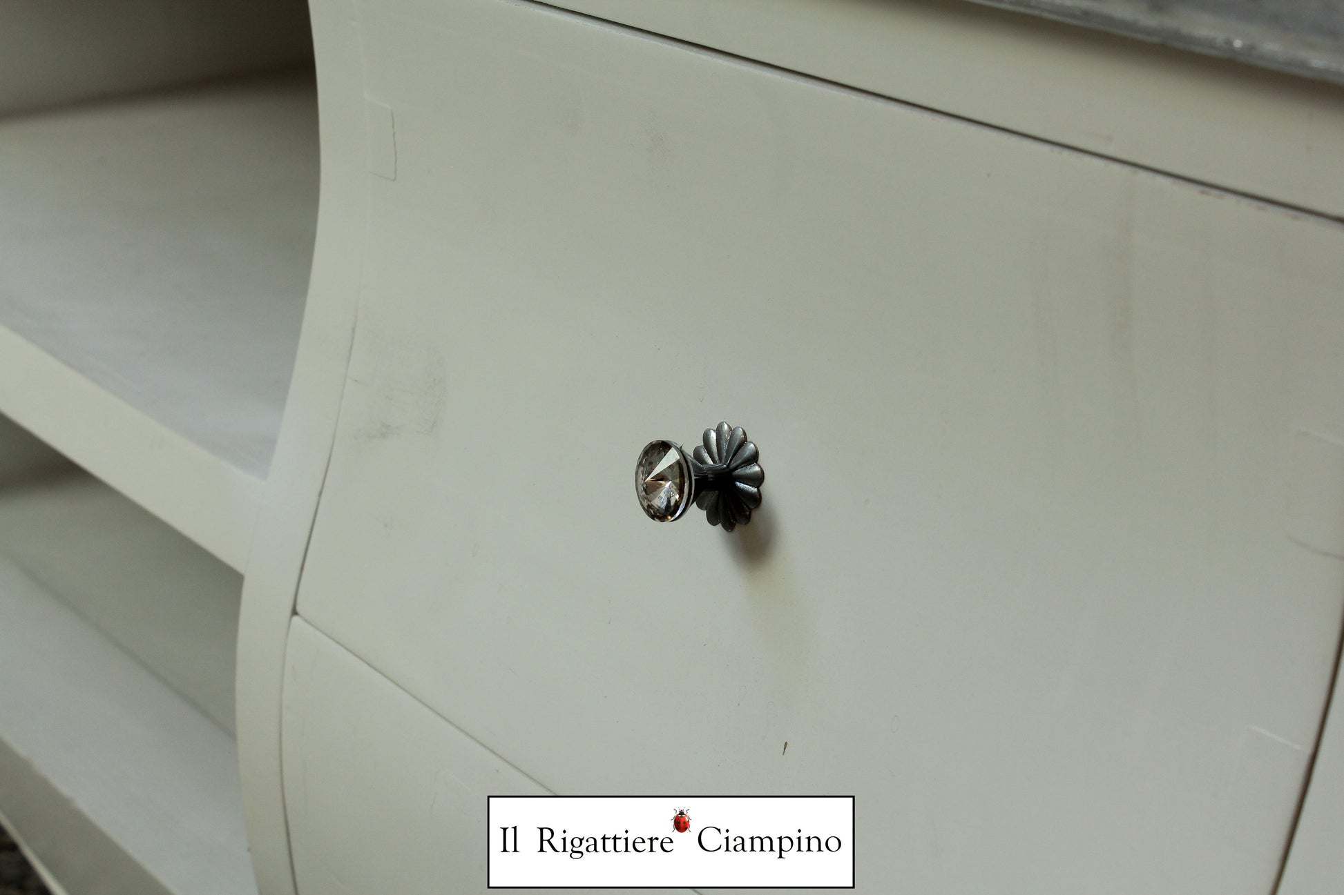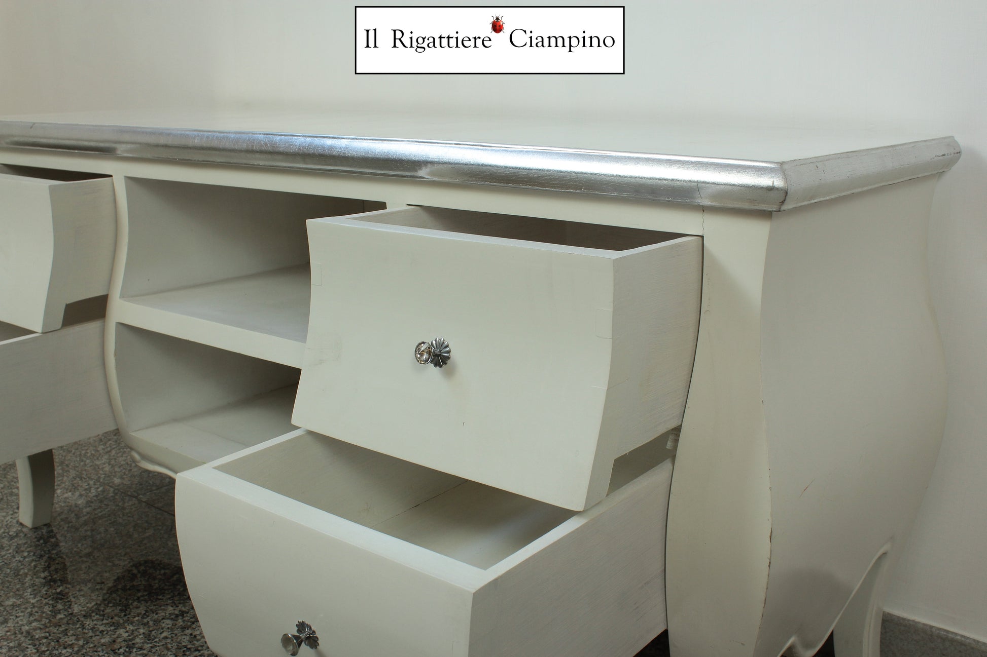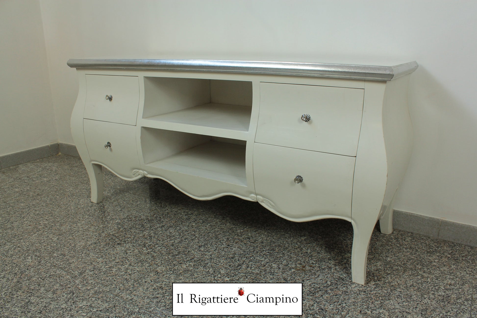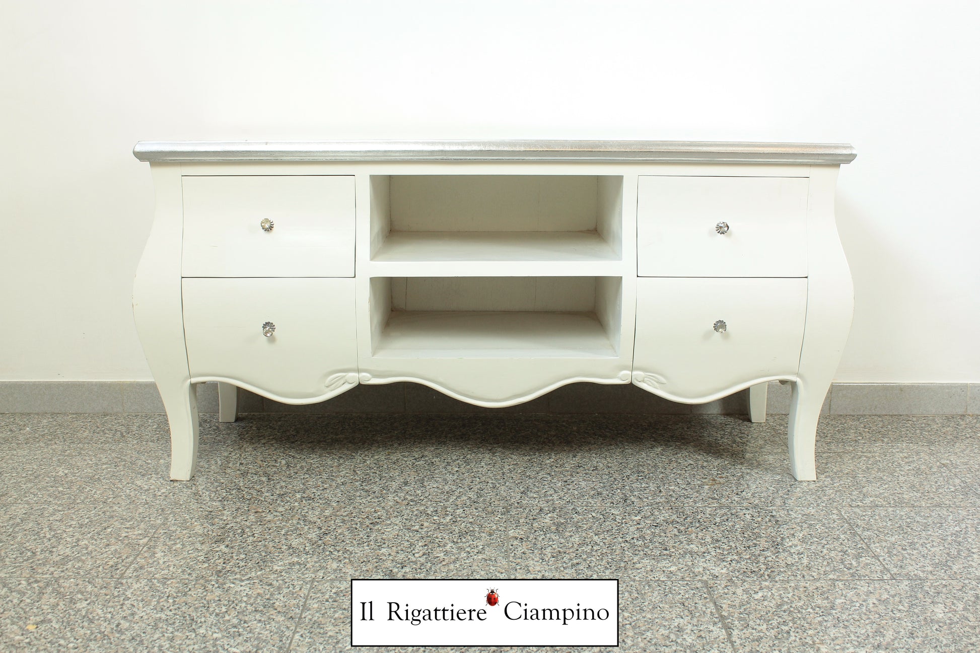 Il Rigattiere Ciampino propone un bellissimo mobile Porta-Tv, di colore bianco impreziosito con pomelli e rifiniture in foglia argento. Per dare luce al tuo salotto.