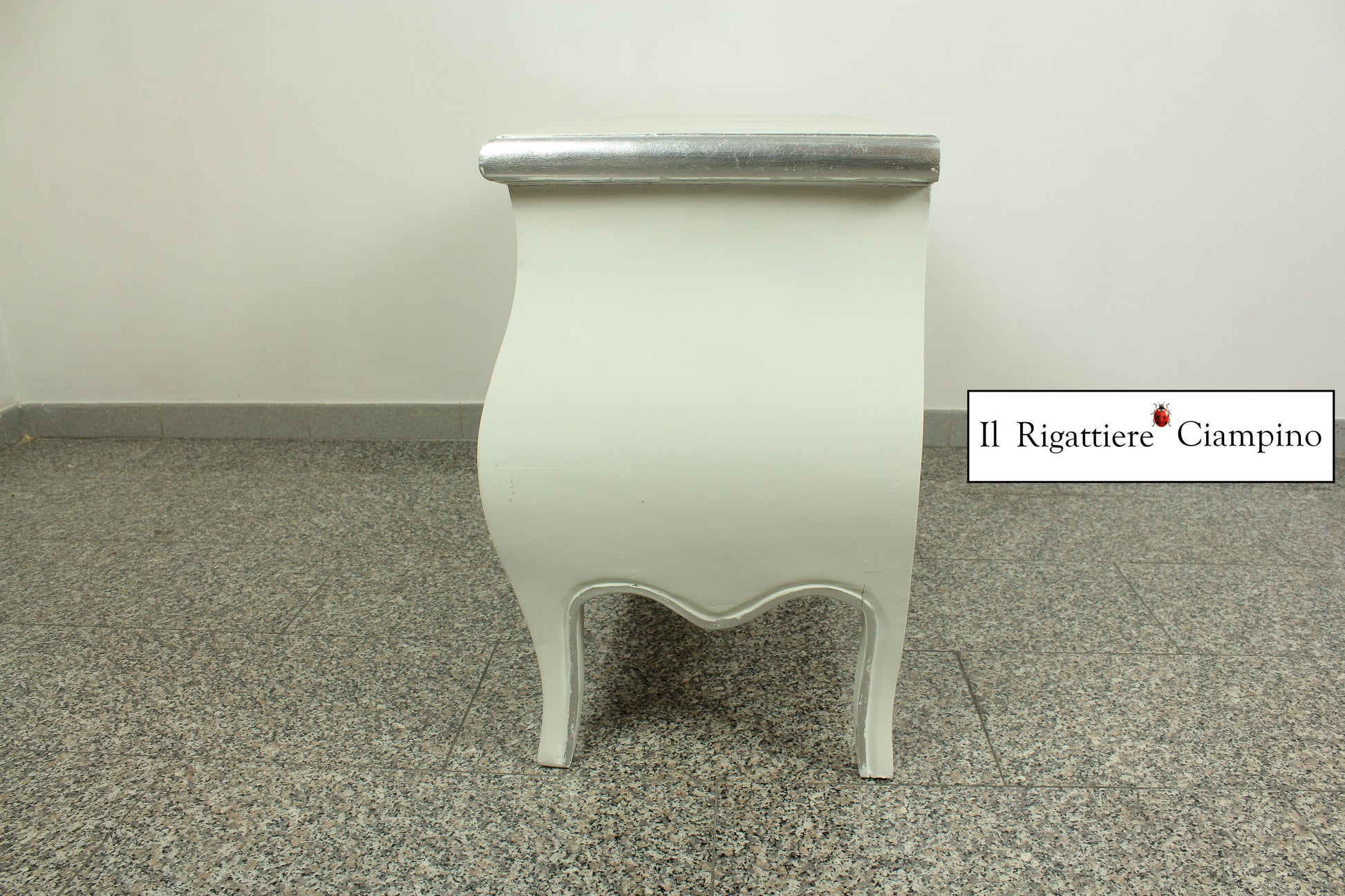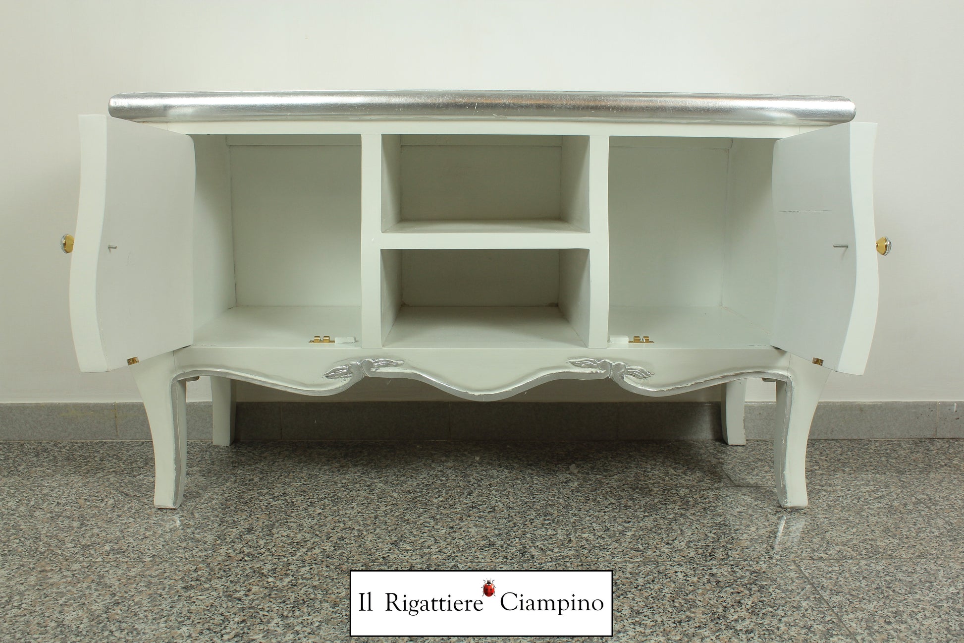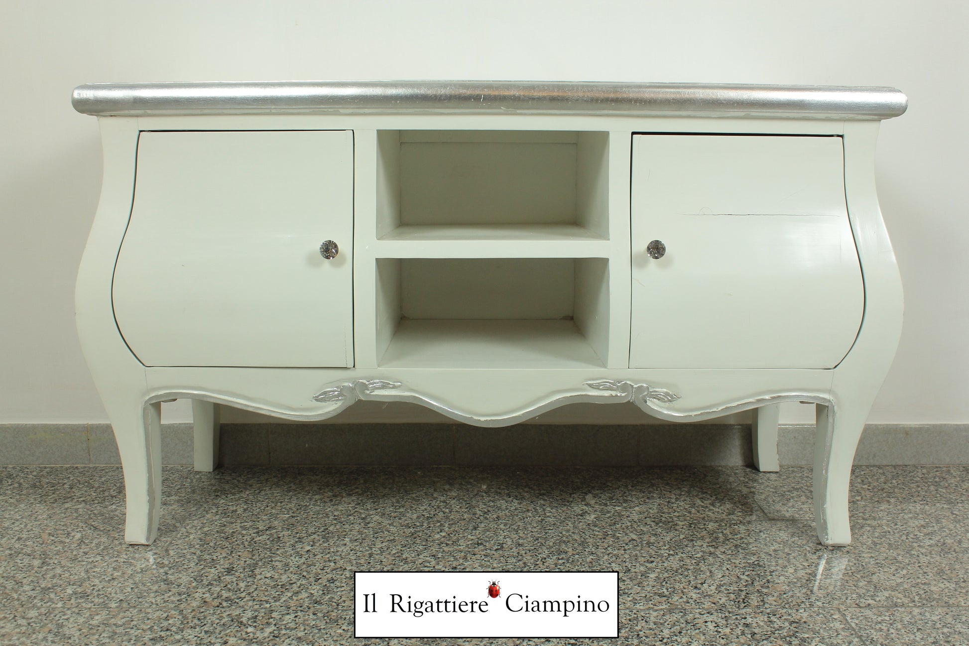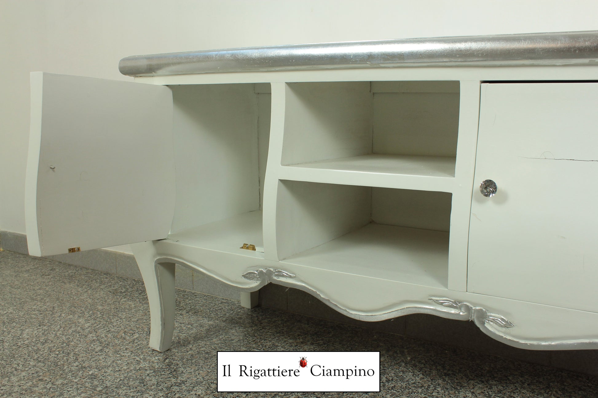 Il Rigattiere Ciampino propone un bellissimo mobile Porta-Tv, di colore bianco impreziosito con rifiniture e pomelli in foglia argento. Per dare luce al tuo salotto!