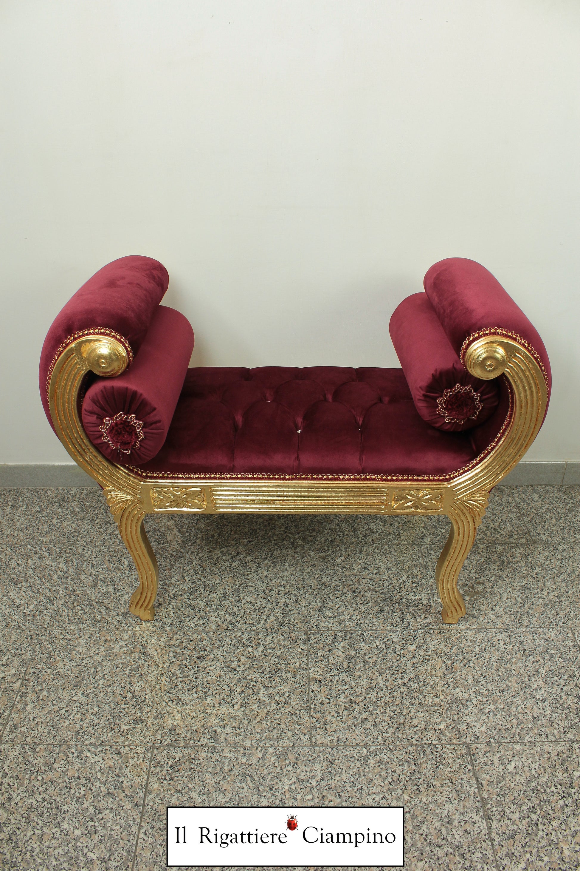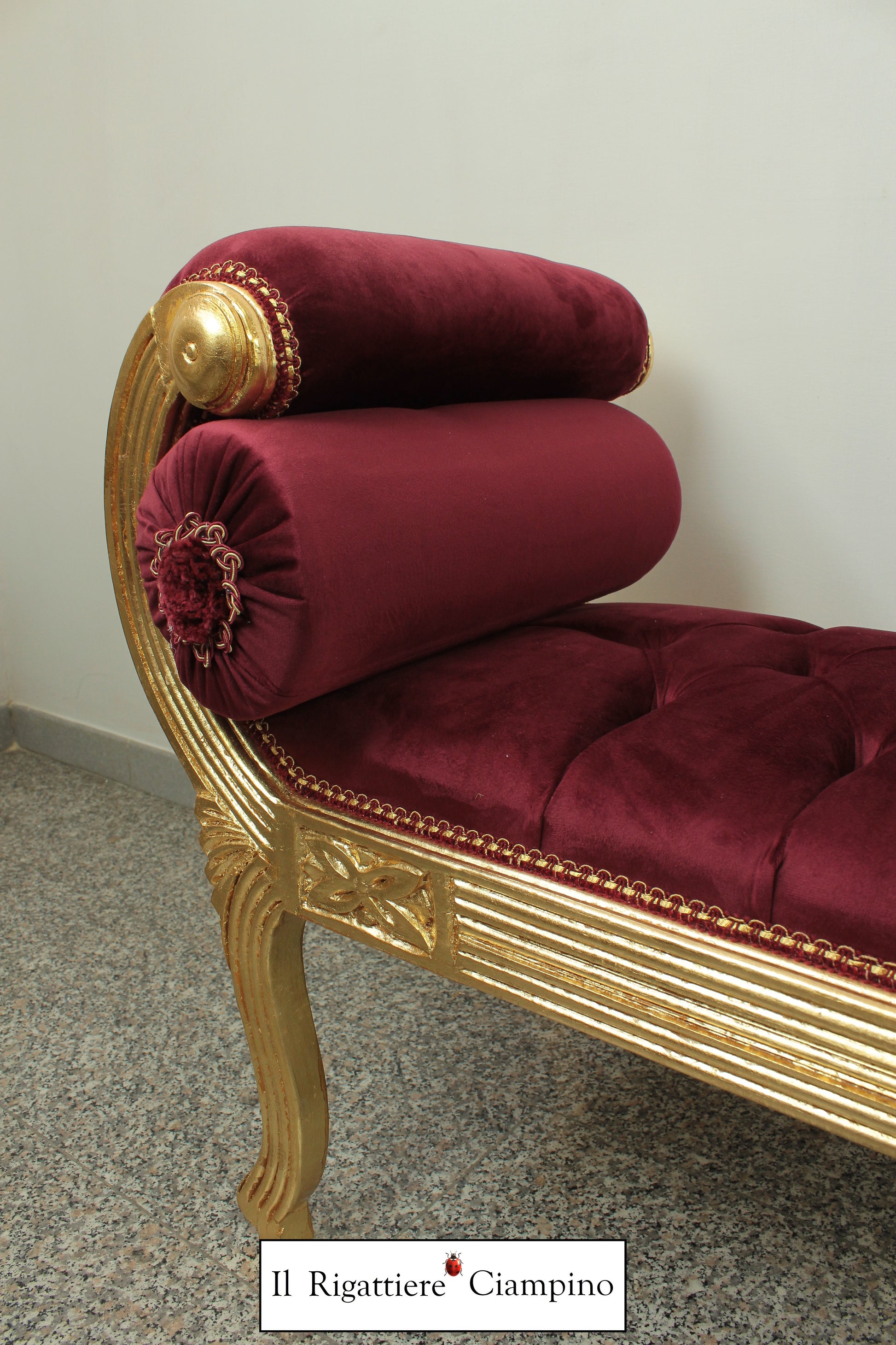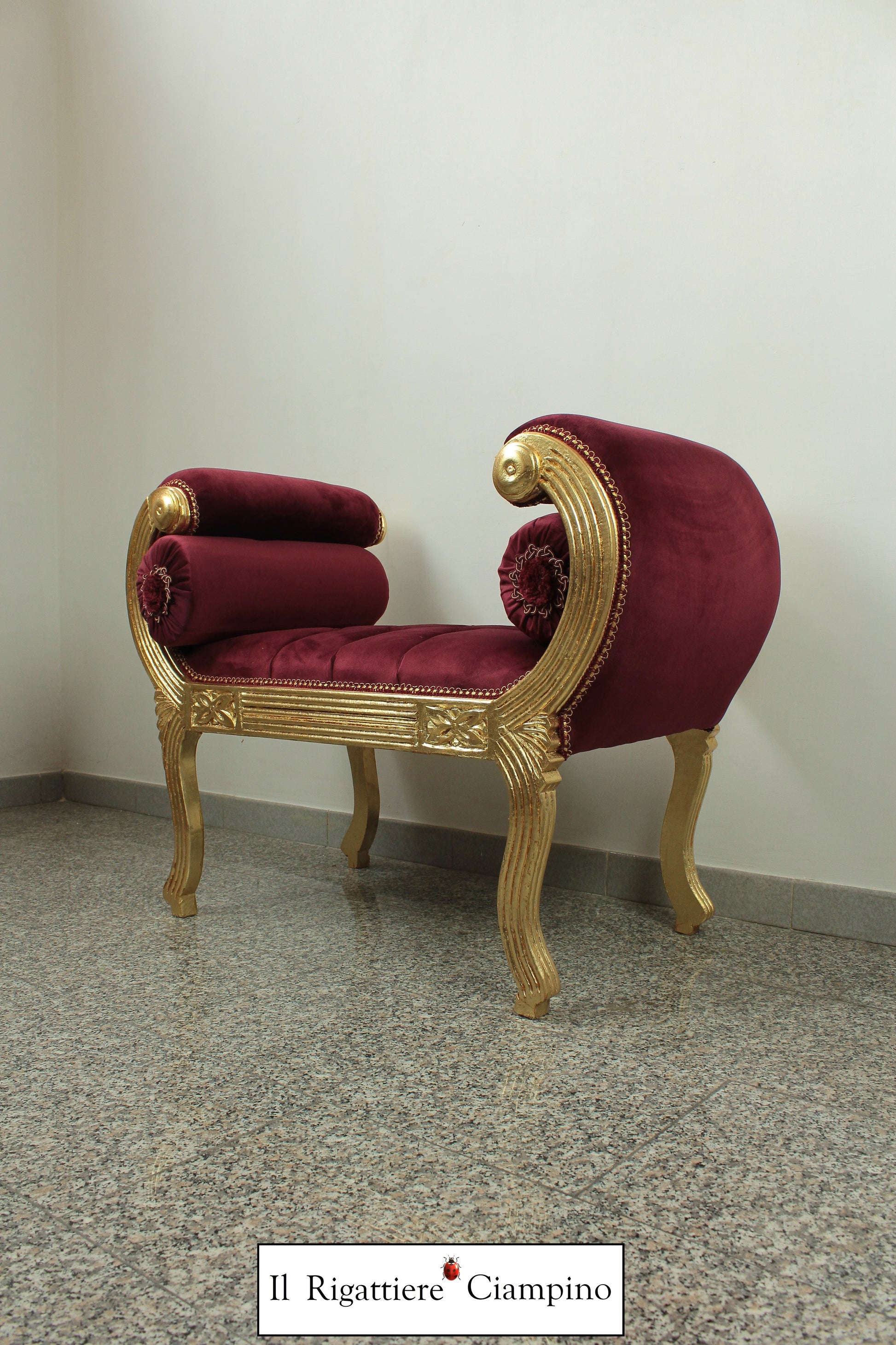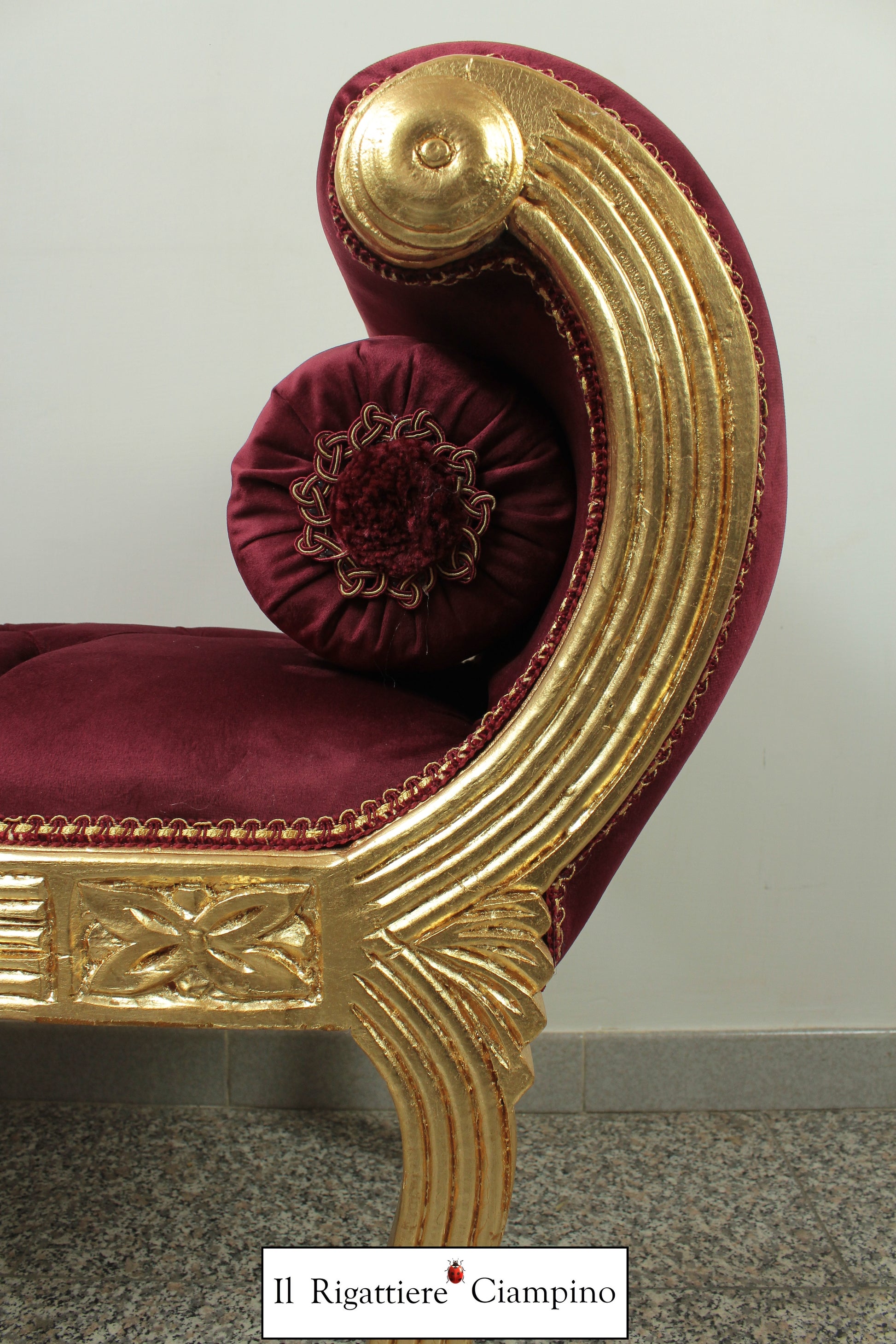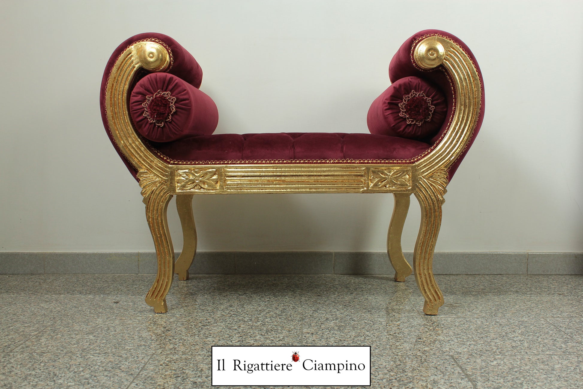 Panca da salotto in stile barocco, velluto bordeaux e foglia oro