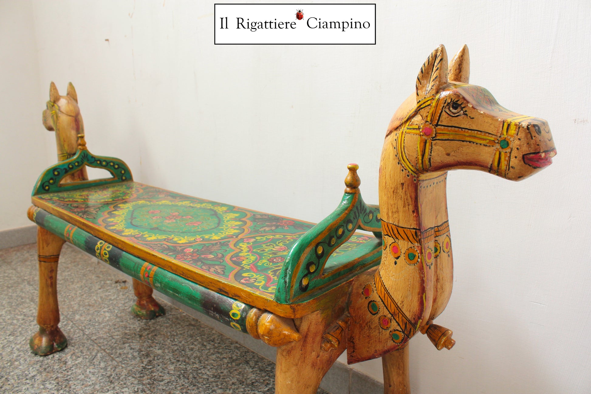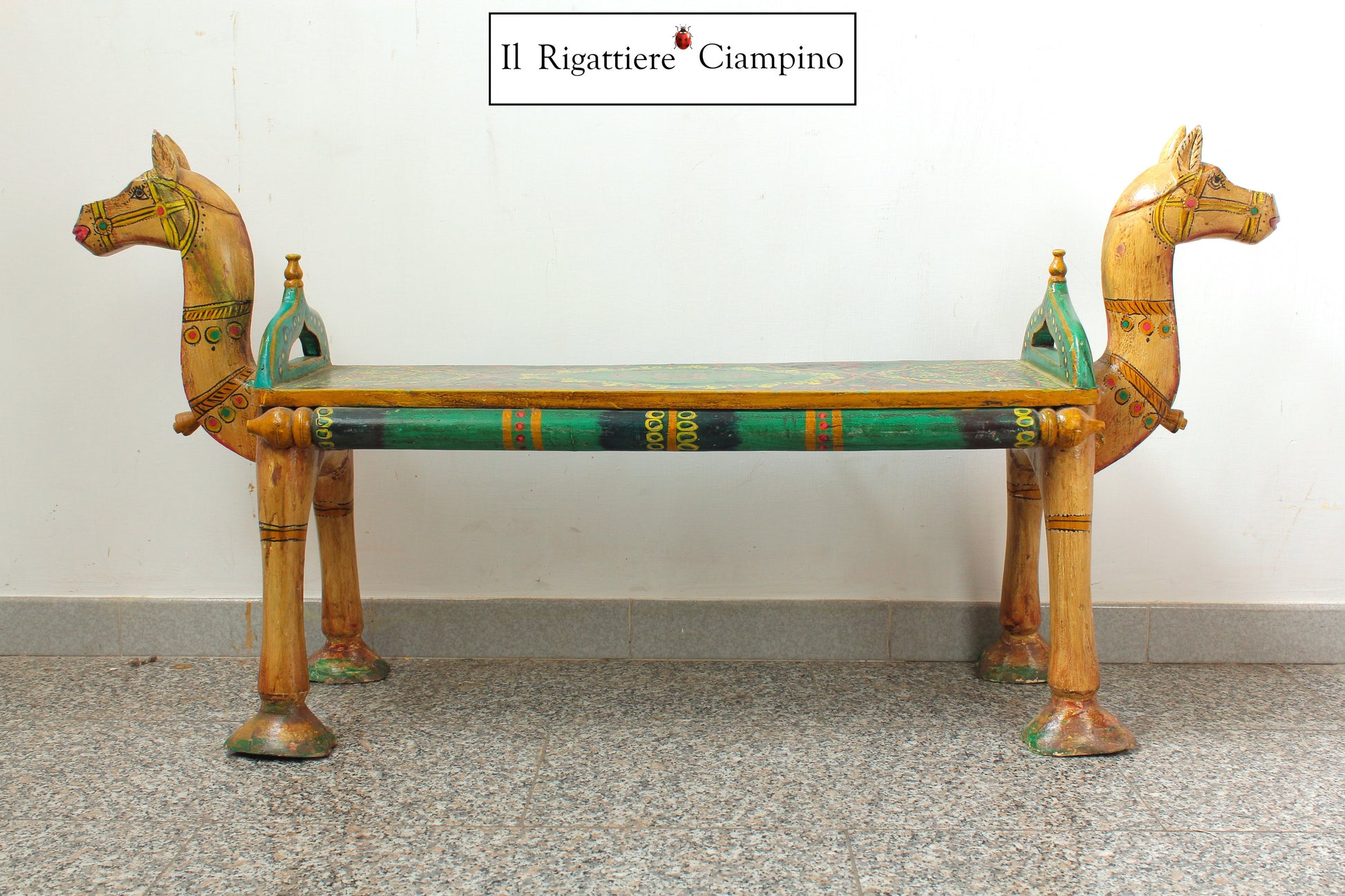 Il Rigattiere Ciampino propone una bellissima panca, a forma di cavallo, per due persone. Dona un tocco di colore al tuo ambiente, grazie alla sua struttura in legno colorato verde, giallo, rosso e marrone chiaro.