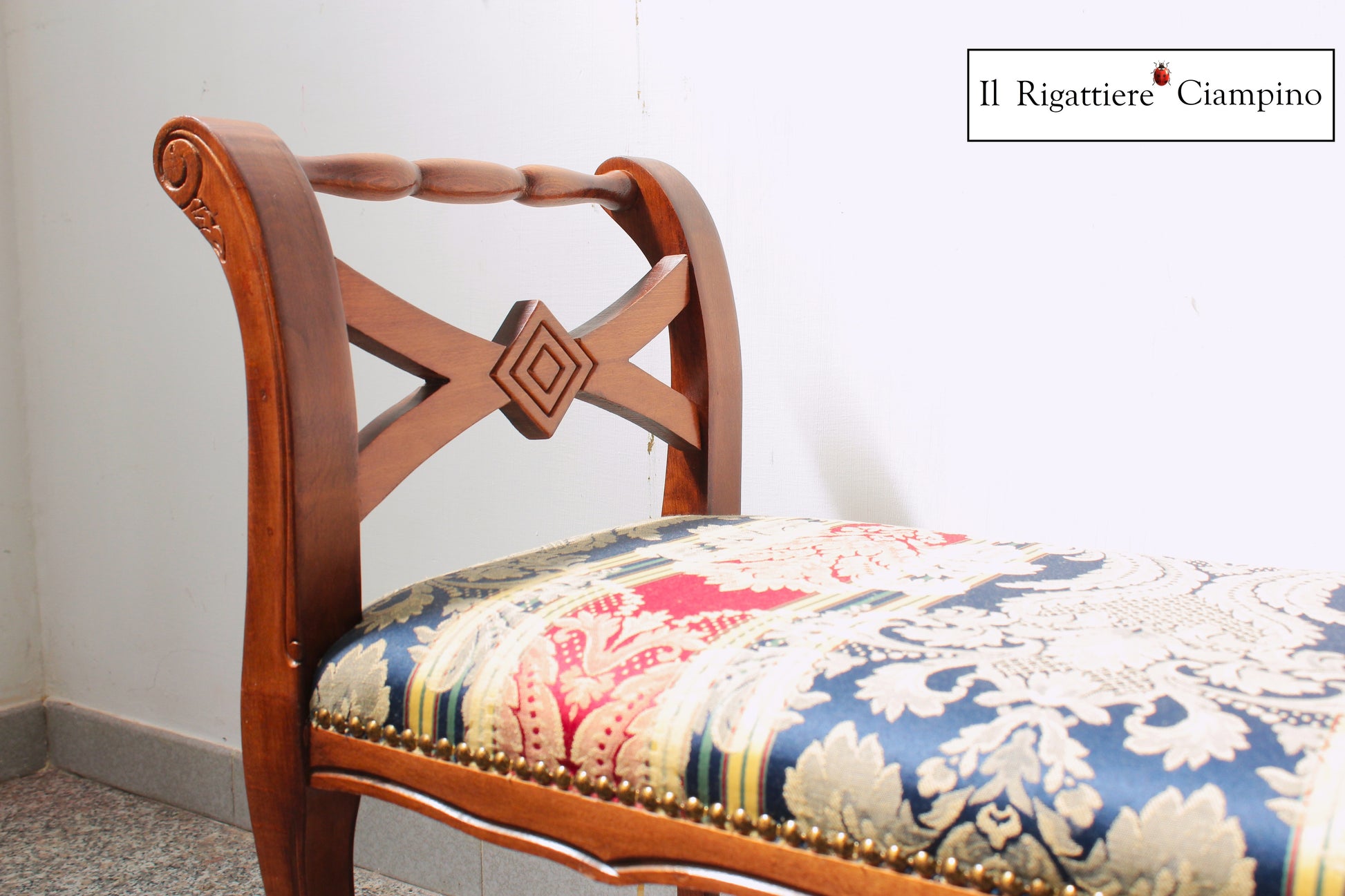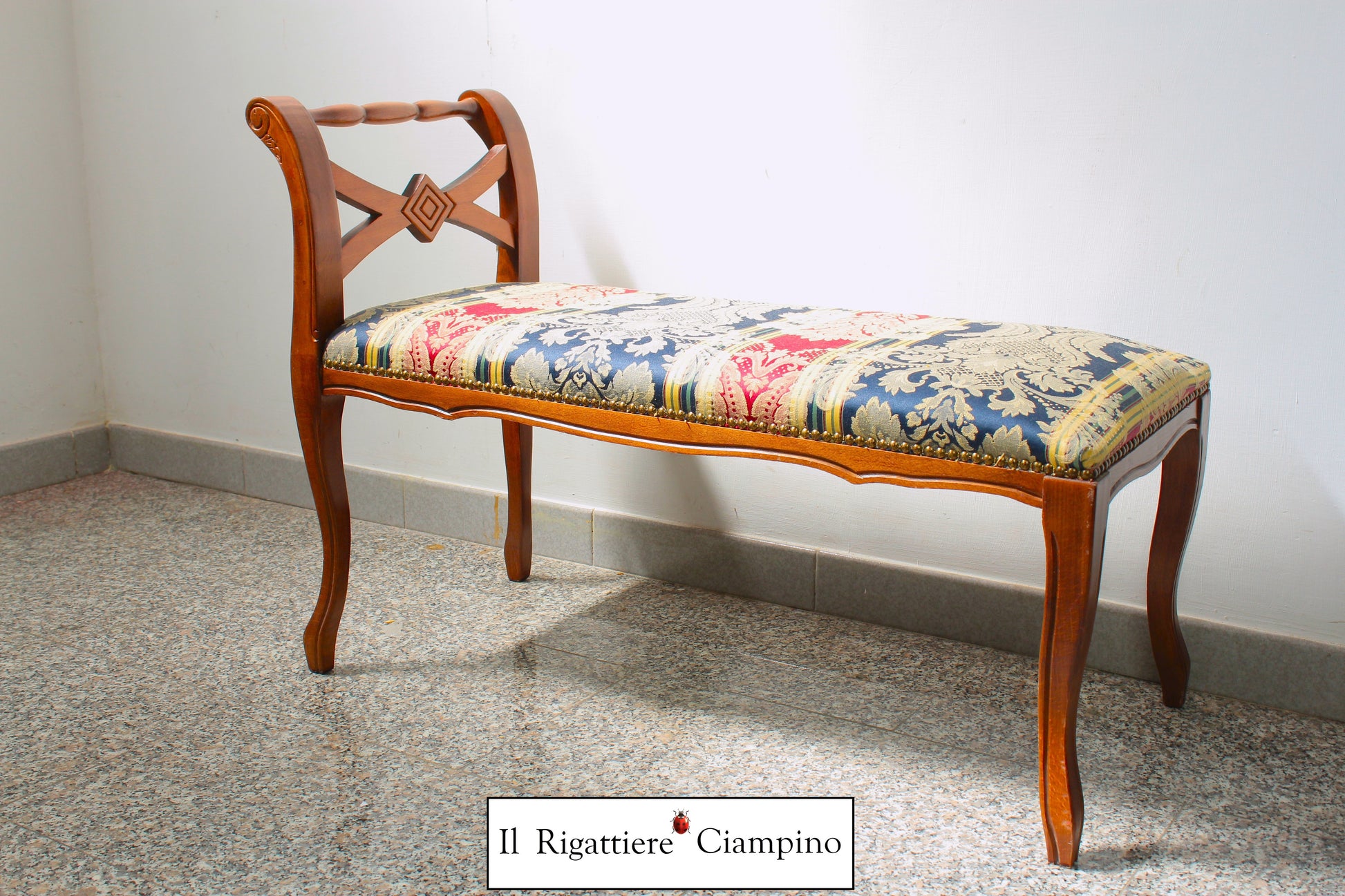 Il Rigattiere Ciampino propone una bellissima panchetta-divano in legno, in stile inglese, con rivestimento in cotone con disegno damasco di colore blu, avorio e rosso. Mobile usato.