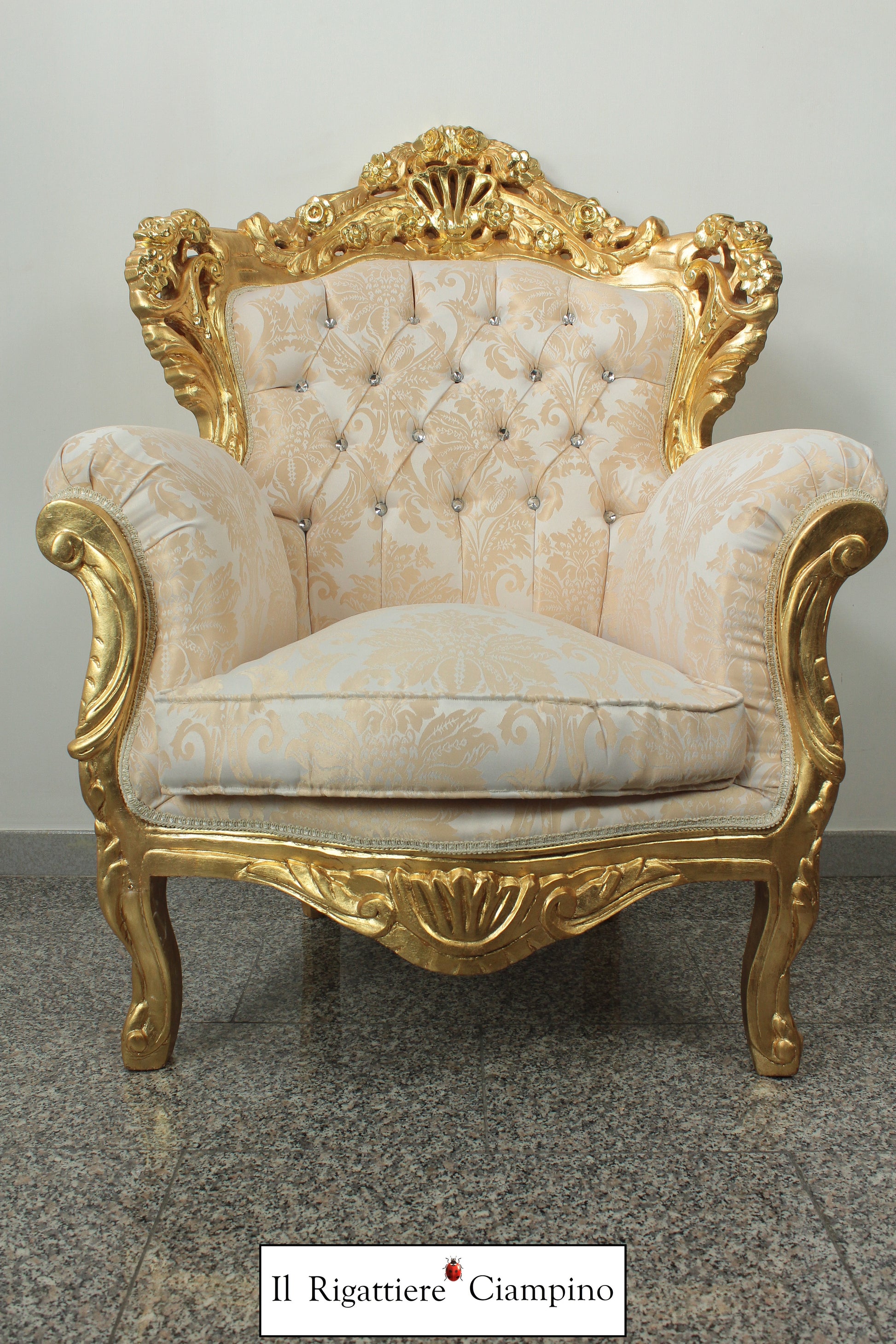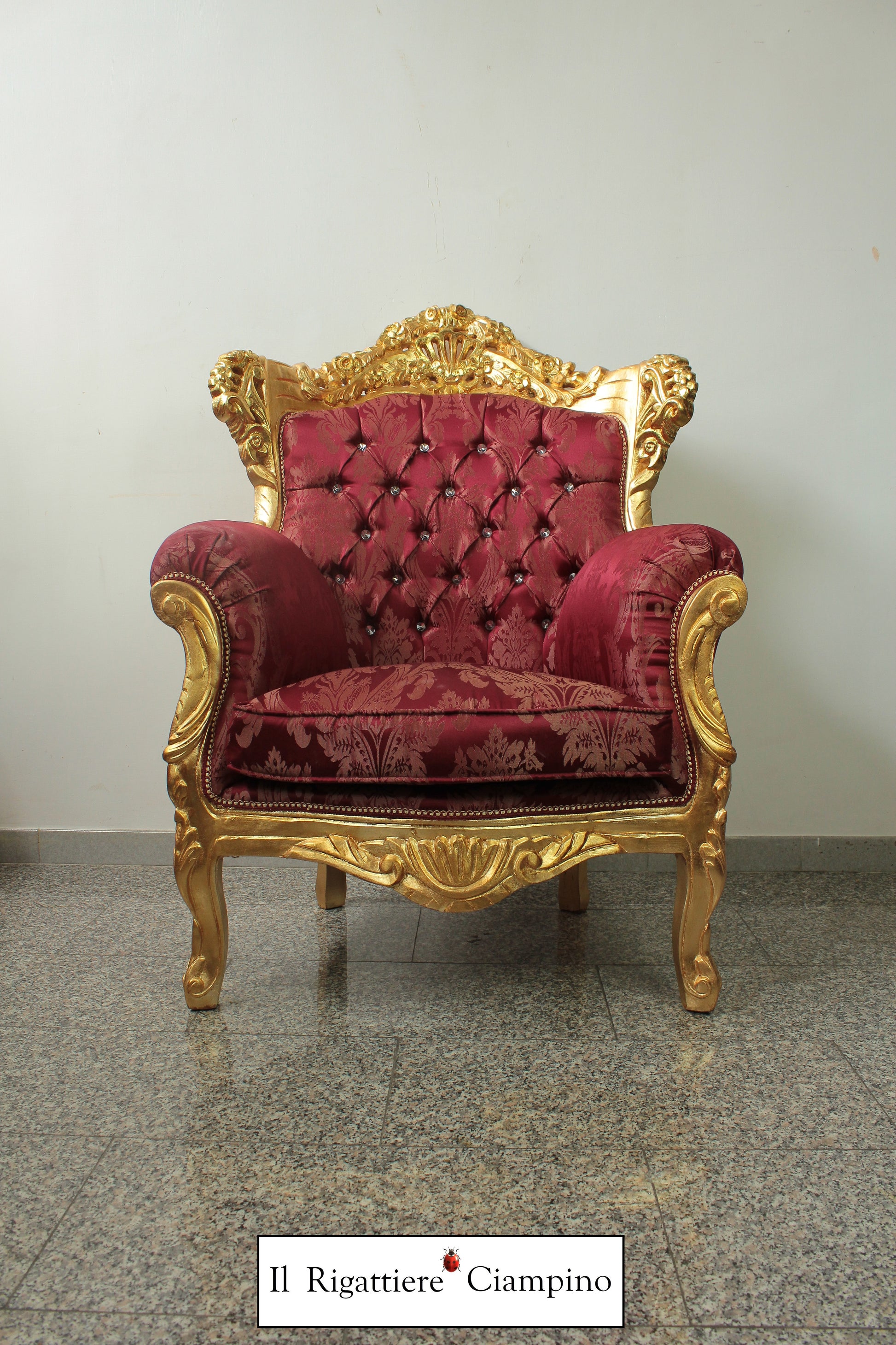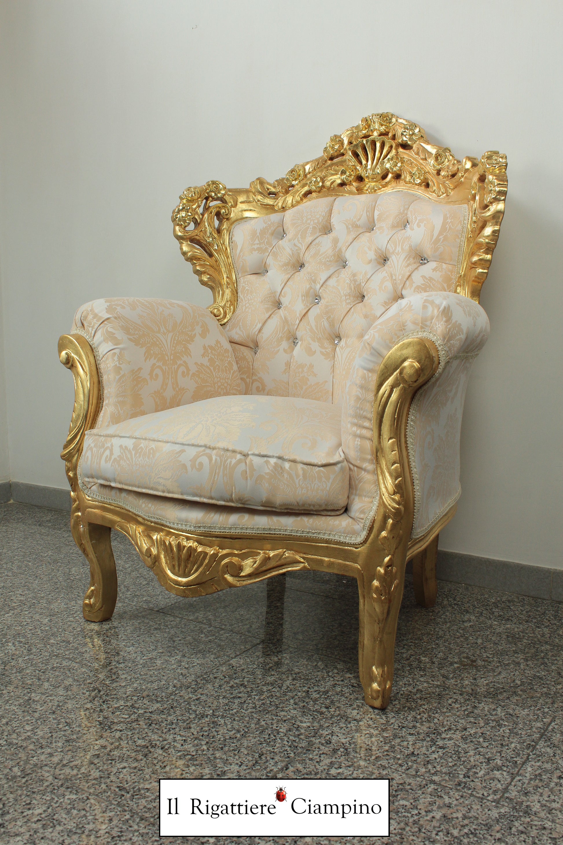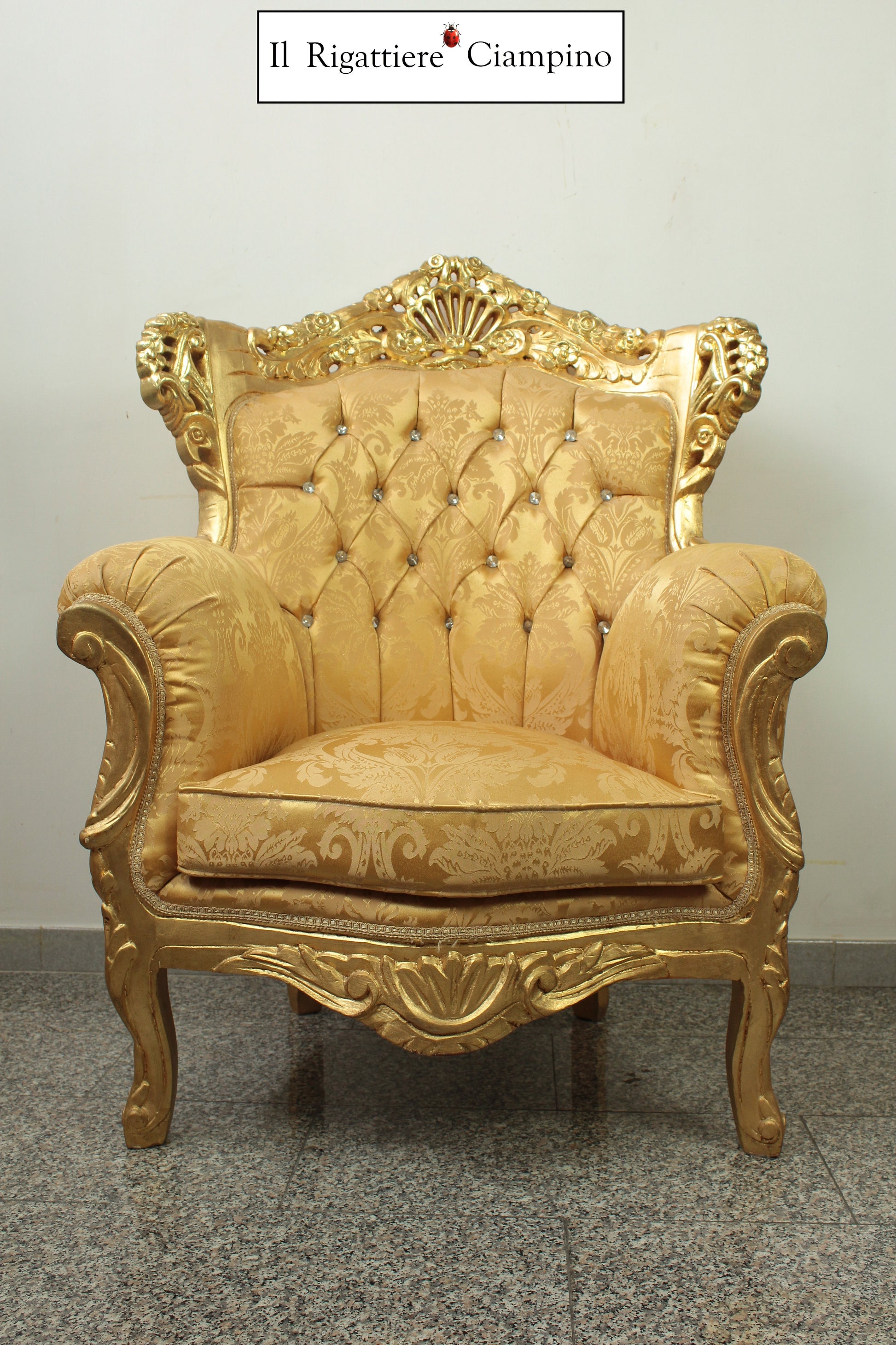 Il Rigattiere Ciampino propone una maestosa poltrona in stile Germany, con struttura in foglia oro, colore e rivestimento a scelta, trapuntato con lavorazione Capitonné, con bottoni Swarovski. Per donare un tocco d'importanza al tuo salotto.