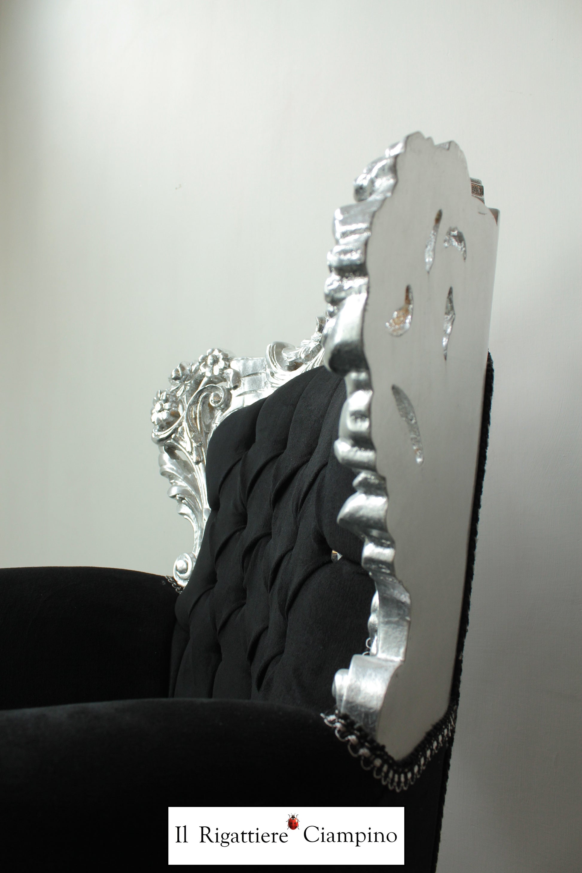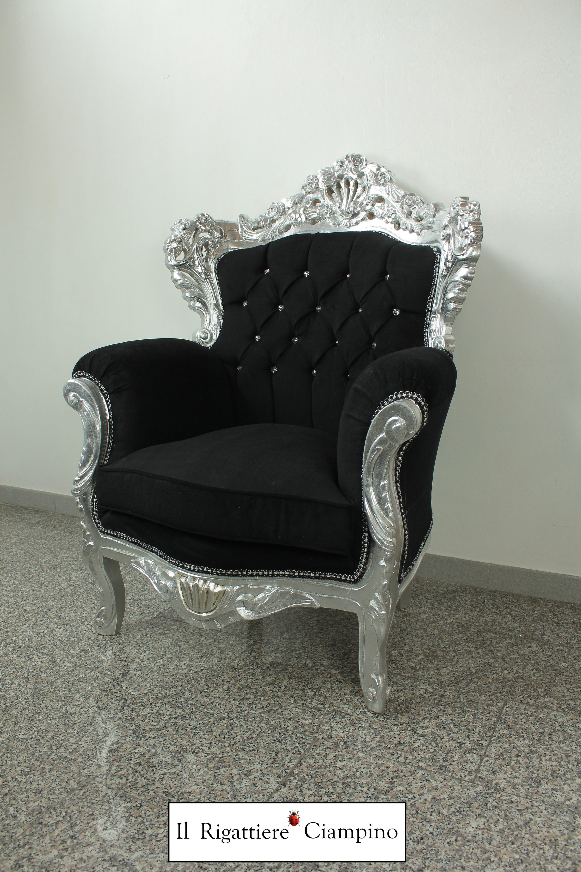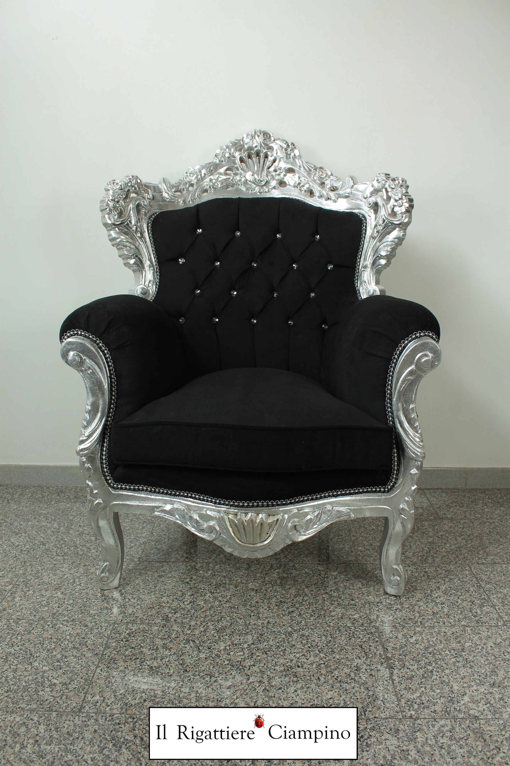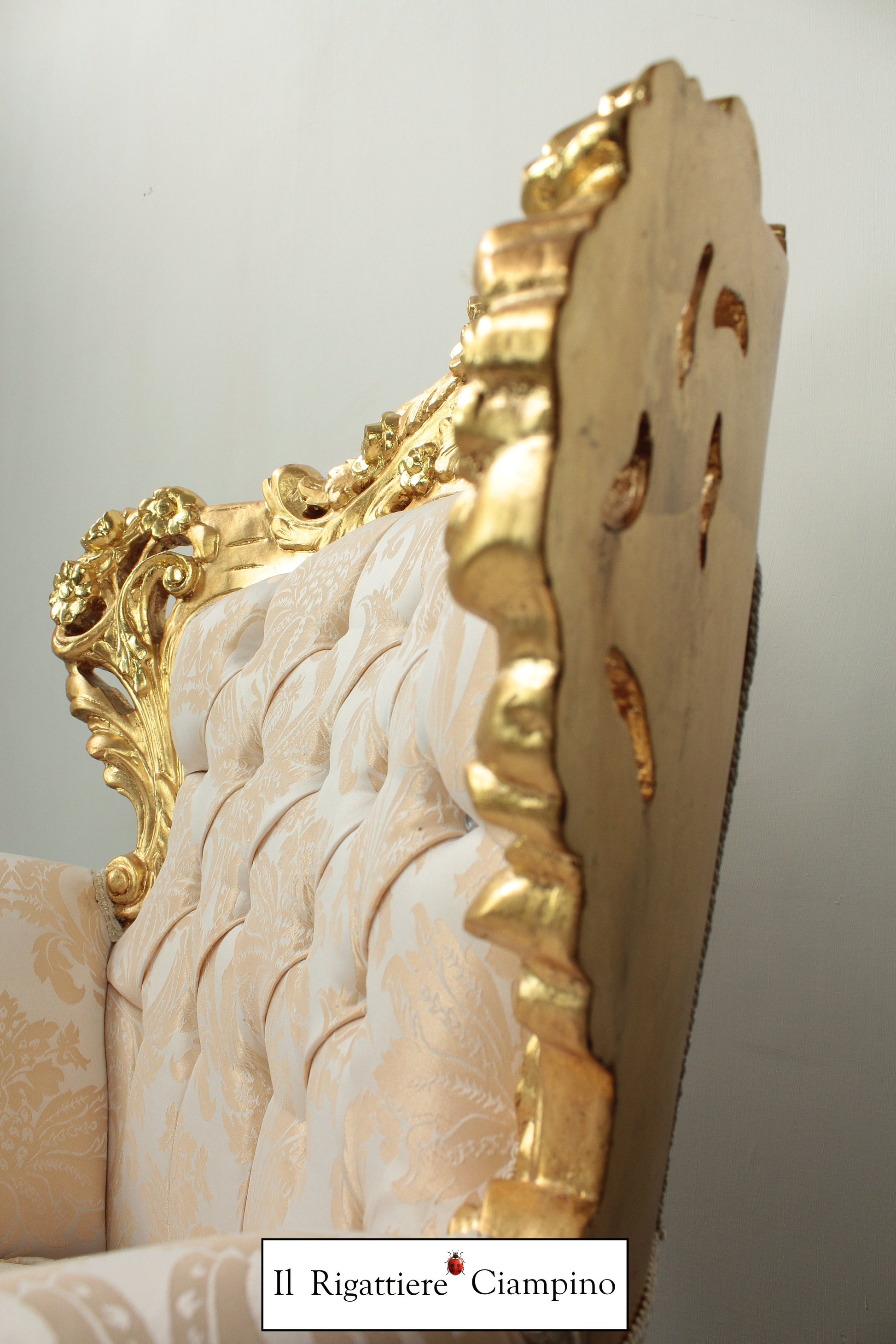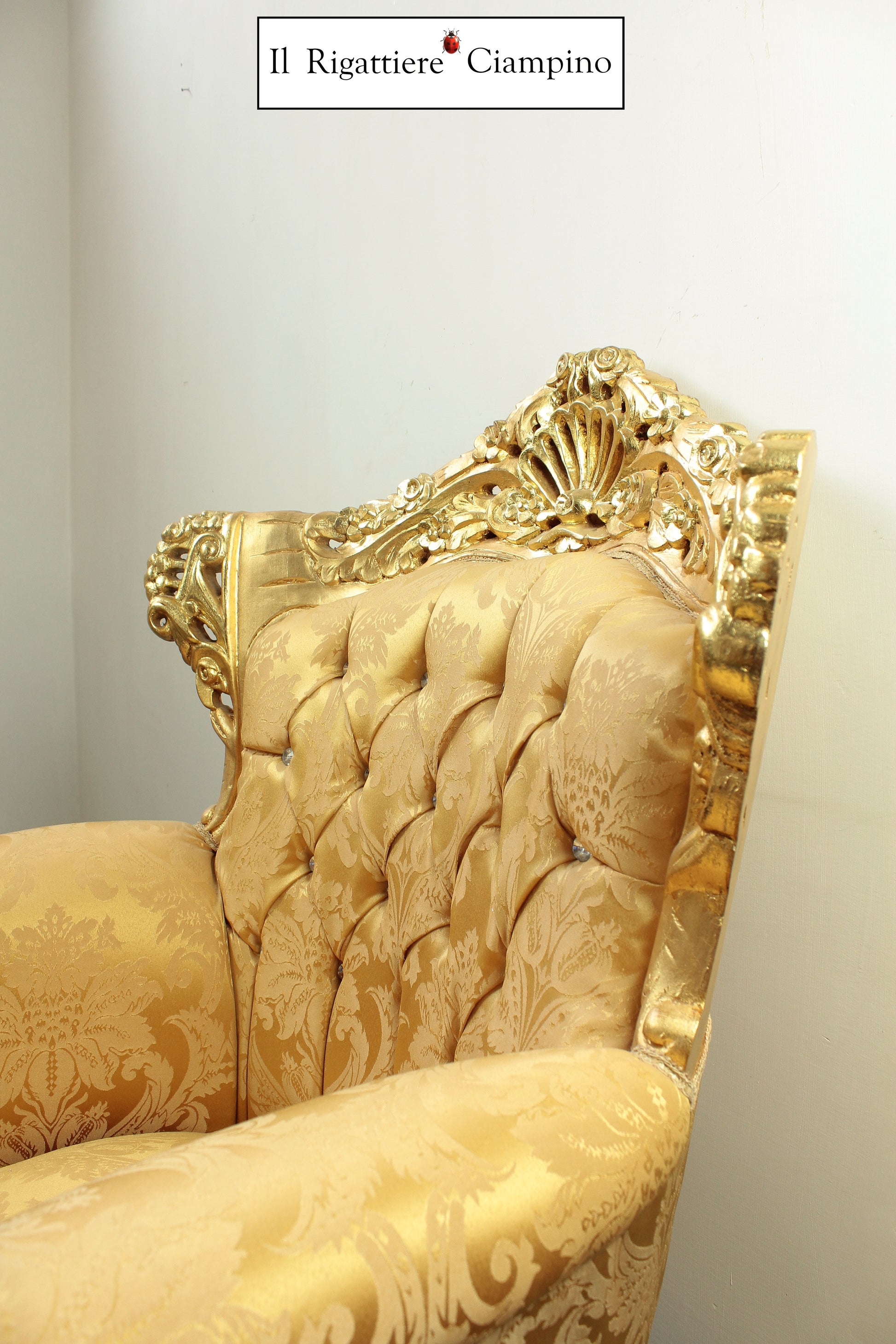 Il Rigattiere Ciampino propone una maestosa poltrona in stile Germany, con struttura in foglia oro, colore e rivestimento a scelta, trapuntato con lavorazione Capitonné, con bottoni Swarovski. Per donare un tocco d'importanza al tuo salotto.