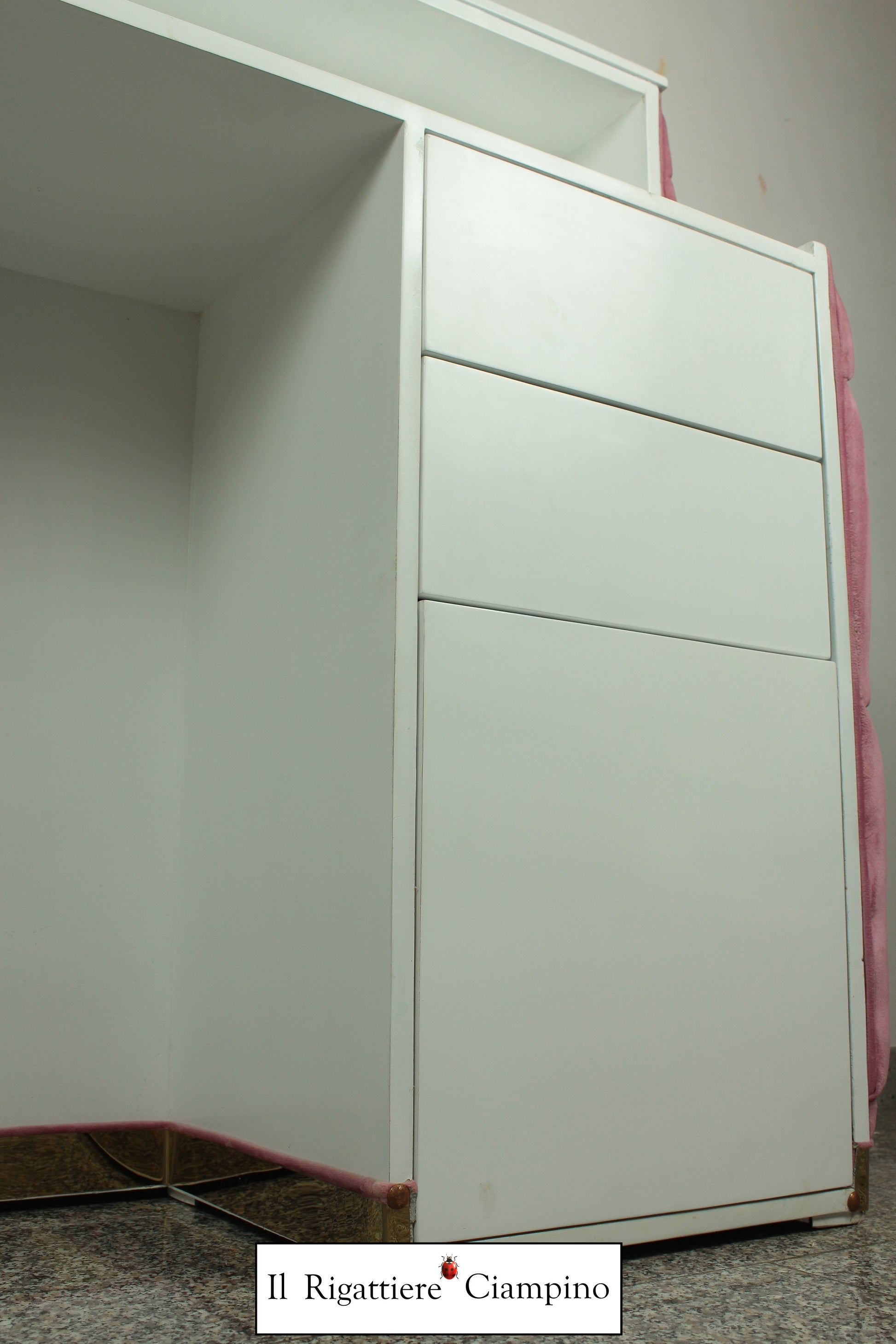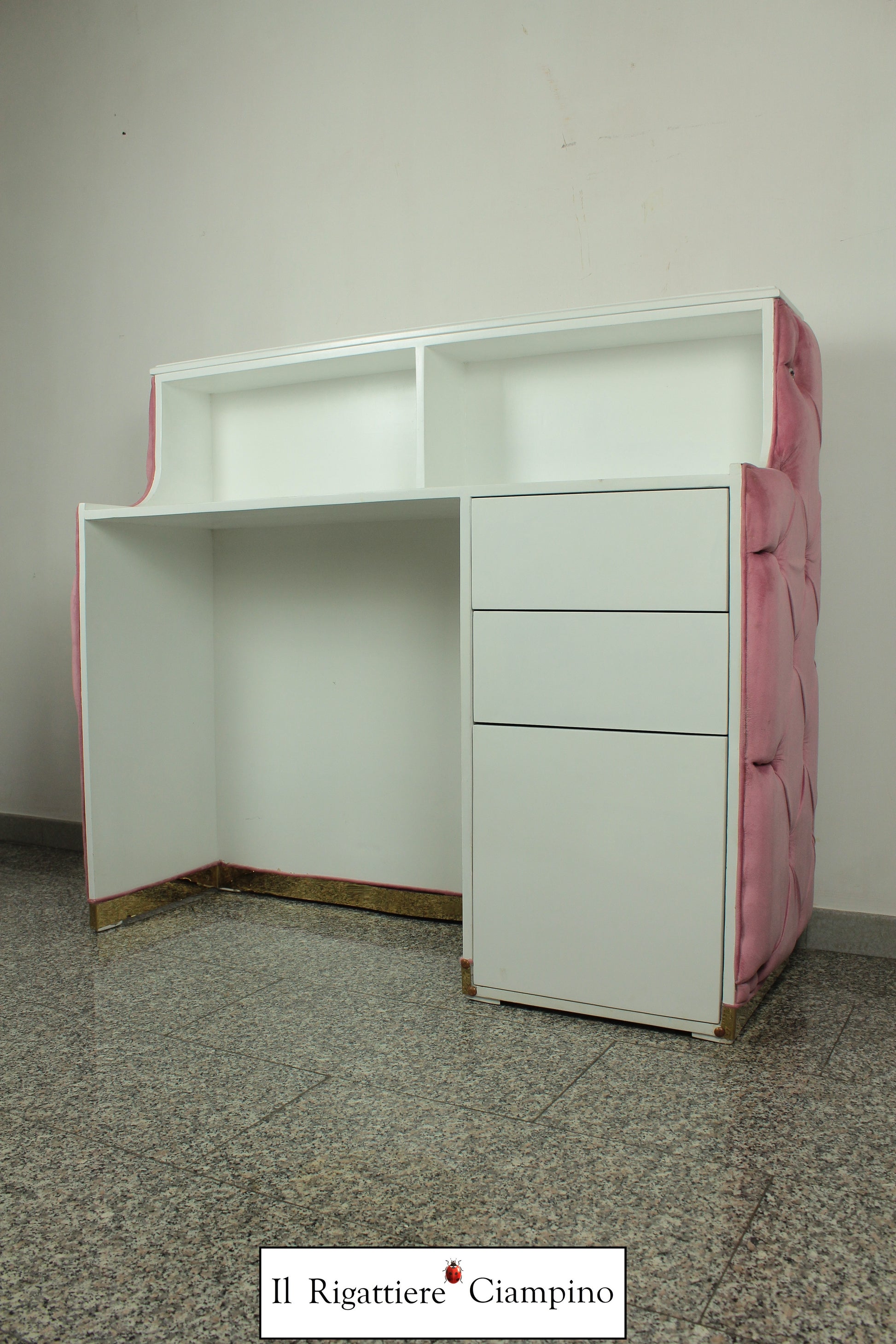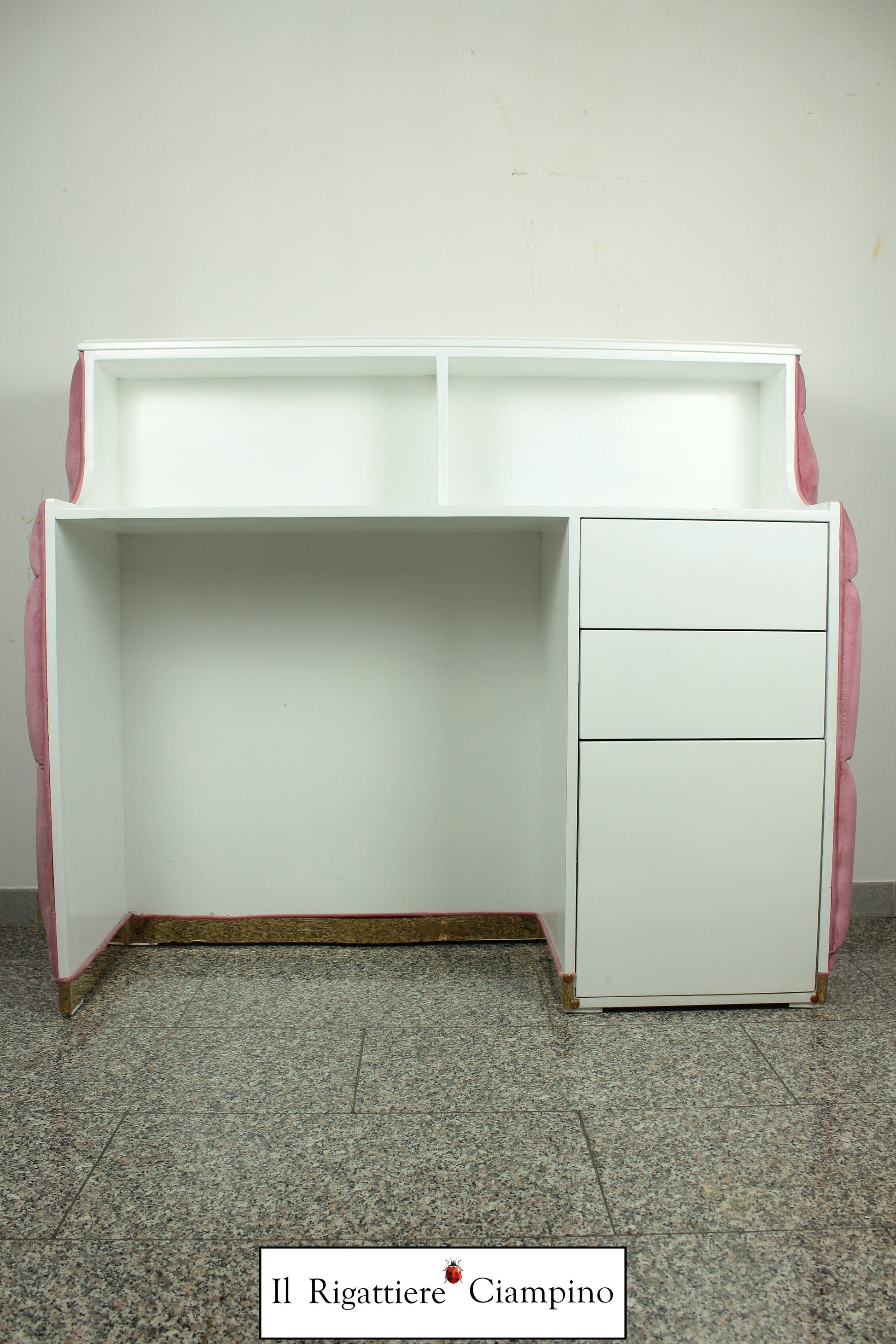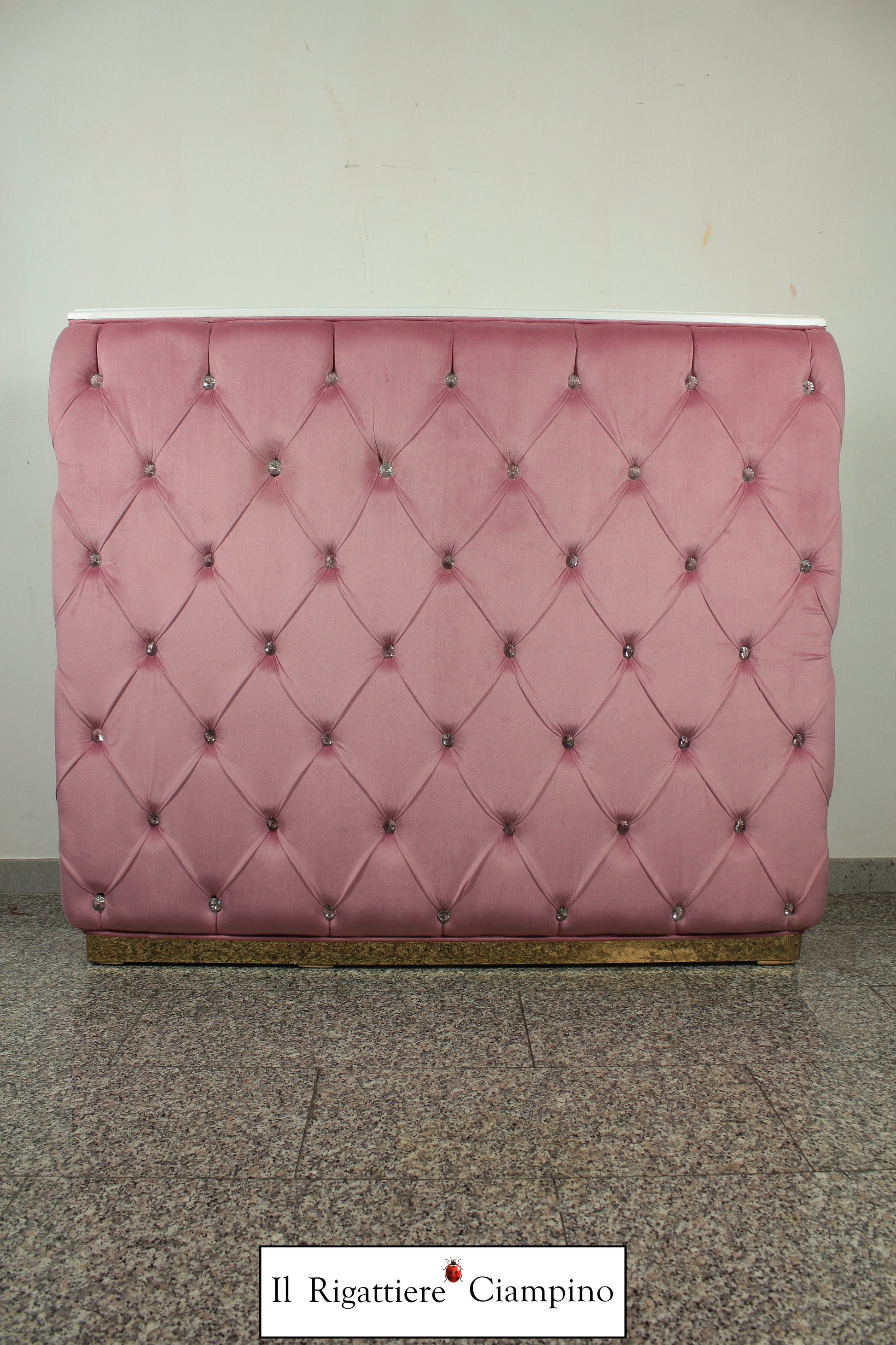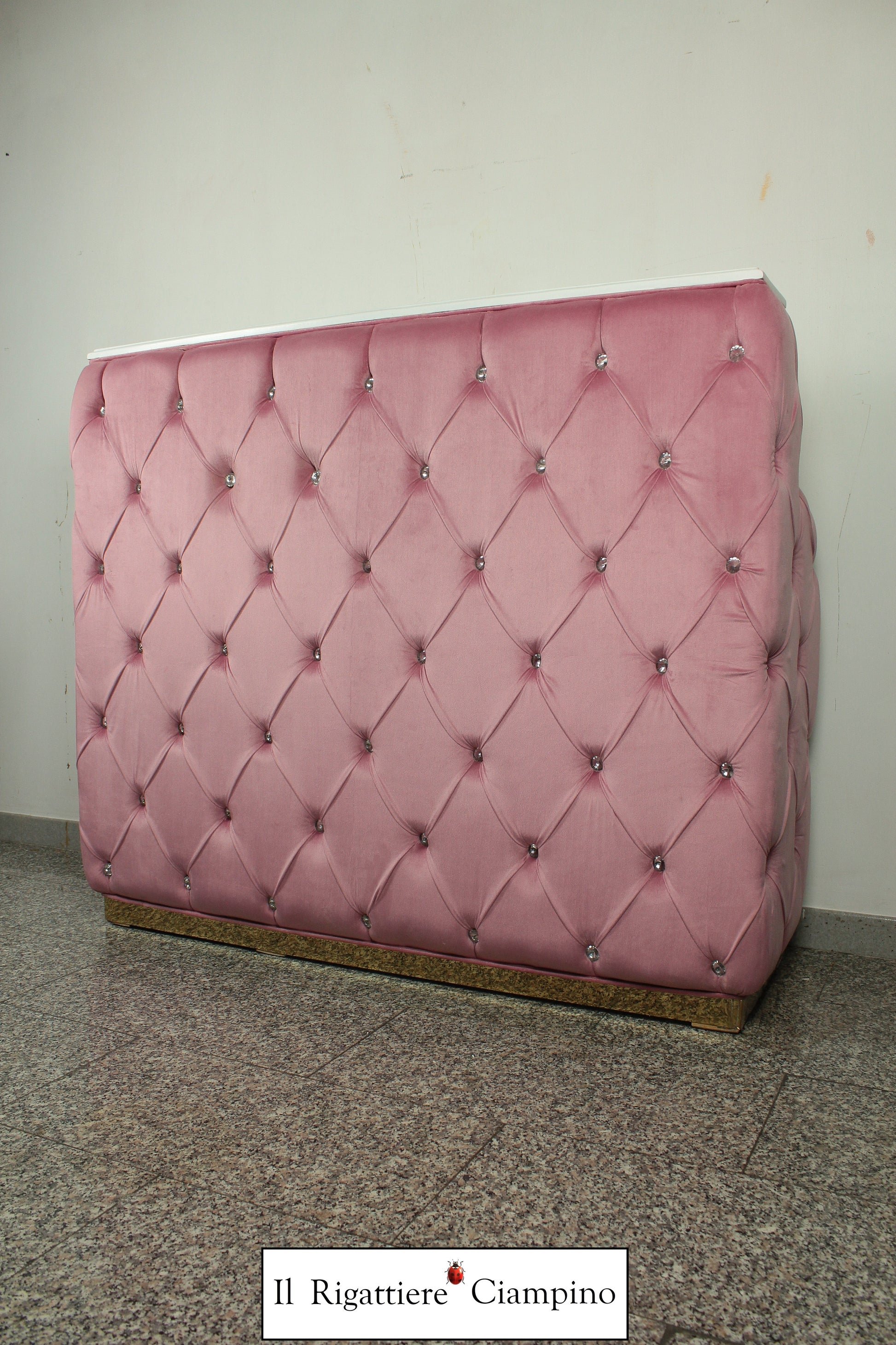 Il Rigattiere Ciampino propone un bancone cassa reception per il tuo negozio! In velluto rosa trapuntato con capitonné su struttura di colore bianco laccato, dona un tocco di luce al tuo ambiente!