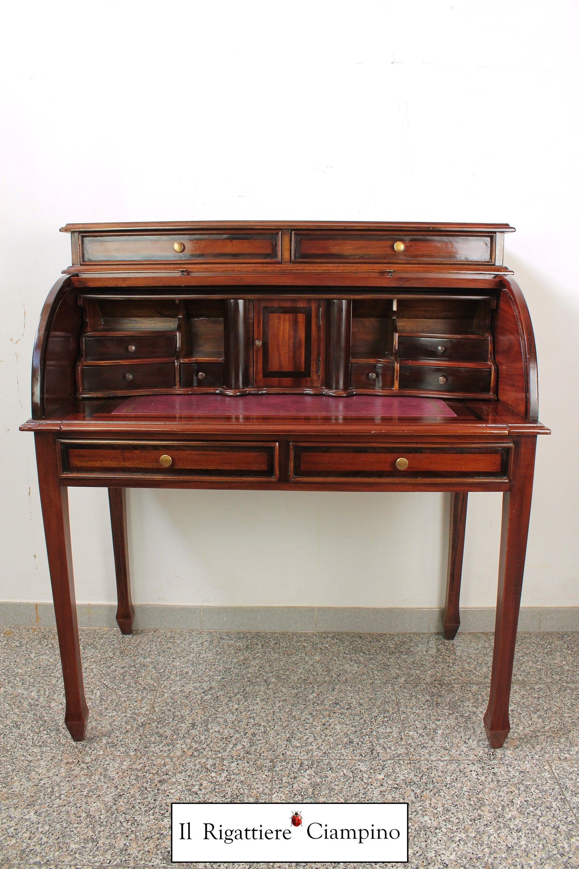 Il Rigattiere Ciampino propone una bellissima ribalta a rullo in legno mogano massello. Con un piano estraibile interno per scrivere, in ecopelle di colore bordeaux, con rifiniture oro. Accessoriato con tendina per chiudere il mobile, e comodi cassetti interni. Ottima per chi ama un po' di privacy per i propri documenti o oggetti.