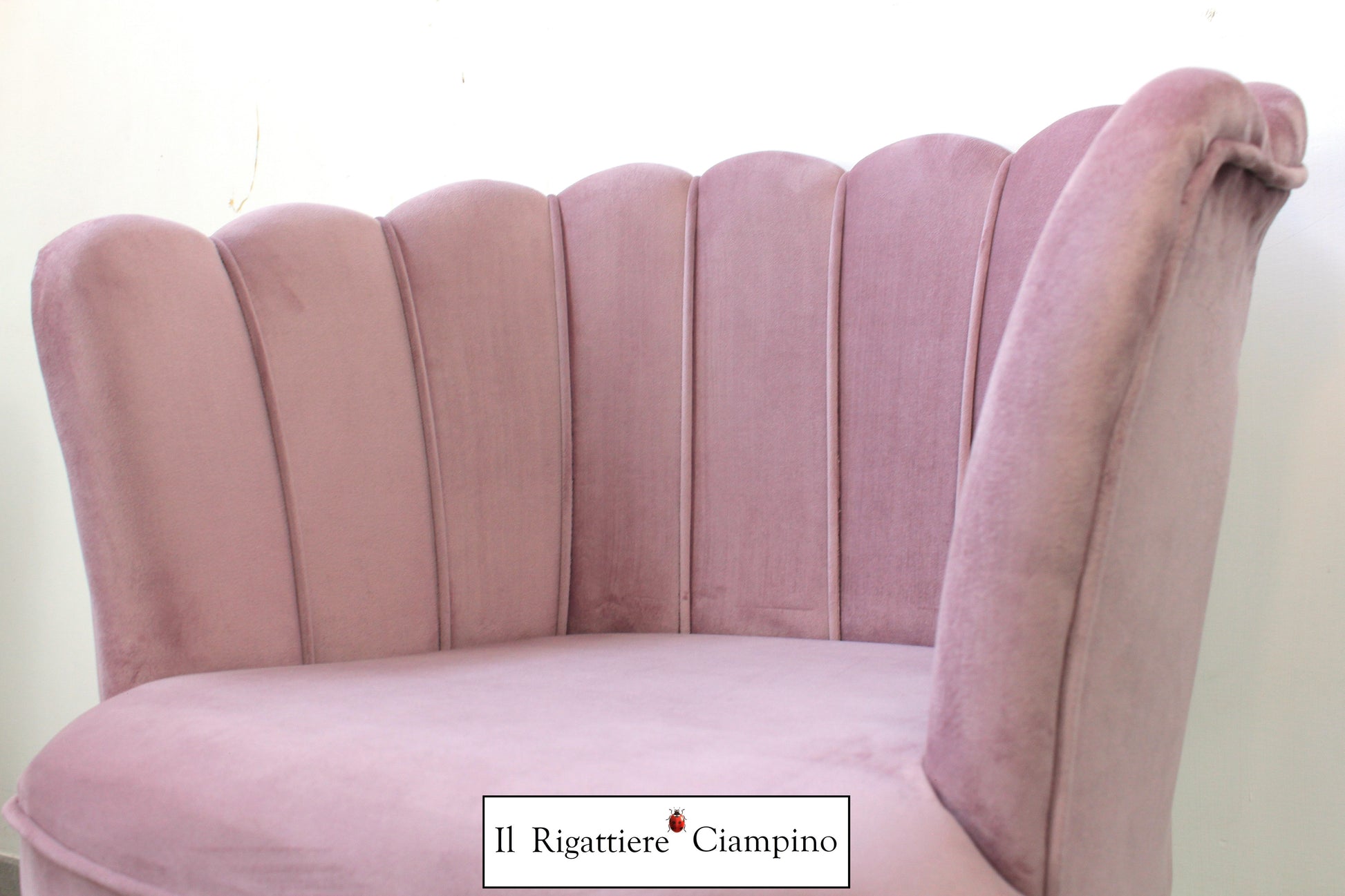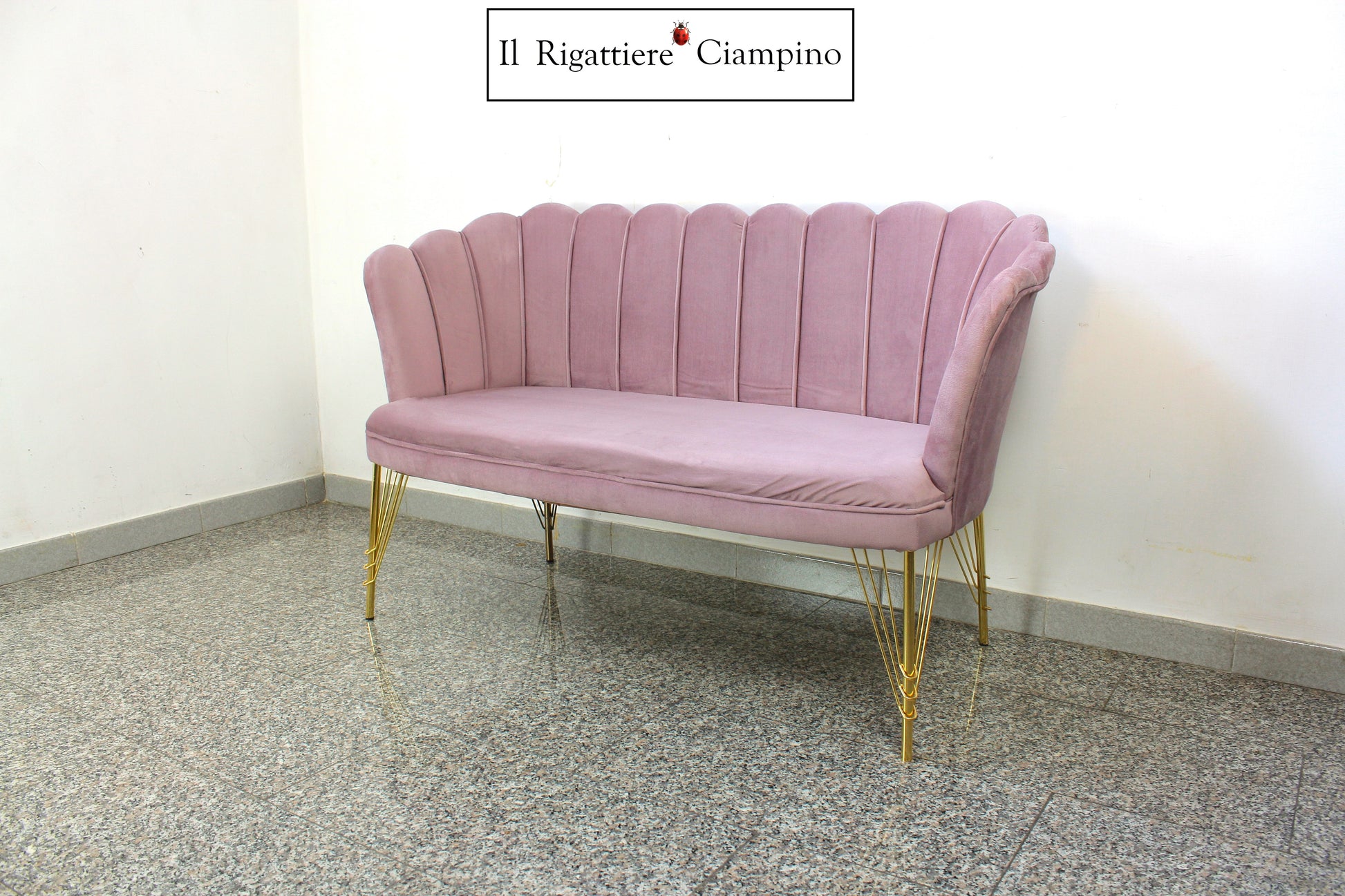 Salottino modello Perla in velluto rosa con gambe in metallo oro