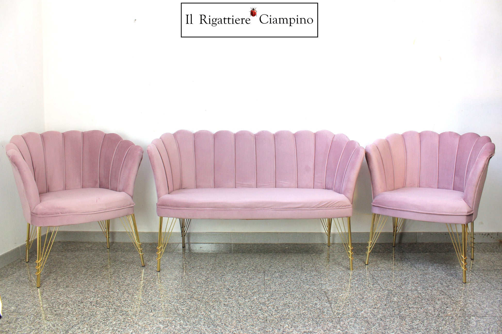 Non perdete l'opportunità di trasformare il vostro spazio in un'oasi di bellezza e raffinatezza con il nostro set salotto in velluto rosa antico e oro.