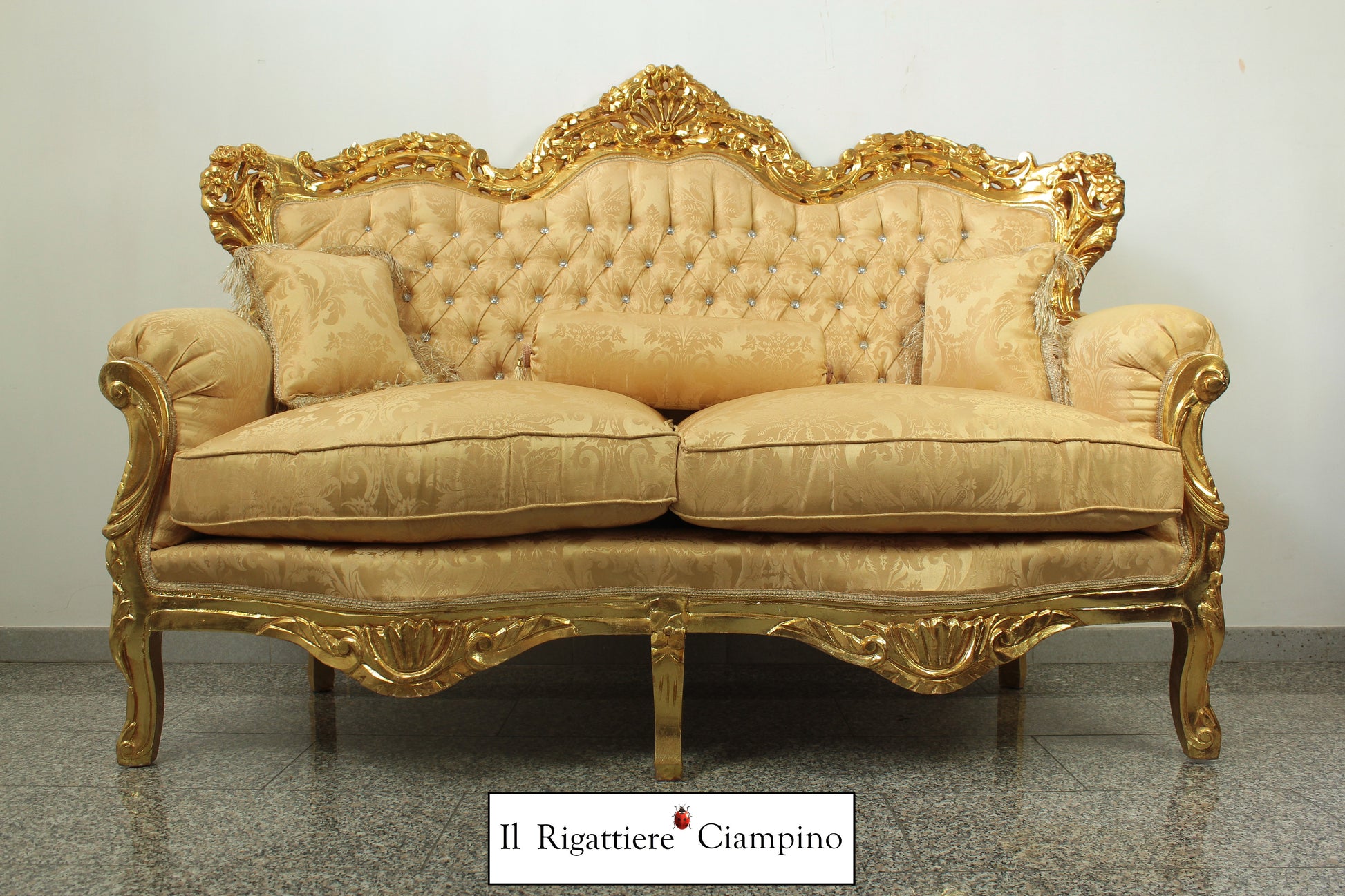 Il Rigattiere Ciampino propone un fantastico salotto in stile barocco di colore oro, rivestito in tessuto damascato dorato, perfetto per chi vuole rendere maestoso il suo ambiente. La struttura dorata è un omaggio all'eleganza intramontabile del periodo barocco, con dettagli artistici e scolpiti che catturano l'attenzione. Il tessuto damascato dorato, con il suo motivo riccamente decorato, aggiunge un tocco di raffinatezza e sofisticazione al salotto.